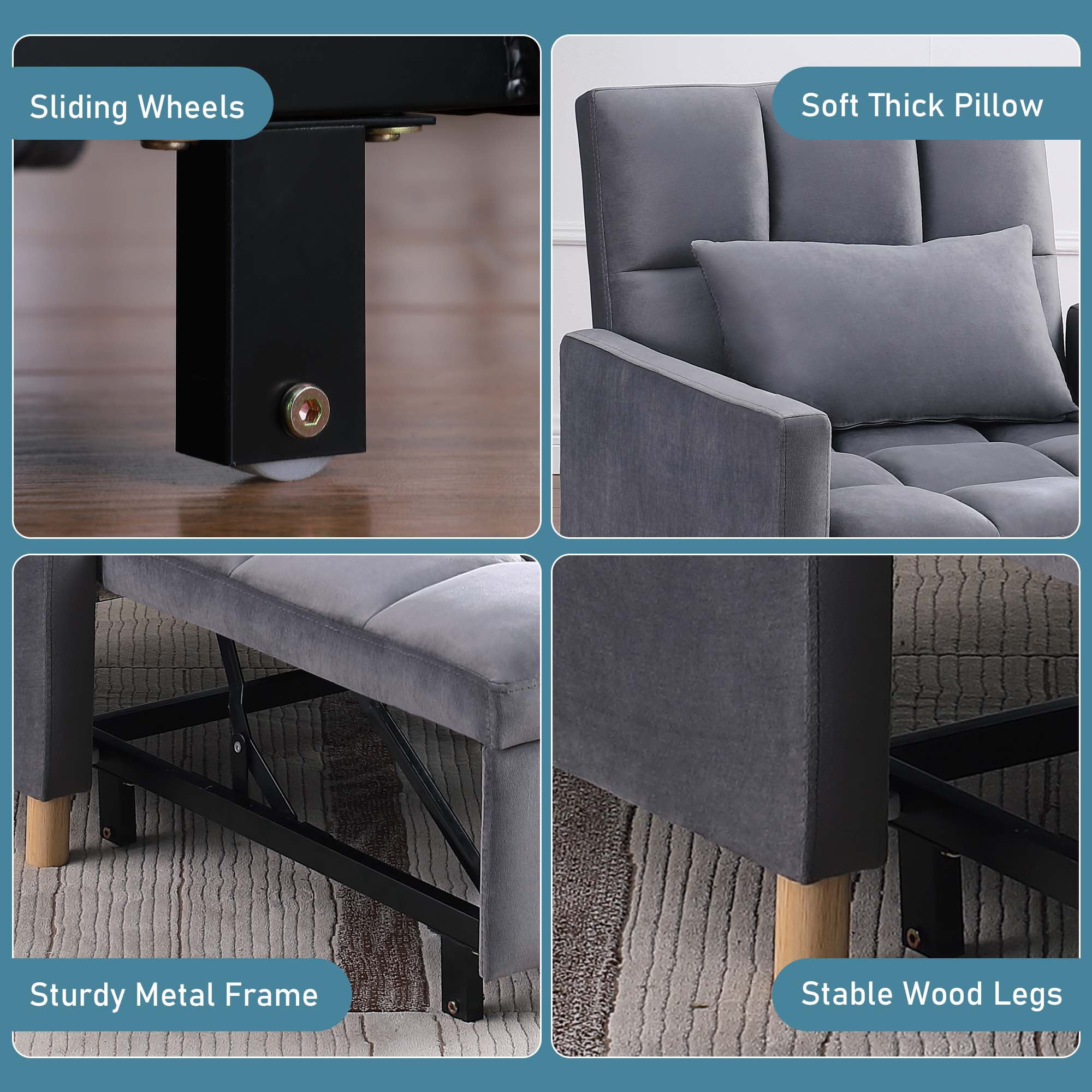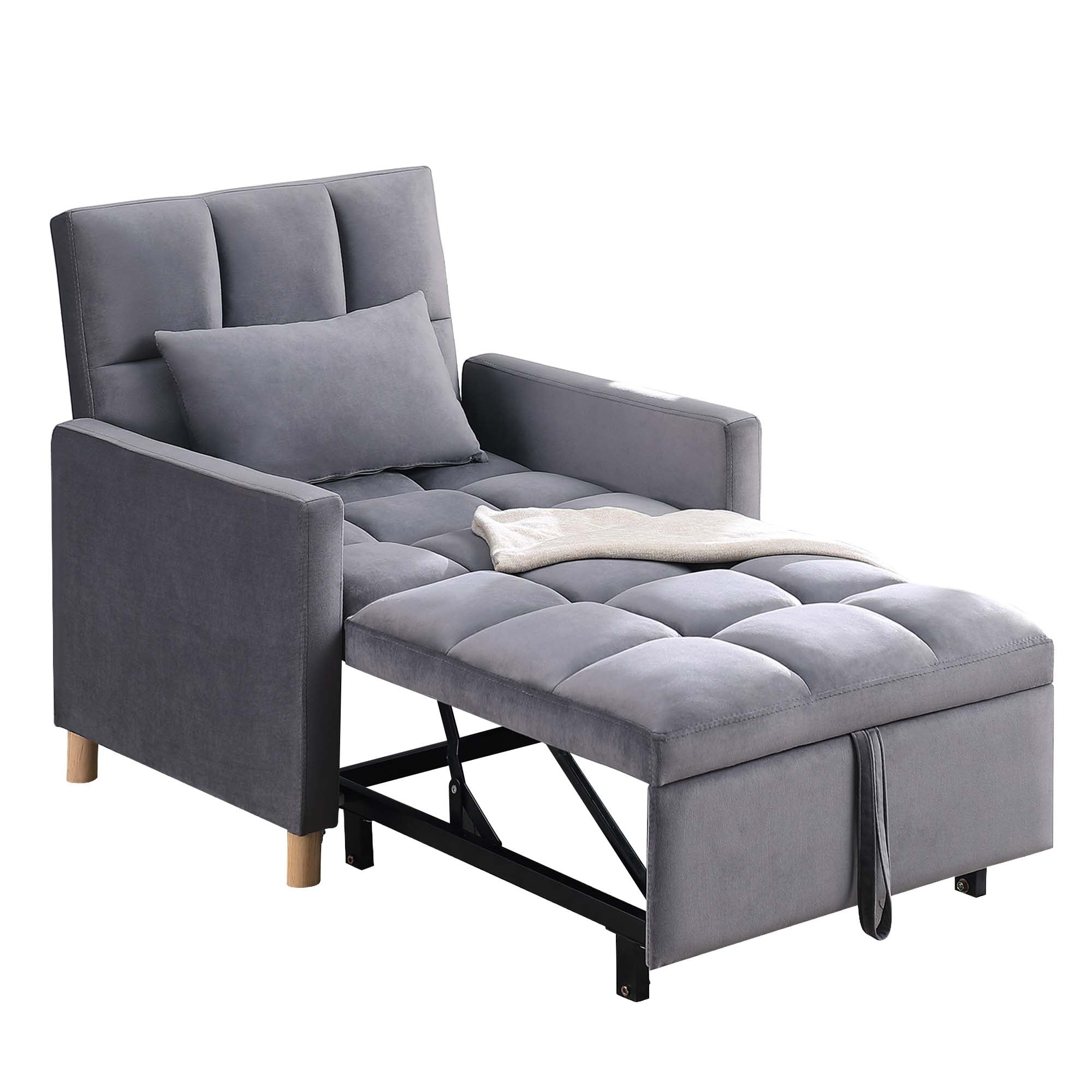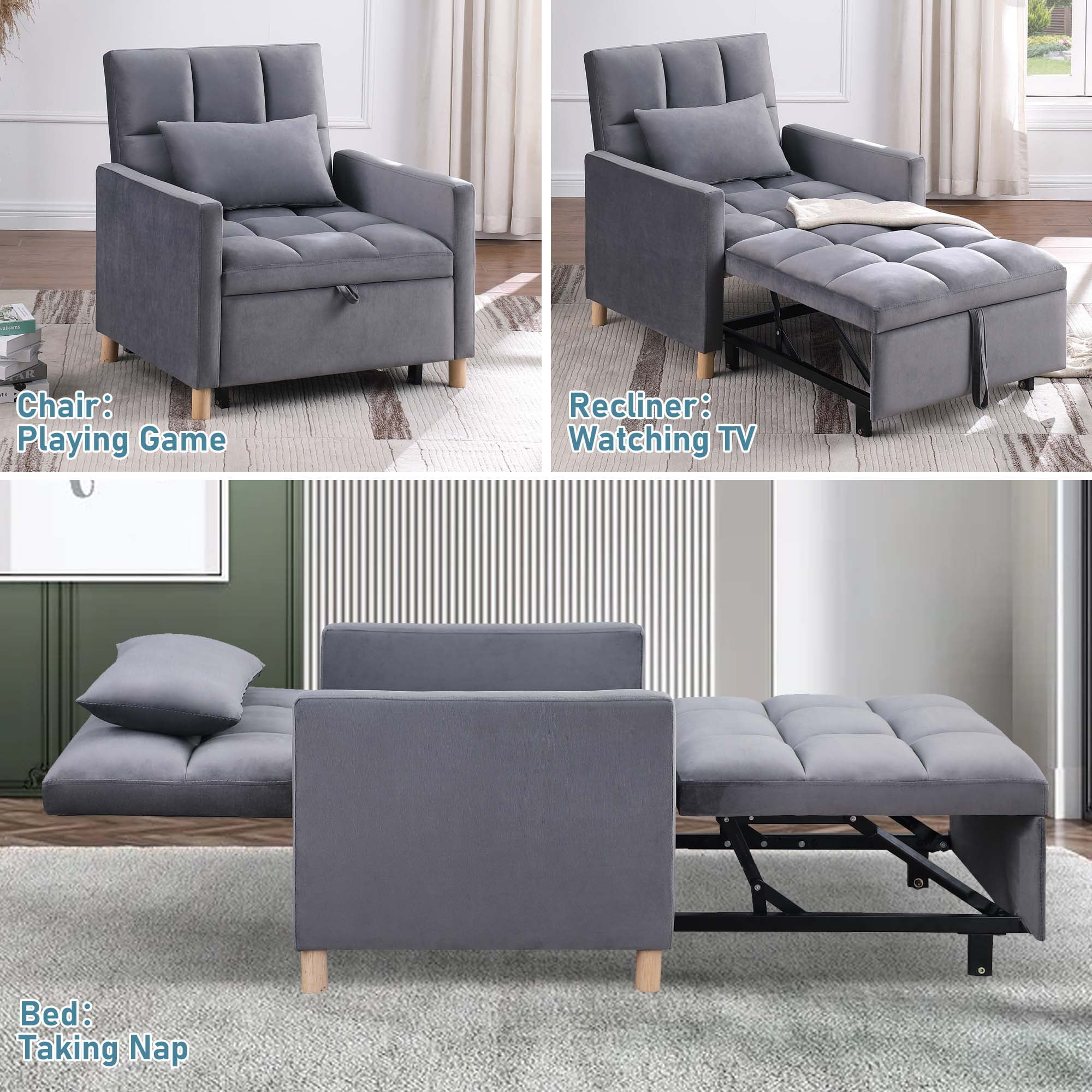 Features 3-IN-1 CONVERTIBLE DESIGN – This versatile sofa chair bed can be easily and quickly converted into an armchair, a guest bed, as well as a recliner which is great for watching TV, reading, or taking a nap. Which is great chair beds for your family. ADJUSTABLE BACKREST – The backrest of the sofa bed is adjustable within 3 reclining angles (105°,143° and 180°) so that you can choose the perfect angle you like to accompany your work, leisure, and relaxation time all day long. You can adapt to different scenarios from different angles, whether you want to be sitting, lounging, or sleeping. More, the sleeper sofa comes with a soft pillow for sleeping or added lumbar support. CONVENIENT DESIGN – Handy strap makes it easy to pull out its leg part with moving wheels to create a bed, making comfortable sitting or lying experience for your body spine line. The serpentine springs in the seat cushion inside which makes the sofa will not deform when sitting for a long time. STURDY FRAME AND SOFT FABRIC -The convertible chair sleeper bed is made of high-quality steel frame, ensuring best durability in daily use and weight capacity 330 lbs. Comfortable velvet fabric and high-density foam upholstery give a soft feeling and excellent support. And 4 widened wood support feet provide great stability. SUITABLE FOR ANY OCCASION – The compact folding design makes the sofa bed perfect for small rooms, like apartments, studios, offices, dorms. No need to worry about not having a place to entertain overnight guests. Sofa dimension: 31.5″ x 26″ x 32.68″(L x W x H), pull-out bed dimension: 69″ x 31.5″ x 16.5″(L x W x H). Please note that color difference may occur between different lights and monitors. Weight & Dimensions Accent Chair Size: 31.5″L x 26″W x 32.68″H Open size – sleeper: 69″L x 31.5″W x 16.5″H Back Cushion: 18”H Seat Width: 26” Seat Depth: 23.6” Seat High: 16” Minimum Door Width: 20” Product Weight: 63.93 lbs Carton Size: 46.46”L x 26.97” W x 12.6”H. 69 lbs Specifications Product Type: Convertible Futon Chair/ Multifunctional Sofa Bed Seating Capacity: 1 Frame Material: Metal, Hardwood Weight Capacity: 330 lb Sleeper Size: Twin Upholstery Material: Velvet Back Type: Tufted Back Storage Included: No Toss Pillows Included: Yes Upholstery Color: Gray Fill Material: Foam Seat Construction: Metal Supplier Intended and Approved Use: Residential Use Leg Material: Wood Leg Color: Natural Position Lock: Yes Cushion Construction: Foam Product Care: Wipe clean with dry cloth Assembly Required: Yes Warranty Length: One Year Package Information 1 x Sofa Chair 1 x Pillows 4 x Wheels 1 x User Manual: AK_AK-HLS0FV1012-K0_PUM_VY-063023