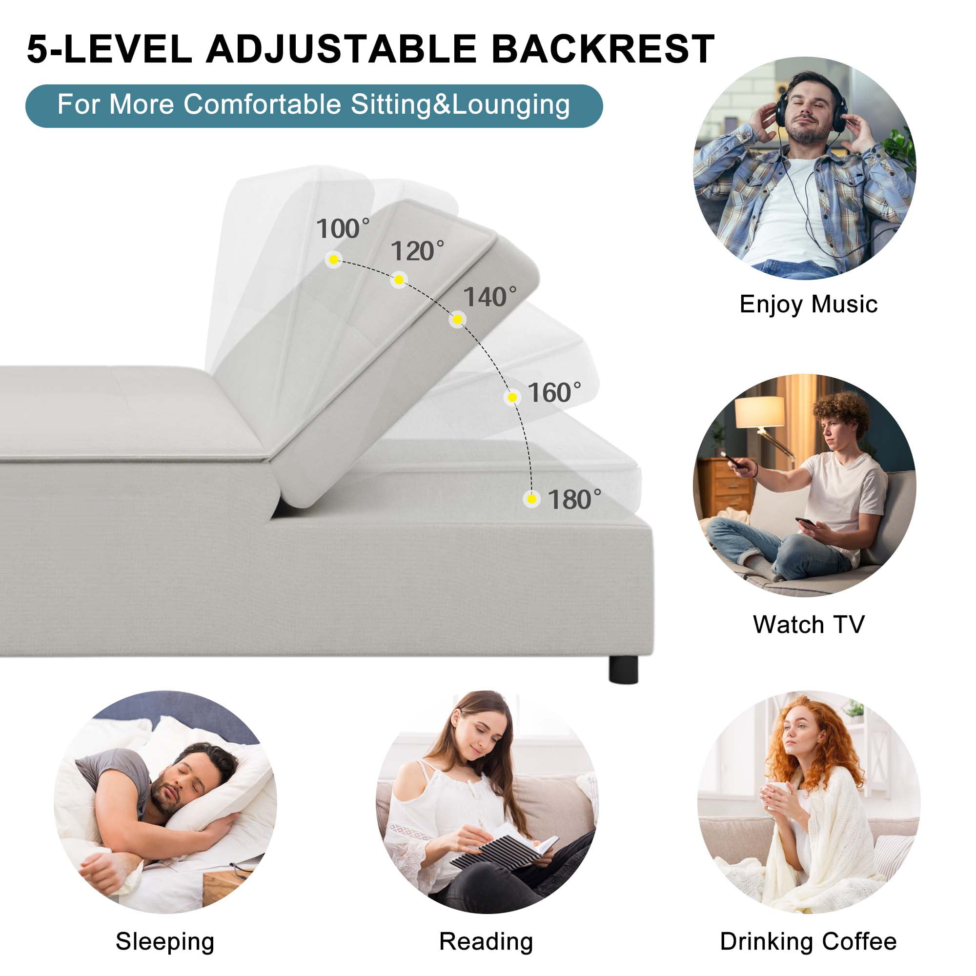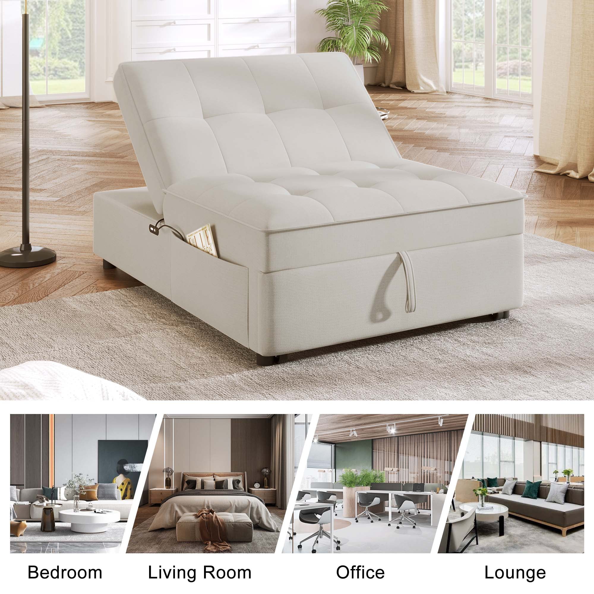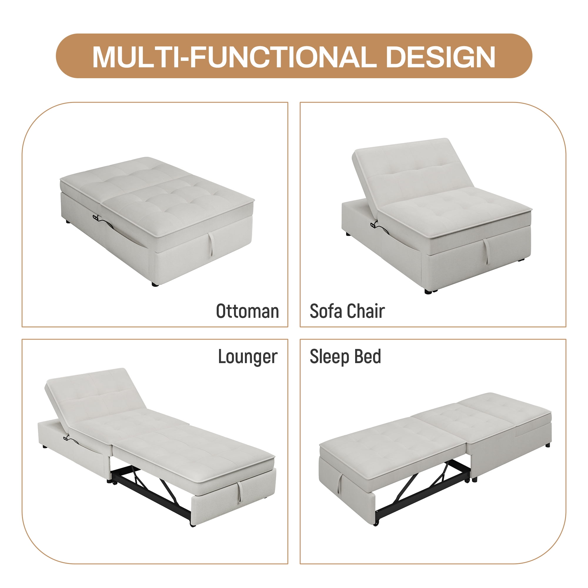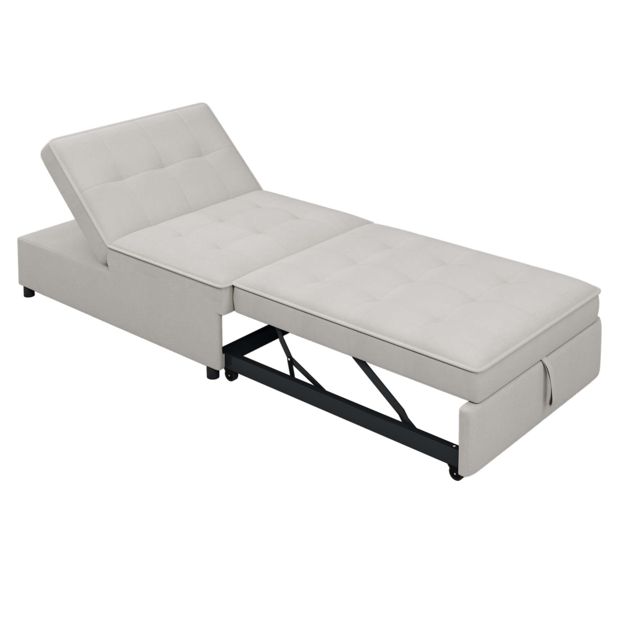 Features CONVERTIBLE CHAIR BED 4-IN-1 – our sleeper chair can be an ottoman, a side sofa chair, a chaise lounge, or a small single bed. Feel free to take a seat, recline, or catch up on sleep. The wheels design and handy strap makes it more convenience. The 5-level adjustable backrest gives enough support for sitting or lying, feeling fully relaxed in every position. ADJUSTABLE BACKREST ANGLES – The backrest of this convertible futon chair has 5 levels of adjustment. Whether reading/playing/sleeping, you can feel comfortable and perfect support. EFFORTLESS CONVERSION – the hidden ottoman with casters can be easily pulled out and form a small single bed. It will allow you to transform your living room into a guest bedroom in minutes. When not used, this pull-out chair will be a lovely addition to your living room taking little space. USB CHARGING PORTS AND SIDE POCKET -There is a USB charging ports on the right armrest of the sofa for various charging cables, which can provide a continuous power supply for your phone. One side pocket for magazines, phones, remotes, glasses. UNCOMPROMISED COMFORT – this sofa bed chair is the ultimate space-saving solution that will allow you to also prioritize the comfort of whoever sits or sleeps on it. The padding is up to 5.7in, offering enough comfort for your guests. RUSTIC LINEN LOOK – The convertible accent chair features breathable linen fabric and high-density sponge with stereo lines. It is full and comfortable, helping you release your entire body from head to feet. Not only is it durable, but it can easily withstand 330lbs. Weight & Dimensions Open size – sleeper: 72.5″L x 26.75″W x 18″H Back Cushion: 16”H Seat Width: 25.5” Seat Depth: 21” Seat High: 18” Minimum Door Width: 20” Product Weight: 72 lbs Specifications Product Type: Convertible Futon Chair/ Multifunctional Sofa Bed Seating Capacity: 1 Frame Material: Metal, Hardwood Weight Capacity: 330 lb Sleeper Size: Twin Upholstery Material: Linen Back Type: Tufted Back Storage Included: No Toss Pillows Included: No Fill Material: Foam Seat Construction: Wood; Spring; Foam Supplier Intended and Approved Use: Residential Use Leg Material: Plastic Leg Color: Black Position Lock: Yes Cushion Construction: Foam Product Care: Wipe clean with dry cloth Assembly Required: Yes Warranty Length: One Year Package Information 1 x Sofa Chair 4 x Wheels 1 x User Manual: AK_AK-HLS0FL2004-K1_PUM_VY-110623 Notes Manual measurement has been used, there may be some reasonable error. All the pictures are taken by actual samples, slight chromatic aberration may occur due to lighting or display.