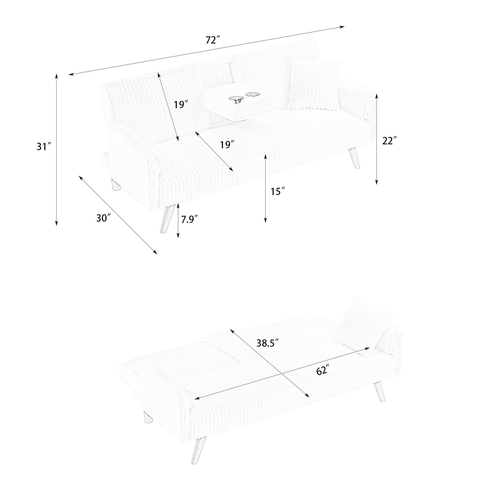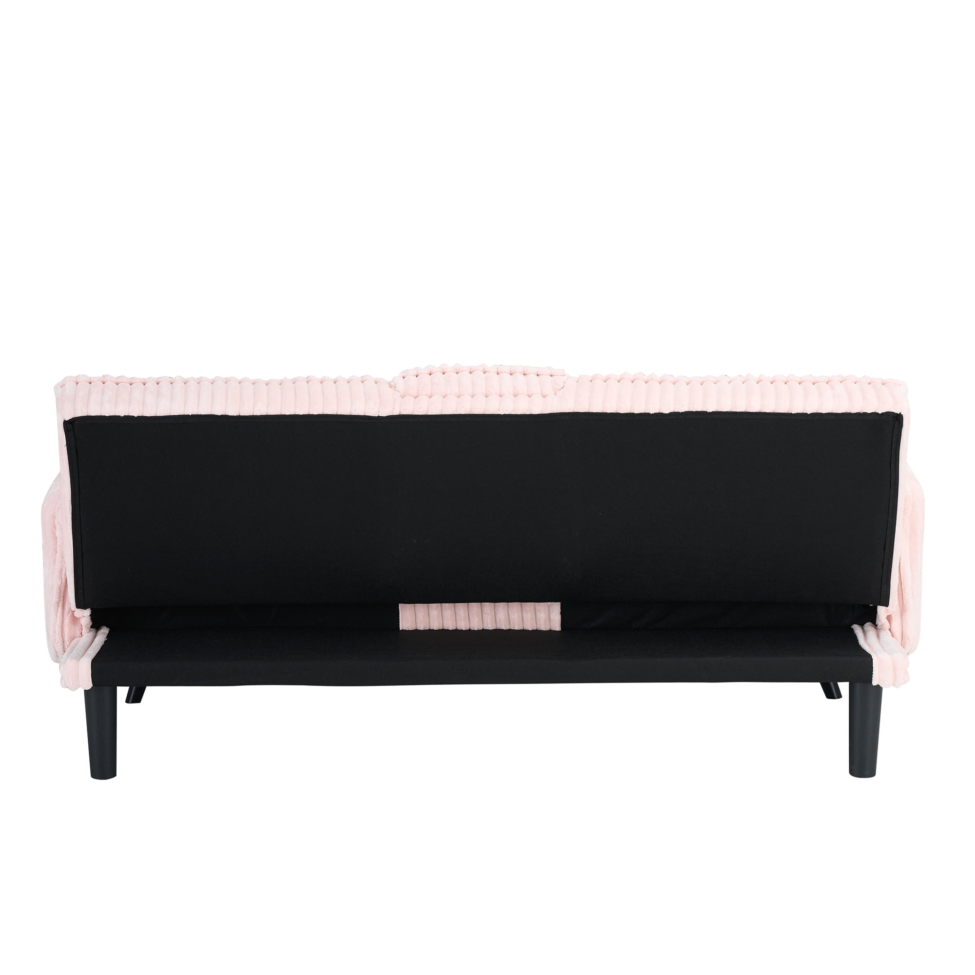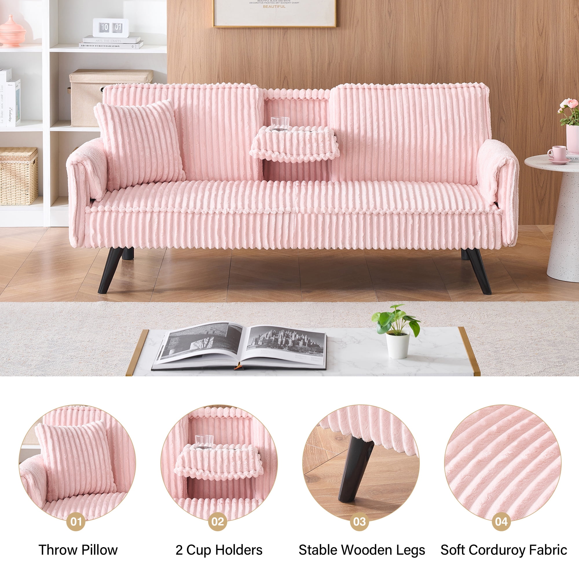 LUXURIOUS COMFORT – Our AK-FF01-038 futon sofa features plush straight-line corduroy upholstery and an extra pillow, providing a touch of elegance and ultimate comfort for your home office or living area. CONVENIENT CUP HOLDER – The built-in cup holder is seamlessly integrated into the backrest, making it easy to keep your beverages close while you relax or work. ELEGANT DESIGN – The minimalist style armrest and straight-line tufted add a sophisticated touch to the sofa bed, enhancing its visual appeal and complementing various décor styles with a classic, refined look. DURABLE MATERIALS – Elevated on metal legs, This futon sofa bed is constructed of a wooden frame, corduroy fabric upholstery, foam fill, and metal zig zag springs for robust structure and unmatched durability. VERSATILE FUNCTIONALITY – Easily convert this futon sofa bed from a stylish sofa to a comfortable bed, perfect for accommodating guests or adding extra sleeping space in any room. SPACE-SAVING SOLUTION – Ideal for smaller spaces, this sleek and functional sofa bed offers a space-saving design without sacrificing style, making it perfect for apartments, offices, or any compact living area. PRODUCT INFORMATION Overall: 72″L x 38.6″W x 31.1″H. Open size – sleeper: 72″L x 38.5″W Back Cushion: 19”H Seat Width: 62” Seat Depth: 19.5” Seat High: 15” Leg High: 7.9” Minimum Door Width: 25” Product Weight: 69.8 lbs Carton Size: 66.9”L x 38.6” W x 6.9”H. 78.5 lbs Product Type: Futon Sofa Bed Seating Capacity: 2 Frame Material: Wood Weight Capacity: 500 lb Sleeper Size: Twin 2 Cup Holders: Yes Upholstery Material: 100% Corduroy Straight-line Tufted: Yes Toss Pillows Included: Yes Upholstery Color: Pink Fill Material: Foam Seat Fill Material: Foam + Sinuous Spring Arm Type: Square arms Supplier Intended and Approved Use: Residential Use Leg Material: Metal-Front Leg; Plastic-Rear support leg Leg Color: Black Back Type: Tufted Back Position Lock: Yes Cushion Construction: Foam Product Care: Wipe clean with dry cloth, do not use strong liquid cleaners Assembly Required: Yes Level of Assembly: Partial Assembly Product Warranty: Yes Full or Limited Warranty: Limited