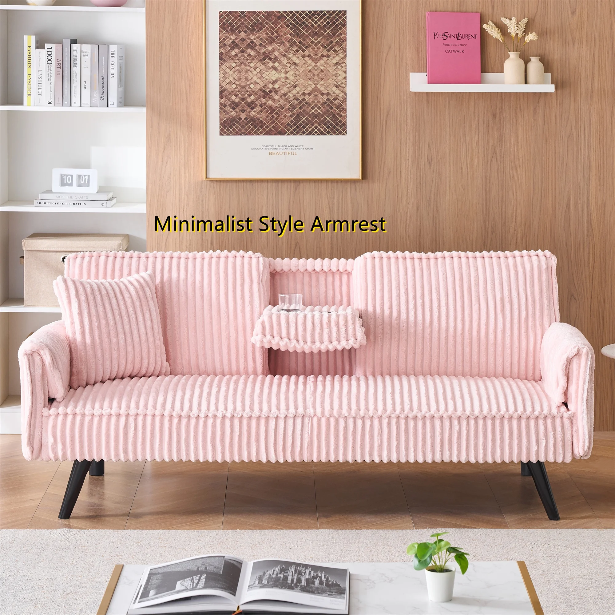 Aukfa Corduroy Futon Convertible Sofa Bed, 2 Cup Holders& Pillow, Straight-line Tufted, Pink
