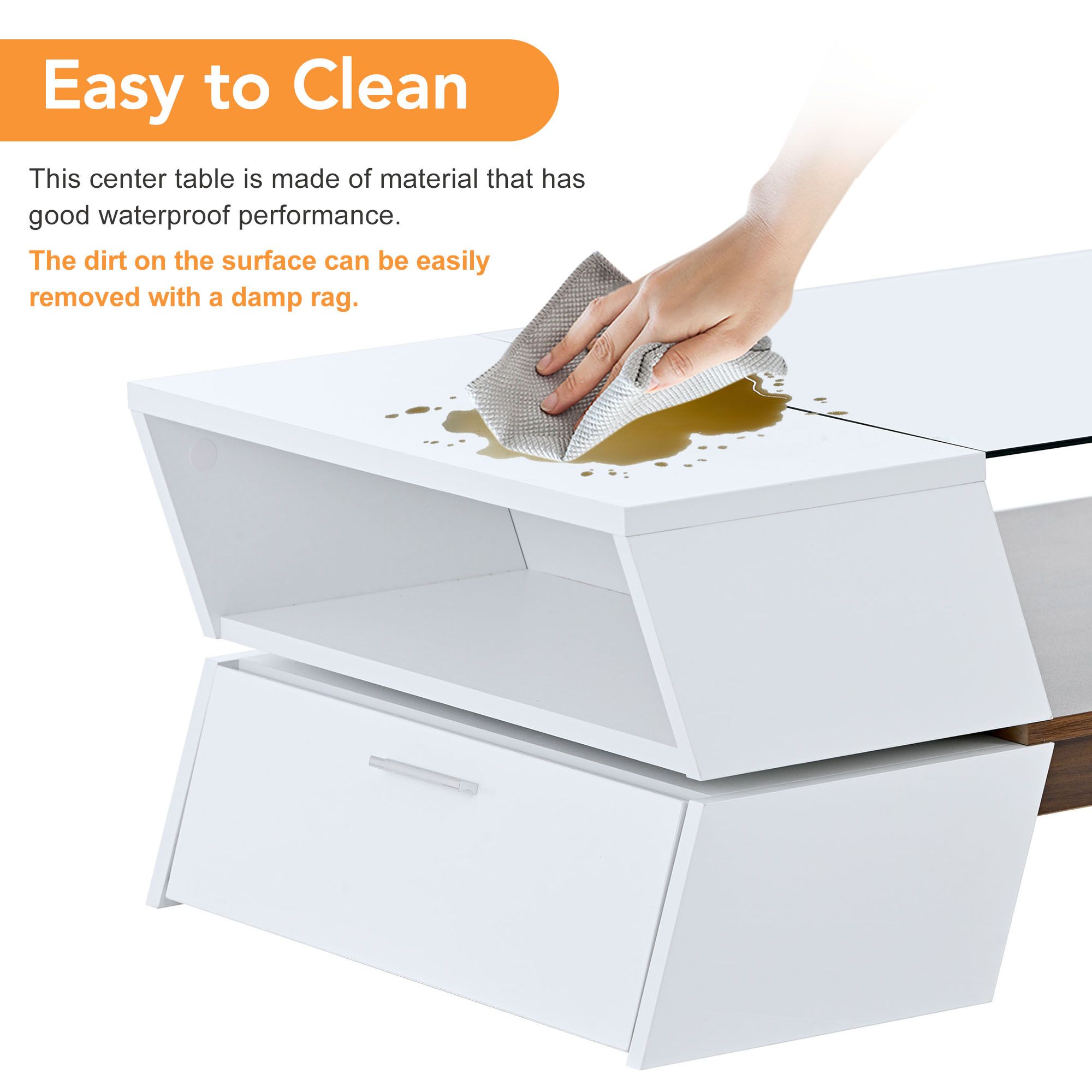 MODERNIST COFFEE TABLE – This AK-FC03-013 coffee table has an ultra-modern style that adds a unique touch to any room. The glass top draws attention to the open shelf in the center of the table, creating an eye-catching display area. PRACTICAL DESIGN – This two-tiered coffee table has a number of storage areas, ideal for magazines and other groceries, to keep your surrounds tidy. HIGH-QUALITY & DURABILITY – To ensure the stability of this glass-top coffee table, the main body is made of engineered wood and the glass top is made of 6mm tempered glass. DIMENSIONS – Overall size: 44.8”Lx22.2”Dx14.9”H. Load-bearing: 143LBS. EASY TO CLEAN – This glass center table has a smooth surface and is very easy to clean. The stains on the table can be wiped off quickly, and a brand new coffee table is instantly available. PRODUCT INFORMATION Overall: 44.8”Lx22.2”Dx14.9”H Cabinet size: 20.9”Lx9”Dx5”H Middle shelf: 19.2”Lx22.2”D Overall Product Weight: 62.26 lb Clearance – Floor to Bottom: 5.5inch Features Product Type: Coffee Table Top Shape: Rectangle Furniture Design: Cabinet/Enclosed storage Top Material: Particle board + Tempered glass Color: White Top Finish Application: UV Veneer Base Color: White Wheels Included: No Number of Tables Included: 1 Plug-In: No Storage Included: Yes Hidden Storage Compartment: Yes Shelves Included: Yes Number of Shelves: 1 Product Care: Wipe clean with a dry cloth, do not use strong liquid cleaner Supplier Intended and Approved Use Residential Use; Non Residential Use Table top Weight Capacity: 22LBS Side cabinet Weight Capacity: 22LBS Middle shelf Weight Capacity: 33LBS Assembly Assembly Required: Yes Level of Assembly: Full Assembly Needed Installation Required: Yes Installation Hardware Included: Yes Warranty Commercial Warranty: Yes Product Warranty: Yes Warranty Length: One Year Full or Limited Warranty: Full PACKAGE INFORMATION: 1 x Coffee Table 1 x User Manual:AK_AK-HLA4WPB013-W0_PUM_JZ-032423