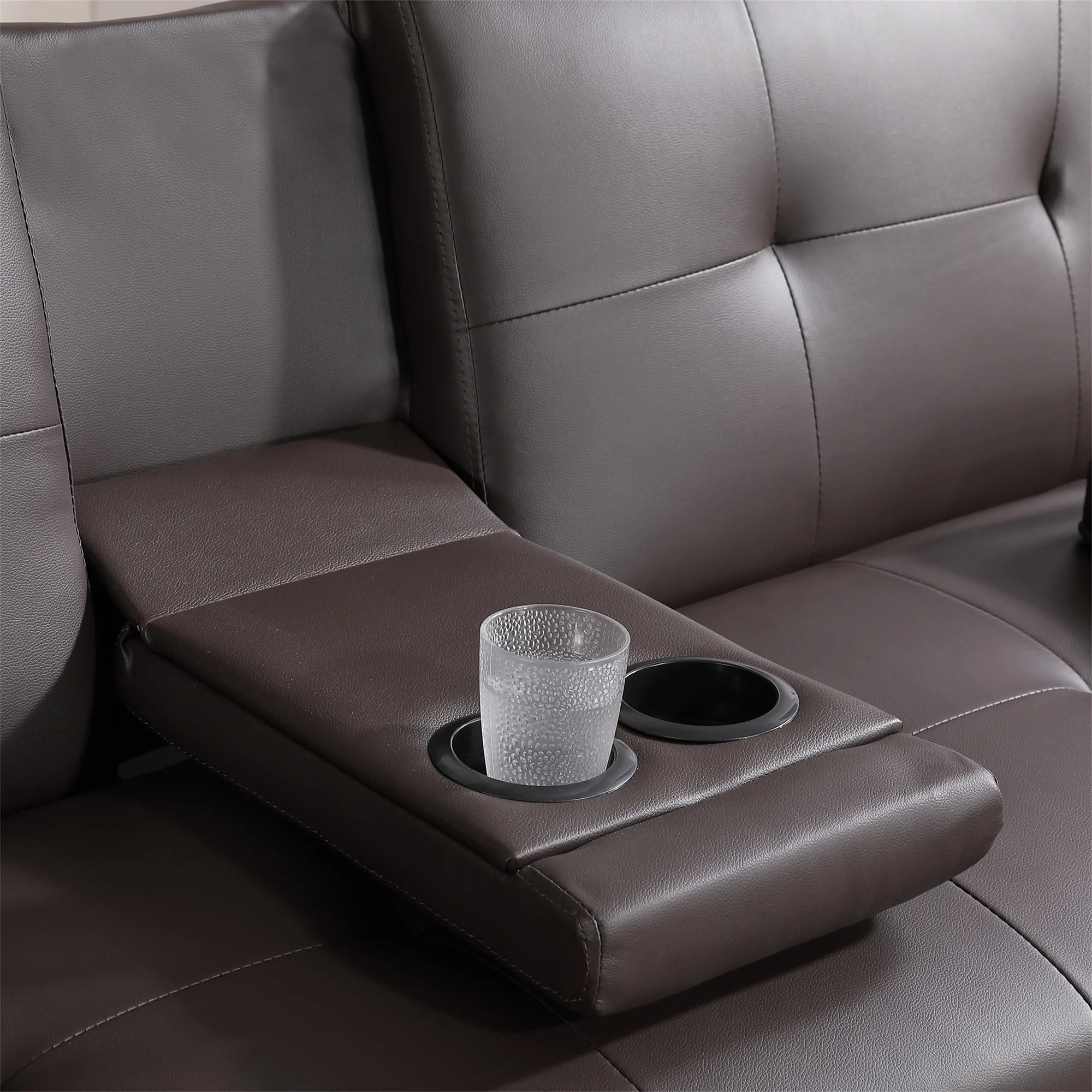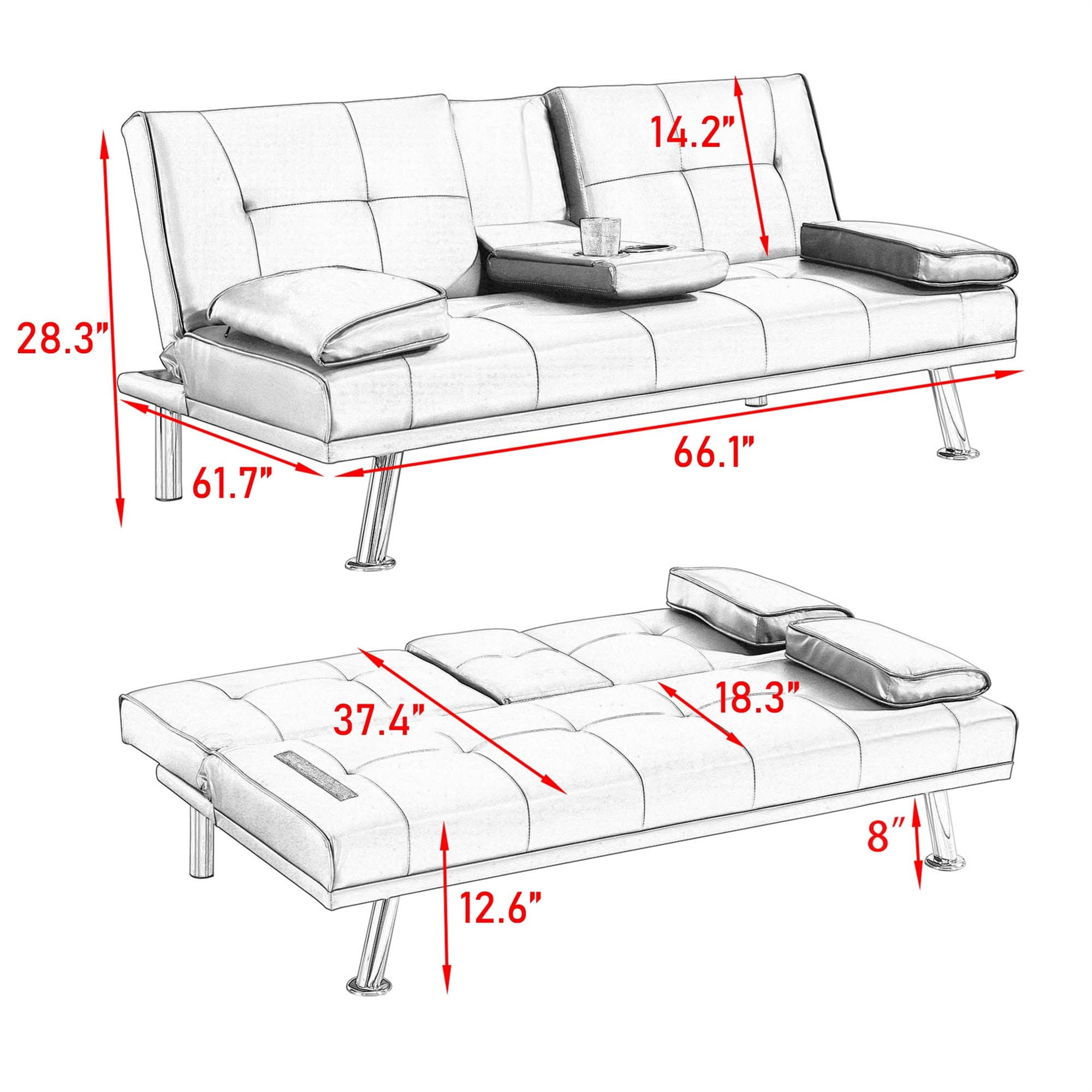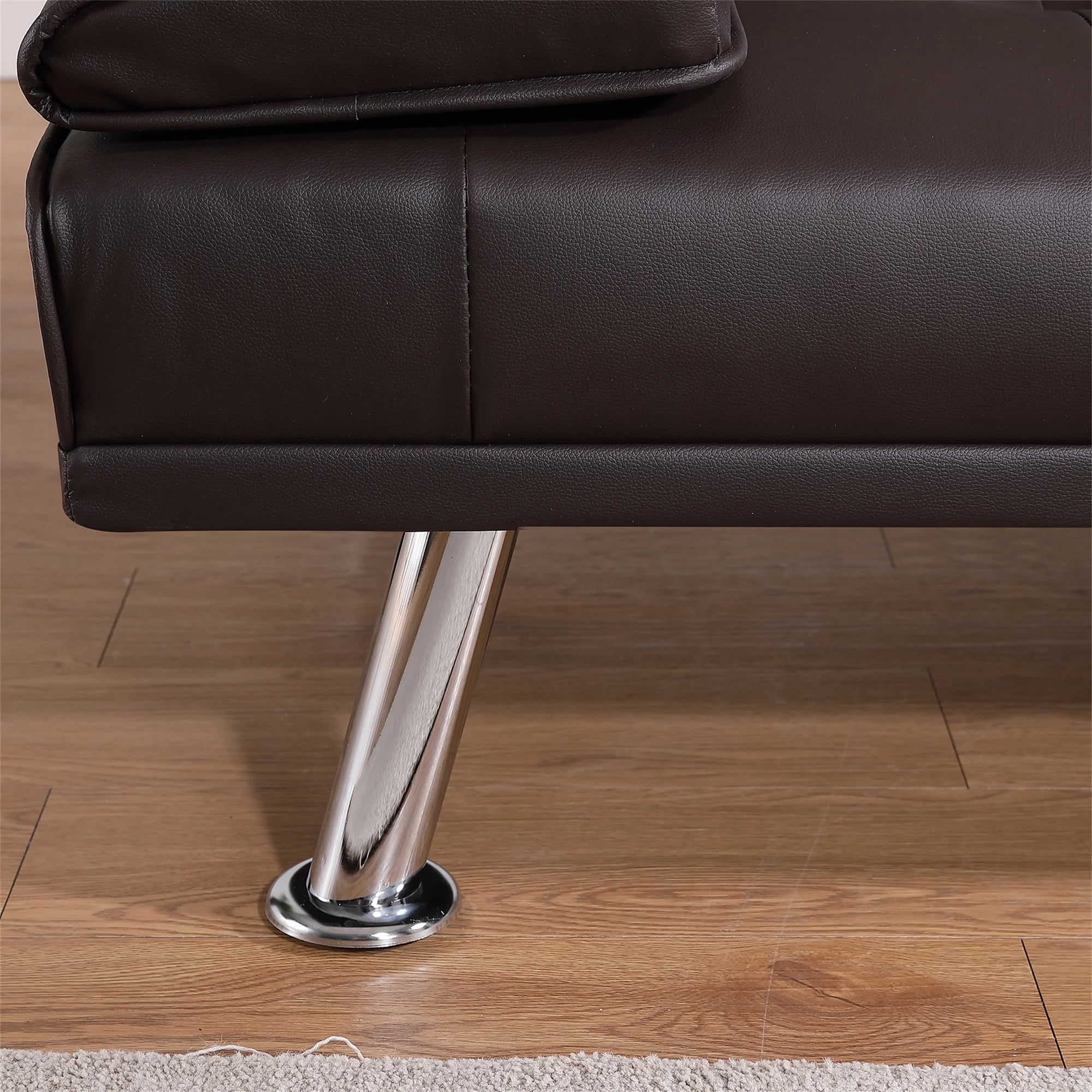 CONVERTIBLE SOFA BED – This Aukfa AK-FF01-082 futon sofa bed features a folding contraption to lock the back at 105 degrees for reading/TV or 140 degrees for lounging and lay down the back as a 66″ long by 37.5″ wide twin size bed. FUTON WITH HIDDEN CUP HOLDER – Folding middle armrest with 2 cup holders in the middle of the sofa allows you and your family and friends to enjoy drinks while relaxing. It can make it more convenient for you and your family to drink while watching a sports game. COMFY MATERIAL – The eye-catching solid-hued leather fabric highlights the charming face of this sofa, with excellent touch, and high-quality foam cushions, while the tufted back enhances the design and the armrest can be removed and placed on the other side when sleeping. MODERN STYLE AND VERSATILITY – This futon sofa bed is designed with a fashionable appearance and modern style, perfect for an apartment, home living room, studio, study room, game room, and guest room. EASY ASSEMBLE – All parts and instructions are smartly packed into one box and require only one person to assemble. Takes less than 15 minutes to assemble and easy to move around the house. SPECIFICATION: PRODUCT INFORMATION Overall: 67″L x 31″ W x 33″H. Open size – sleeper: 67″L x 39″W x 15″H Back Cushion: 17”H Seat Width: 67” Seat Depth: 19” Seat High: 15” Leg High: 8” Minimum Door Width: 31” Product Weight: 59 lbs Cross Weight: 64 lbs Carton Size: 67”L x 39” W x 10.2”H Features Product Type: Futon Sofa Seating Capacity: 2 Detachable Mattress Included: No Frame Material: Solid Wood Weight Capacity: 600 lb Sleeper Size: Twin Upholstery Material: Leather Upholstery Color: Brown Fill Material: Foam Seat Construction: Solid Wood Supplier Intended and Approved Use: Residential Use Leg Material: Metal Leg Color: Silver Back Type: Tufted Back Arm Type: Pillow Arm Product Care: Dust regularly. Clean gently with a clean, slightly damp cloth. Professional cleaning is recommended. Avoid direct sunlight. Never apply or clean with harsh chemicals. Assembly Level of Assembly: Partial Assembly Adult Assembly Required: Yes Suggested Number of People for Assembly/Install: 1 Additional Tools Required (Not Included): All Tools Included Warranty Commercial Warranty: No Product Warranty: Yes Full or Limited Warranty: Limited Warranty Length: One Year