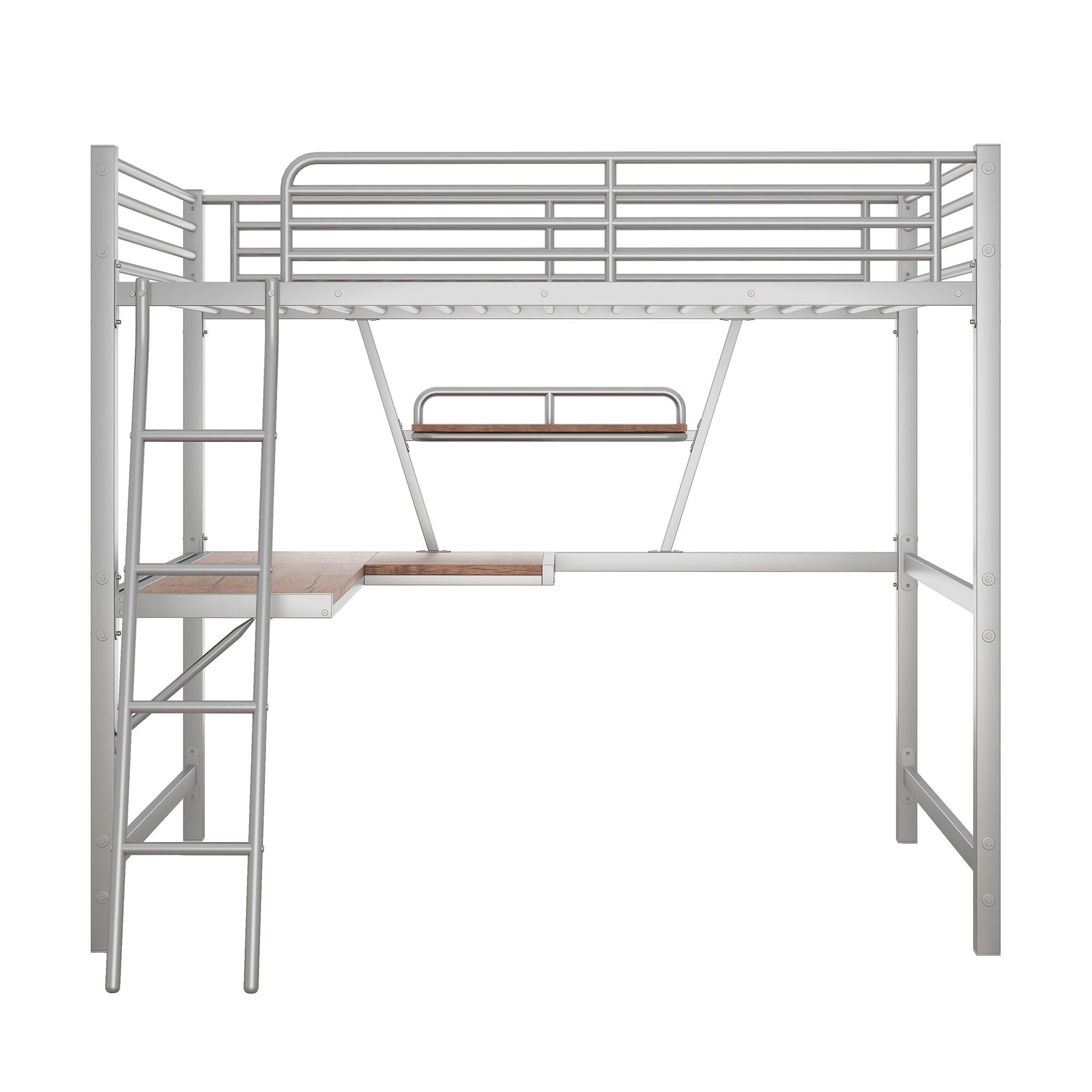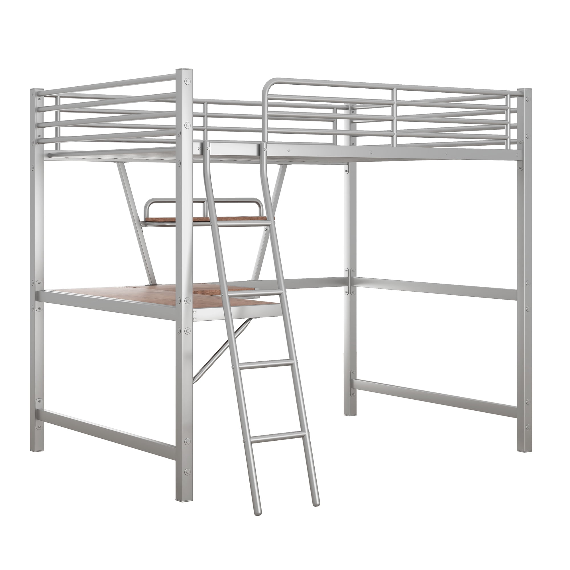 Aukfa Metal Full Size Loft Bed with Built-in Desk and Shelf for Dormitory Teens Adults – Silver
