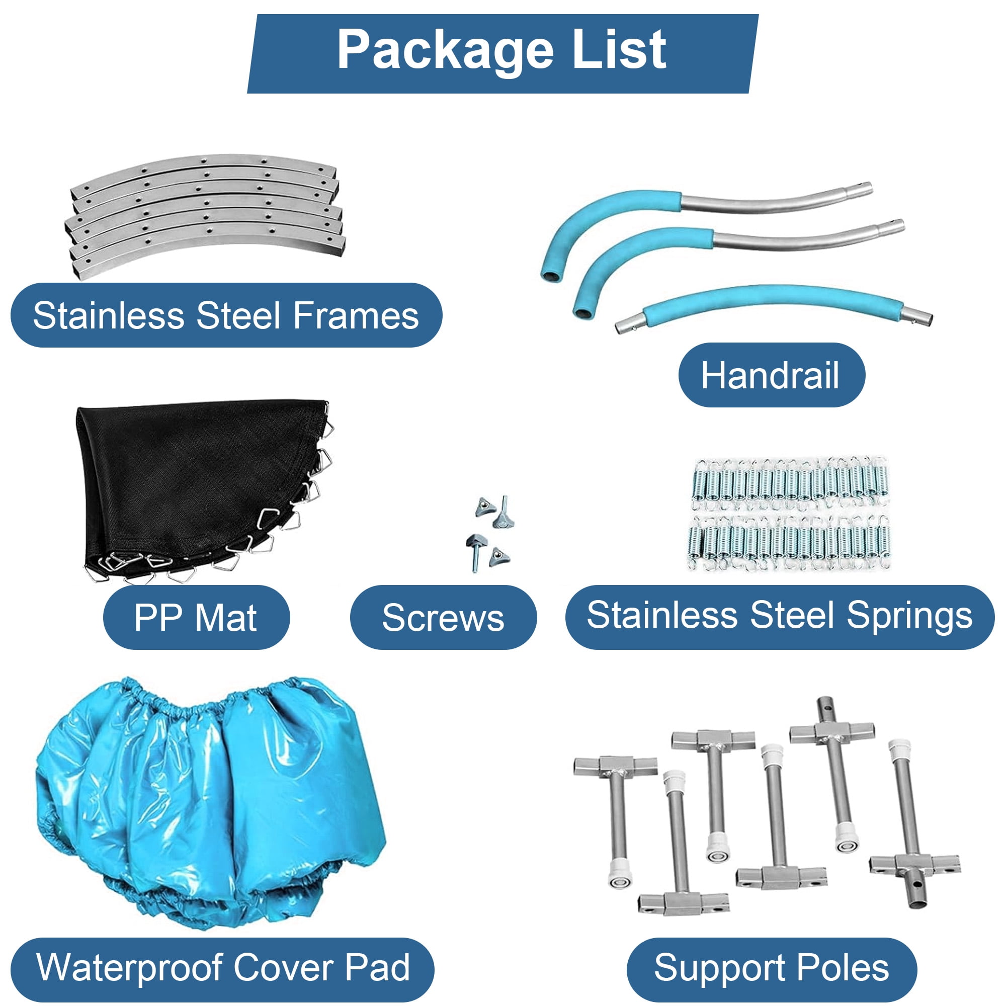 Features HIGH-STRENGTH SAFETY CONSTRUCTION – This Aukfa AK-ST01-002 mini trampoline for kids made of heavy-duty polypropylene, with a total of 30 rolling anti-rust springs to provide enough flexibility for anyone in the family. The maximum weight capacity 220 lbs. Six legs are also equipped with anti-slip rubber, which ensures the stability while reducing friction to protect the floor. All fitness trampolines are tested for safety and durability and meet or exceed ASTM-certificated child product standards. PADDED HANDLEBAR AND FRAME COVER – Enhance safety and comfort with our upgraded design featuring a 21.65-inch high padded handlebar tailored to the user’s height, ensuring a secure grip for kids to effortlessly control their bounce. The frame cover is equipped with additional safety padding and a spring mechanism, enhancing the jump pad surface for an even safer jumping experience. BETTER JUMPING EXERCISE – Enjoy your body to the fullest-The exercise trampoline trainer uses your weight and liner to perform unique cardiovascular exercises without stressing your body with high-intensity exercises. In addition, it also trains various muscle groups to help develop muscle mass and strengthen shoulder, hip and leg muscles, improve cardiovascular fitness and body composition, lower blood pressure. 15 minutes of exercise on the rebounder trampoline, which is equivalent to 30 minutes of running, 30 minutes of swimming, 60 minutes of yoga, or 500 sit-ups. FEEL SECURE WITH THE HEAVY-DUTY DESIGN – Well-constructed steel frame with high tension springs make the small trampoline extra durable to achieve your weight-loss goals. Our safety pad with high-quality PP mesh is constructive for children and sports lovers in reducing their body’s stress during the workout. The rubber-tipped legs will not wear your flooring, and the anti-skid factor will keep you running in place. EASY SETUP – Each rebound mini trampoline is equipped with a detailed assembly instruction manual, no additional tools are required, and the setup can be completed in just a few minutes. But we need to pay your attention here, please be carefully when you open and close the pad. If you have any question, please feel free to contact us. Weights & Dimensions Product Size: 36″L x 36″W x 30.33″H Handlebar Height: 21.65″H Outer Diameter: 36 inches Inner Diameter: 25.6 inch Maximum Number of Jumpers: 1 Weight Capacity: 220 lbs Product weight: 17.6 lbs Specifications Type: Fitness Trampoline Material: Metal, PVC, PE Spring Count: 36inch Suitable Age: 8+ years old Handlebar Included: Yes Applicable to: Gymnastics, Overrun, Exercise Resistance Bands: No Location: Indoor, Outdoor Use Overall Shape: Round Foldable: No Number of Legs: 6 Detachable Legs: Yes Durability: Rust Resistant Imported: Yes Please note: When younger children are playing, adults are welcome to accompany you. Product Warranty: One Year Warranty Package Information 1 x Mini Trampoline 1 x Handlebar 1 x User Manual: AK_AK-SR01M15003-B0_PUM_VY-121823