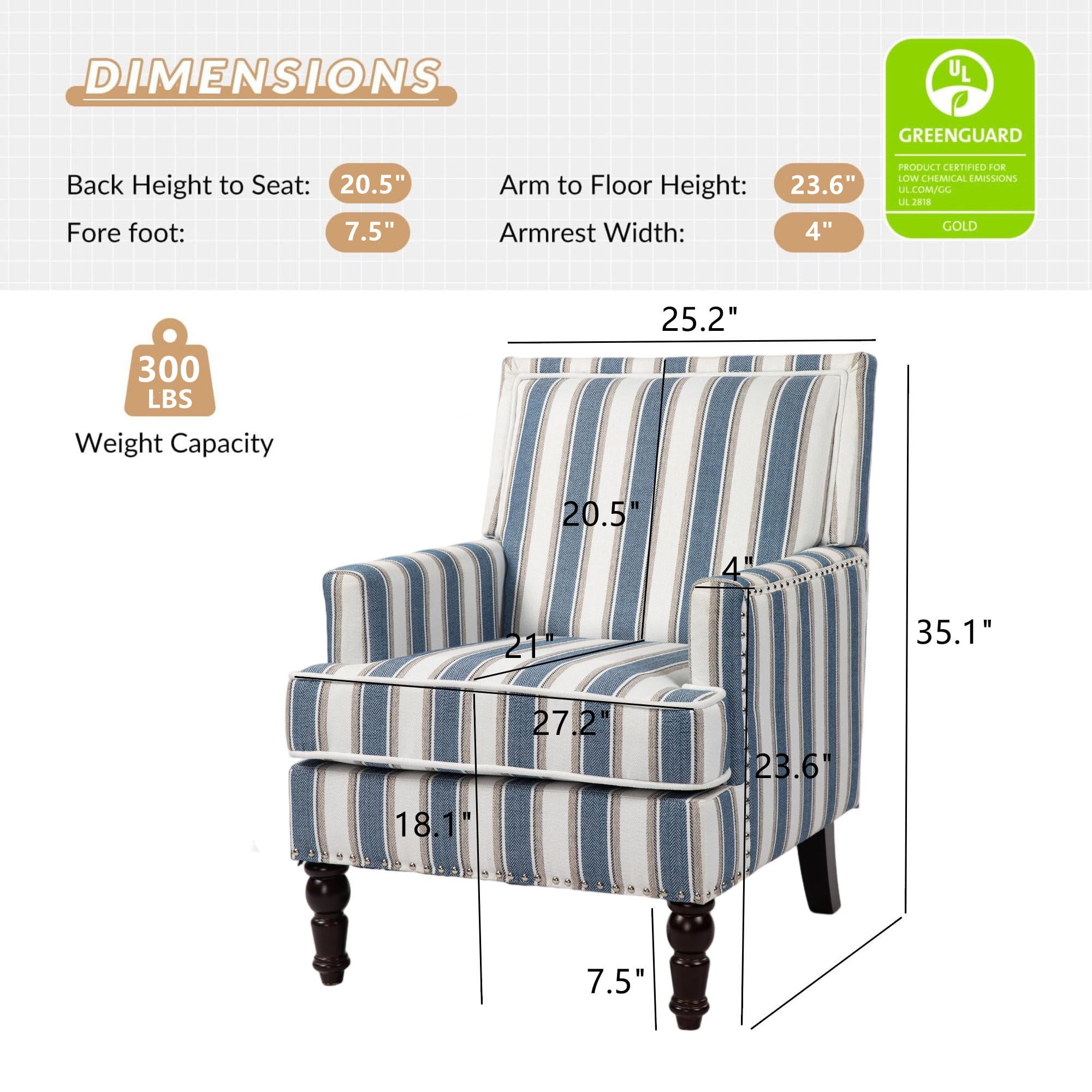 COMFY AND SUPPORTIVE – The armchair features a 115° seating angle, offering enhanced support that alleviates lower back strain and ensures a comfortable seating experience. It provides the perfect setting for a leisurely life, effortlessly meeting your relaxation needs. MODERN & RETRO DESIGN – There is a sense of classic modern retro timeless style given off in the stylish rivet trim and lustrous linen fabric armchair. Additionally, refined stitch seam, exquisite engraved wooden legs giving the chair authentic charm to your living room and bedroom, is a great addition to home decor. THICK PADDED CUSHION & FIRM SPRING SUPPORT – A 5″ thick seat cushion is crafted with metal pocket springs and high-density foam, offering a comfortable seated experience without excessive sinking, and facilitating easy standing up. BUILT FOR STABILITY AND DURABILITY – This living room chair features soft linen material, resilient foam cushions with steel springs, a sturdy wooden frame, and solid wood legs. It provides exceptional stability and seating support, boasting a weight limit of 300 lbs ensuring a comfortable experience. HOME ACCENT ESSENTIAL – Our armchair features a minimalistic yet midcentury-style silhouette, making it a timeless piece that fits into most decor styles. Its comfort and style make it perfect for your living room, bedroom, apartment, upstairs loft, cozy nook, or office space. SPECIFICATION: PRODUCT INFORMATION Overall: 27.2” L x 27.2” W x 35” H Back Cushion: 20.5”H Seat Depth – Front to Back: 21“ Seat Height – Floor to Seat: 18.1” Arm Height: 23.6” Seat Width: 19.7” Leg Height – Top to Bottom: 7.5” Overall Product Weight: 35 lb Box Size: 29.1” L x 26” W x 18.1″ H; 38 lb Features Product Type: Modern High Back Accent Chair Upholstered: Yes Upholstery Material: Linen Fill Material: Foam Frame Material: Solid Wood Upholstery Color: Blue Rivet Trim: Yes Seat Construction: Foam Legs Material: Wood Legs Color: Dark Brown Seat Style: Upholstered Seat Back Type: Upholstered Back Supplier Intended and Approved Use: Residential Use Weight Capacity: 300 lb Cleaning Code: WW: Water-based agents only. Gently remove stains by blotting. Assembly Level of Assembly: Partial Assembly Needed Adult Assembly Required: Yes Suggested Number of People for Assembly/Install: 1 Additional Tools Required (Not Included): All Tools Included Warranty Product Warranty: Yes Full or Limited Warranty: Limited Warranty Length: One Year