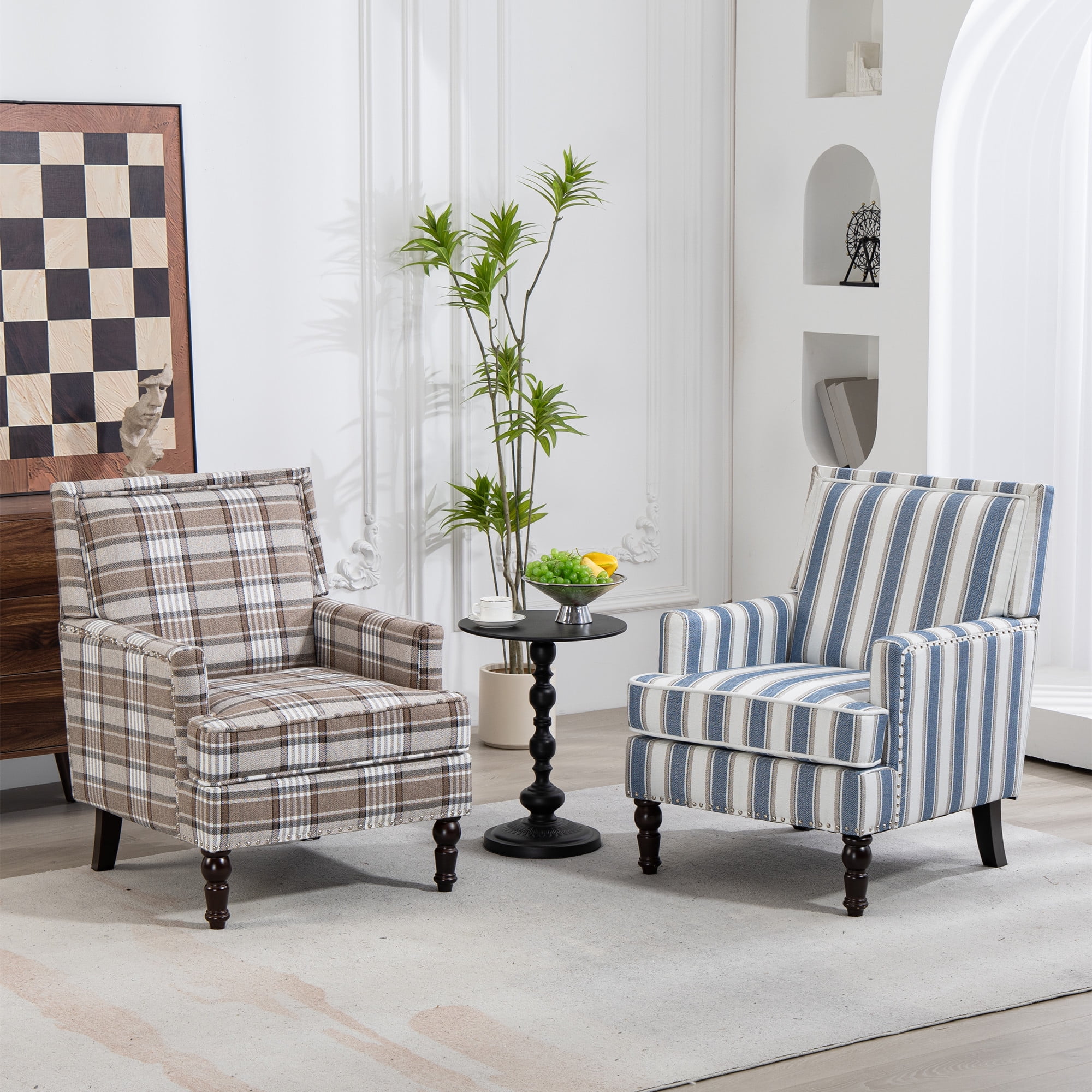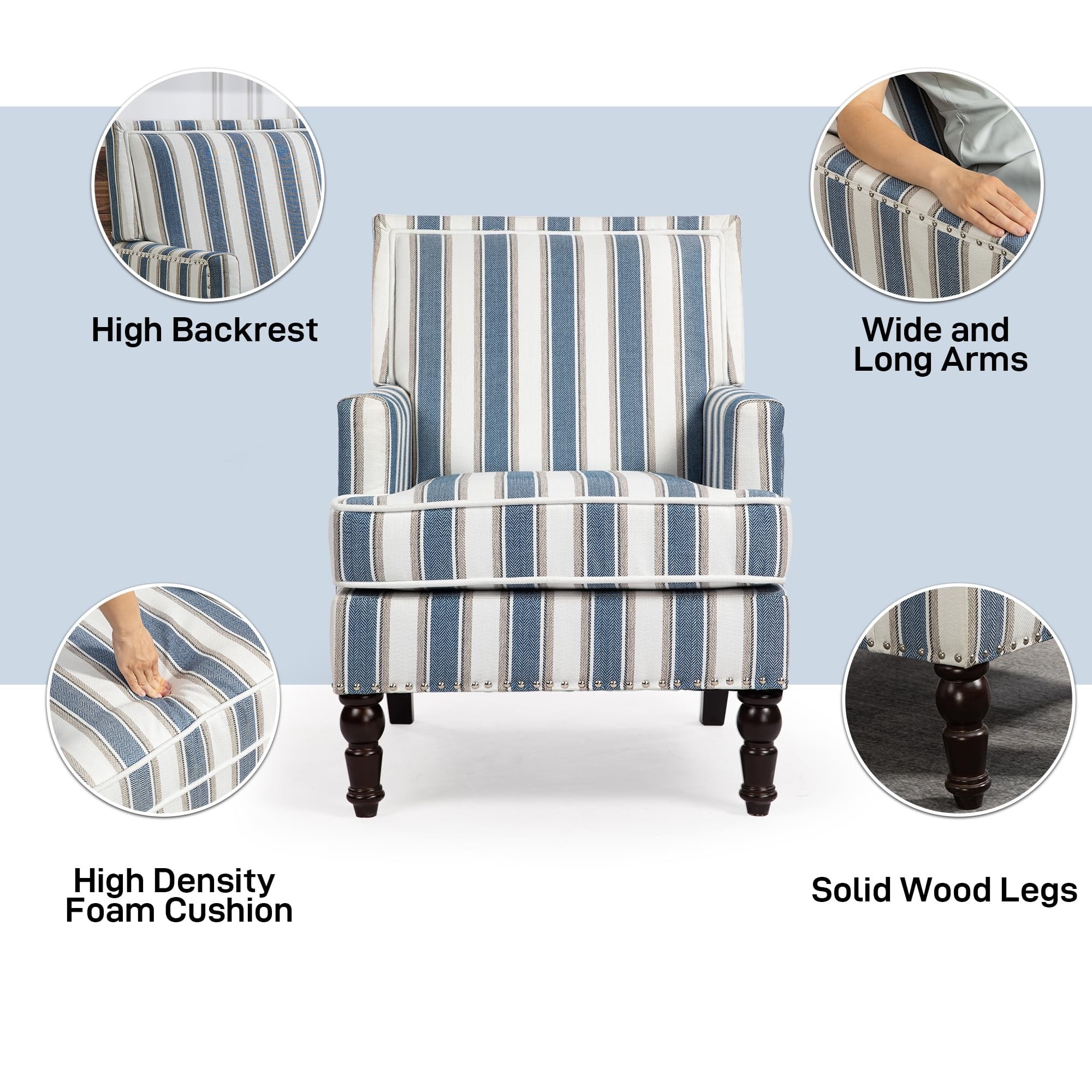 Aukfa Accent Chair Mid-Century Modern High Back Armchair Lounge for Living Room, Rivet Trim, Blue Stripes