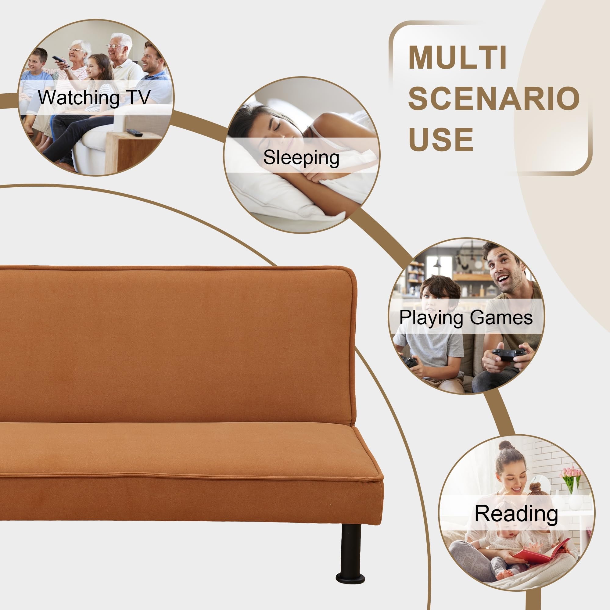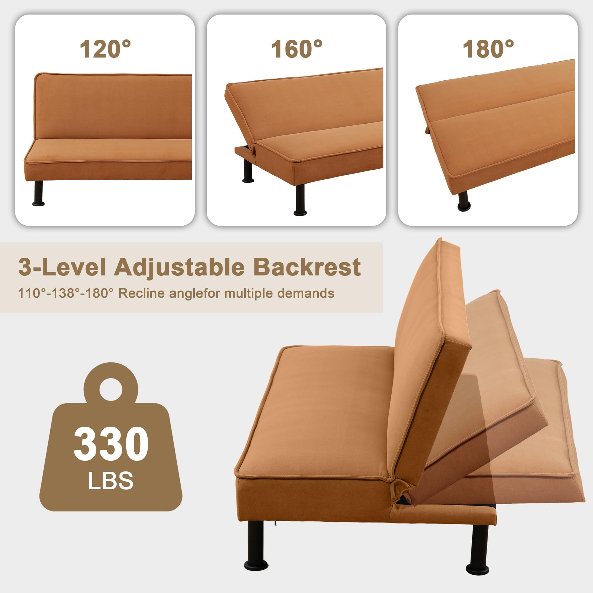 Aukfa Modern Futon Convertible Sofa Bed for Home Office, Adjustable Backrest, Flannel, Orange