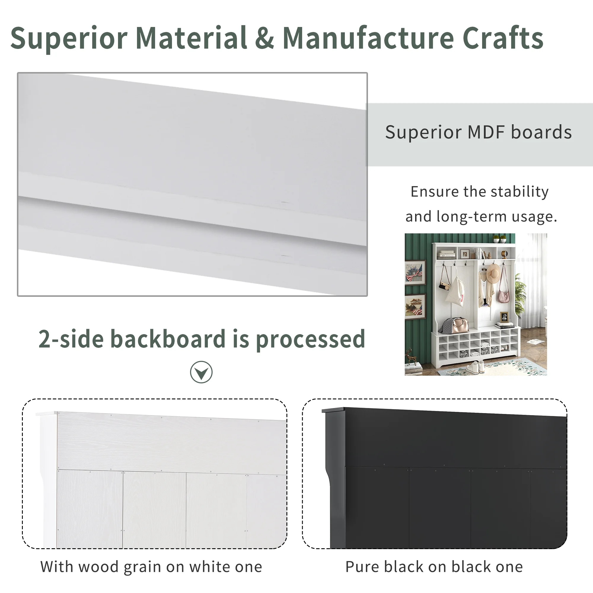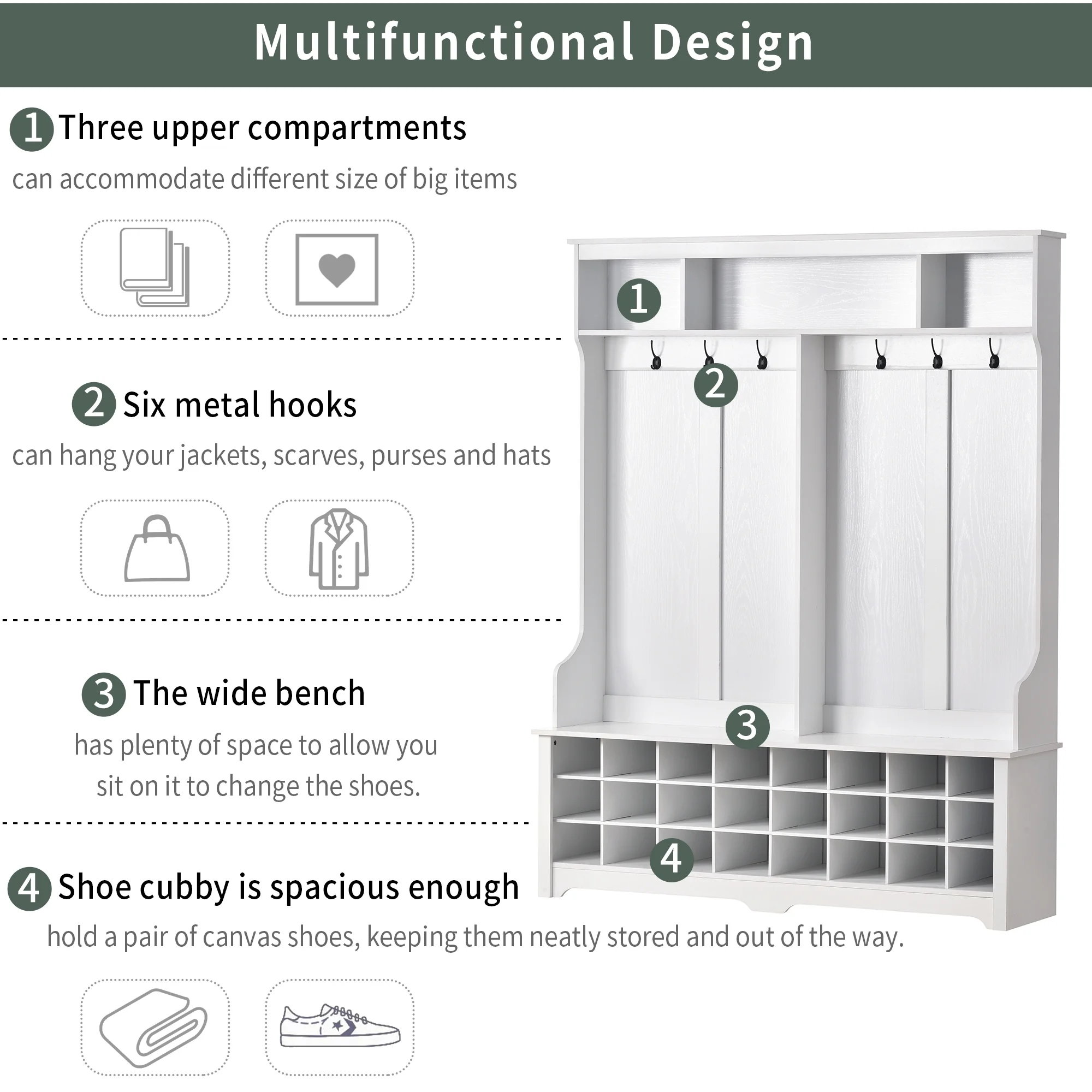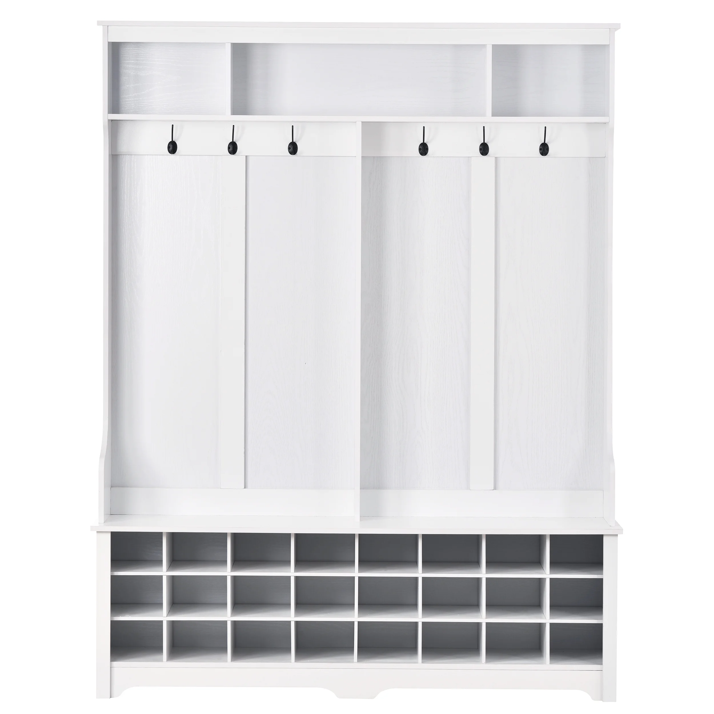 MODERN & PRACTICAL STYLE – With clean lines and double widening design, this AK-FH01-005 hallway coat rack is a modern style furniture for entryway. The versatility of this hallway coat rack will provide all the storage space needed for the entryway belongings. The bottom of the multi-grid design can be used as shoe rack or other arrangements. The wave lines at the bottom give the whole shape a touch of elegance. MULTIFUNCTIONAL DESIGN – The three upper compartments can accommodate different size of big items, and the six metal hooks can hang your jackets, scarves, purses and hats. The wide bench sits on top of 24 individual shoe cubbies, and it has plenty of space to allow you sit on it to change the shoes. Each shoe cubby is spacious enough to hold a pair of canvas shoes, SUPERIOR MATERIAL & MANUFACTURE CRAFTS – quality material to ensure the stability and long-term usage. In this case, this hallway coat rack is made of MDF boards to guarantee the durability in usage,The 2-side backboard of this furniture is processed with wood grain on white one, and with pure black on black one. SECURITY SETTING – a wood color support fitting and metal preventing fall down fittings are equipped with this hallway coat rack. Black metal hooks are all in graceful shape and high quality, both beautiful and practical. The side panels are narrow enough to fit against the wall, without making the limited space in the entryway look cramped. LOAD-BEARING CAPACITY & DIMENSIONS – This product is 60”W x 15.7”D x 77.1”H. This product upper shelf carries a total of 66LBS, 22LBS per hook and 220LBS for the seat. PRODUCT INFORMATION Hall Tree:60”W x 15.7”D x 77.1”H Weight Capacity:315lbs Seat & Top Panel Thickness:0.6inch Estimated Time to Set Up:2 h Overall Product Weight:110.55LBS Features Product Type:Hall Tree with Storage Bench Top Shape:Rectangle Top Color:White Top Material:MDF Top Finish Application:Veneer Seat Color:Black Seat Material:Particle board Base Finish Application:Veneer Purposeful Distressing Type:No Natural Variation Type:No Wheels Included:No Built-In Lighting:No Drawer Glide Mechanism:Ball bearing glides Drawer Glide Material:Metal Cabinets Included:No Country of Origin:China Assembly Assembly Required:Yes Level of Assembly:Full Assembly Needed Suggested Number of People for Assembly/Install:2 Additional Tools Required (Not Included):Tool Free Assembly Warranty Commercial Warranty:NO Product Warranty:YES Warranty Length:One Year Full or Limited Warranty:Limited Warranty PACKAGE INFORMATION: 1 x Hall Tree 1 x User Manual:AK_AK-HL01WX1005-W0_PUM_YL-030323