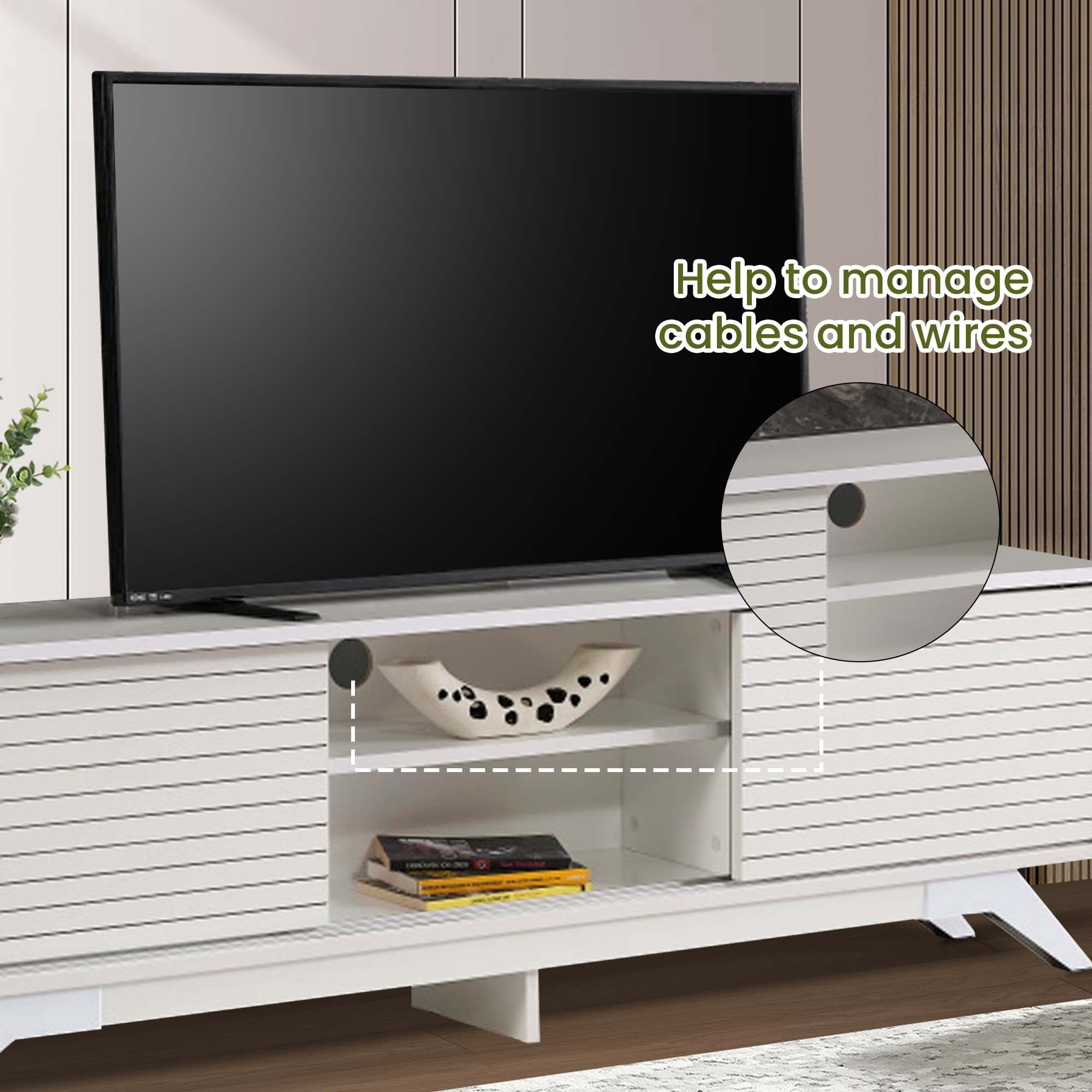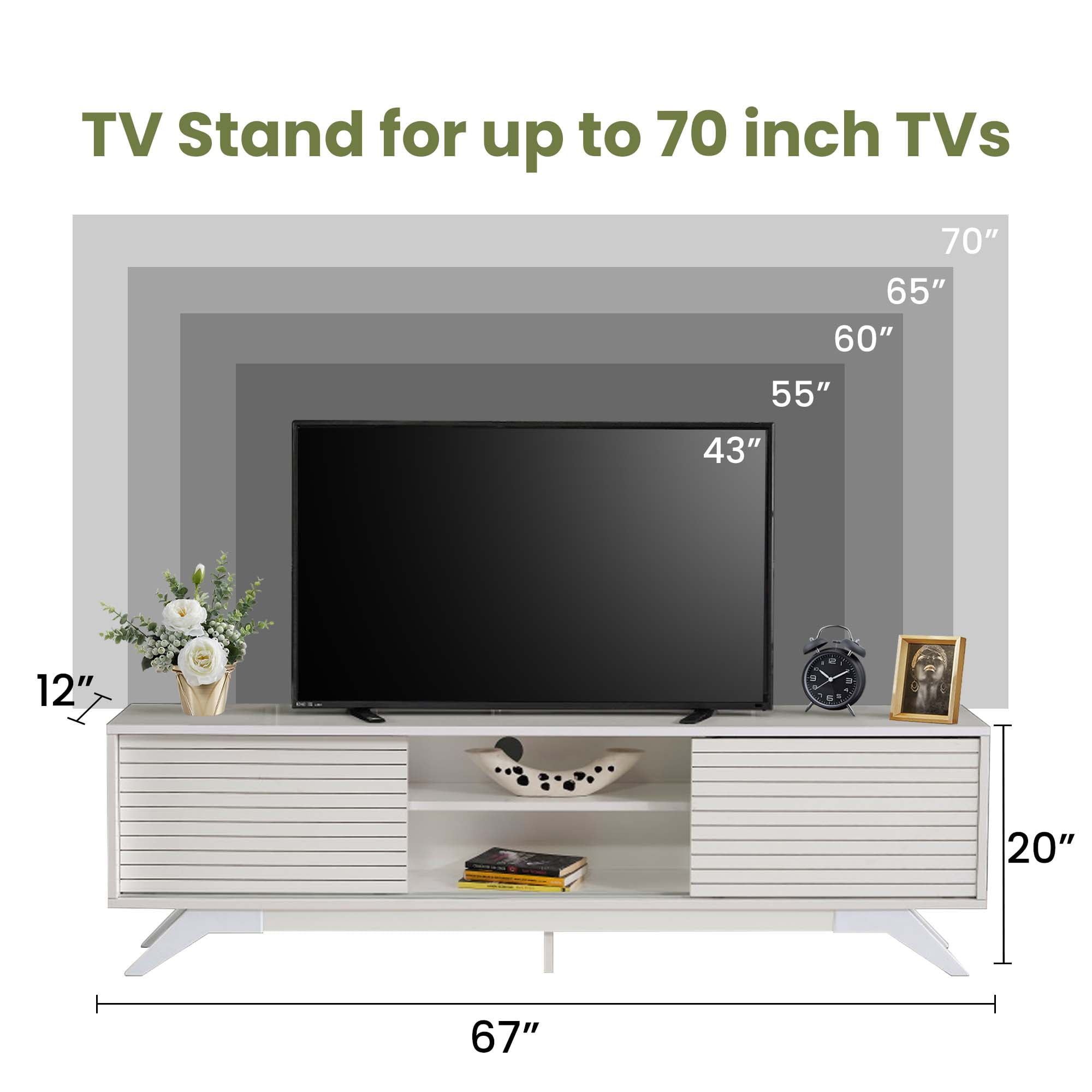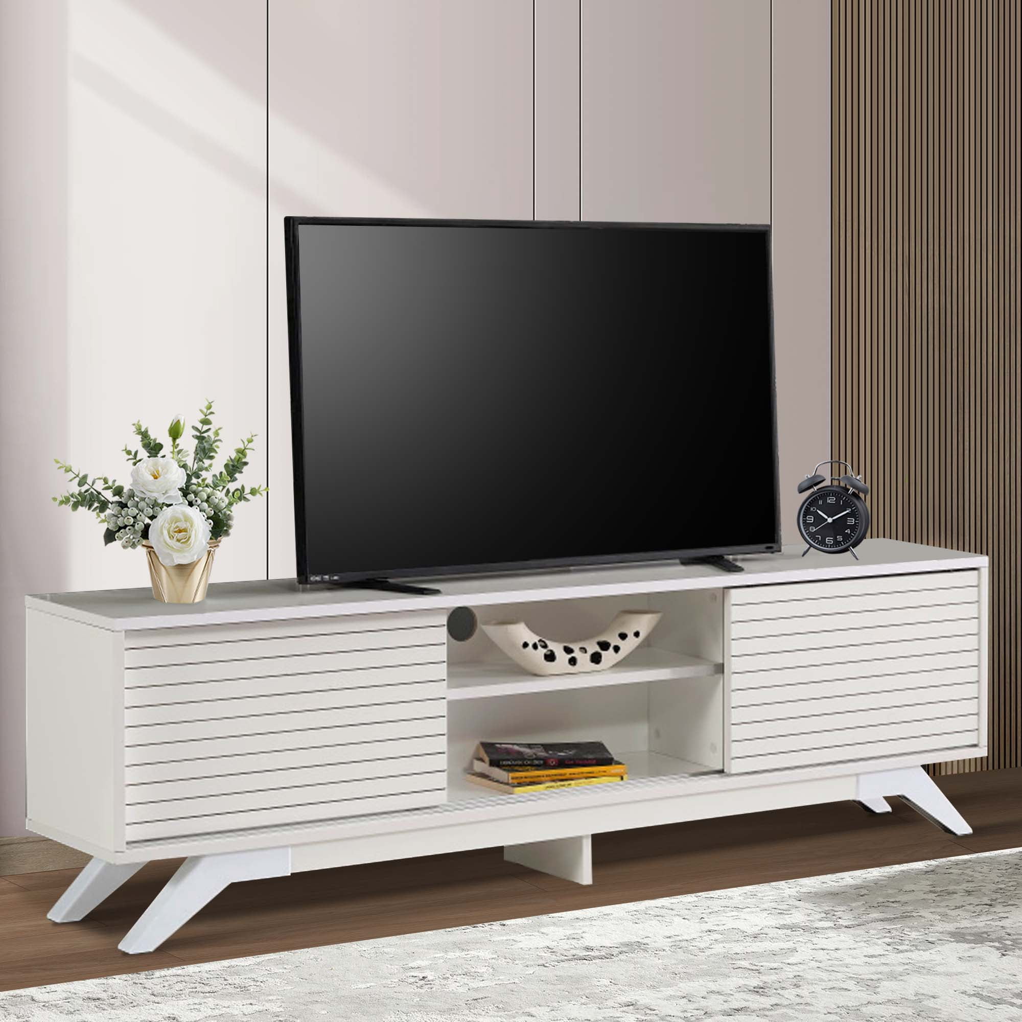 Improve your living room with a TV Stand featuring a middle shelf and closed storage on both sides for you to have a place for your media essentials or décor, whether in your living room or bedroom.Elevate your living room with the captivating mid-century modern charm of our wooden TV Stand. With its sleek design, it effortlessly transforms the ambiance of your space. Two spacious sliding door closets offer ample storage for your media essentials, while the central cubby shelves cater to your DVD player and video console.With a cord management feature in the back to keep things tidy, this storage console will make a practical addition to your home.Available in a range of colors, this TV Stand is a versatile addition that complements any room. Crafted with meticulous care and quality-checked for your satisfaction, it’s designed to enhance your living experience. Modern TV Stand Dimensions: 67″ W x 20″ H x 12″ D. Upgrade your living space with this stylish and functional TV Stand.