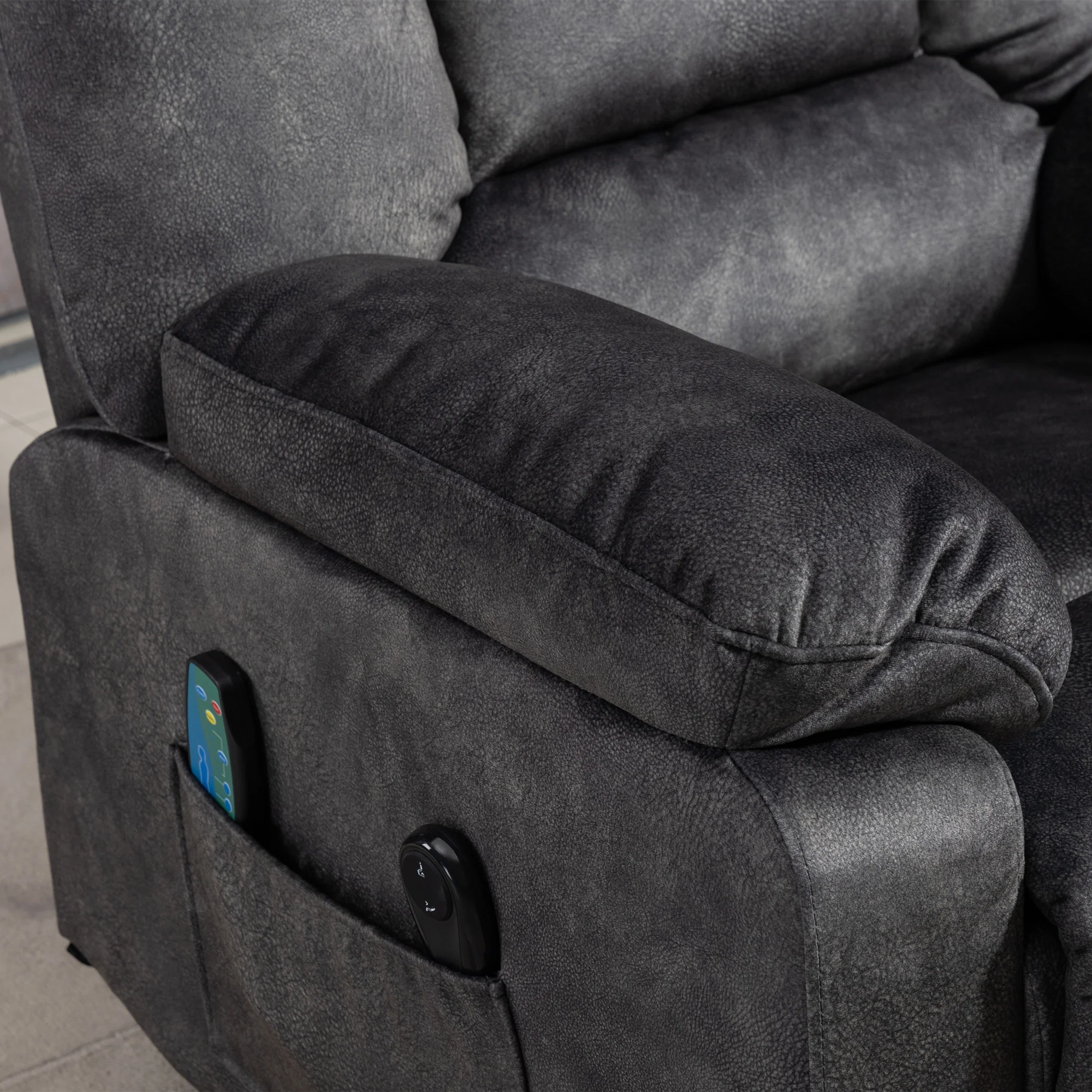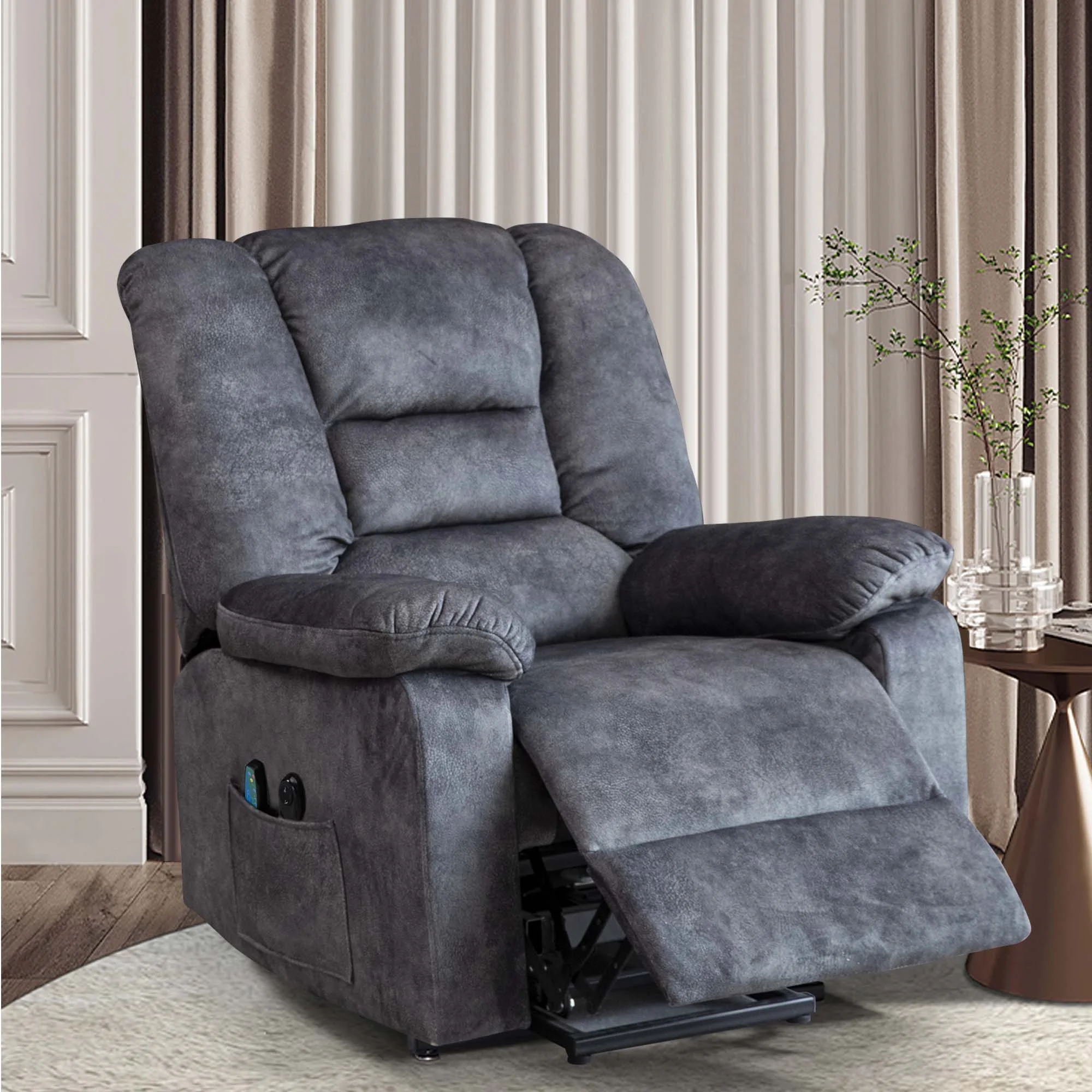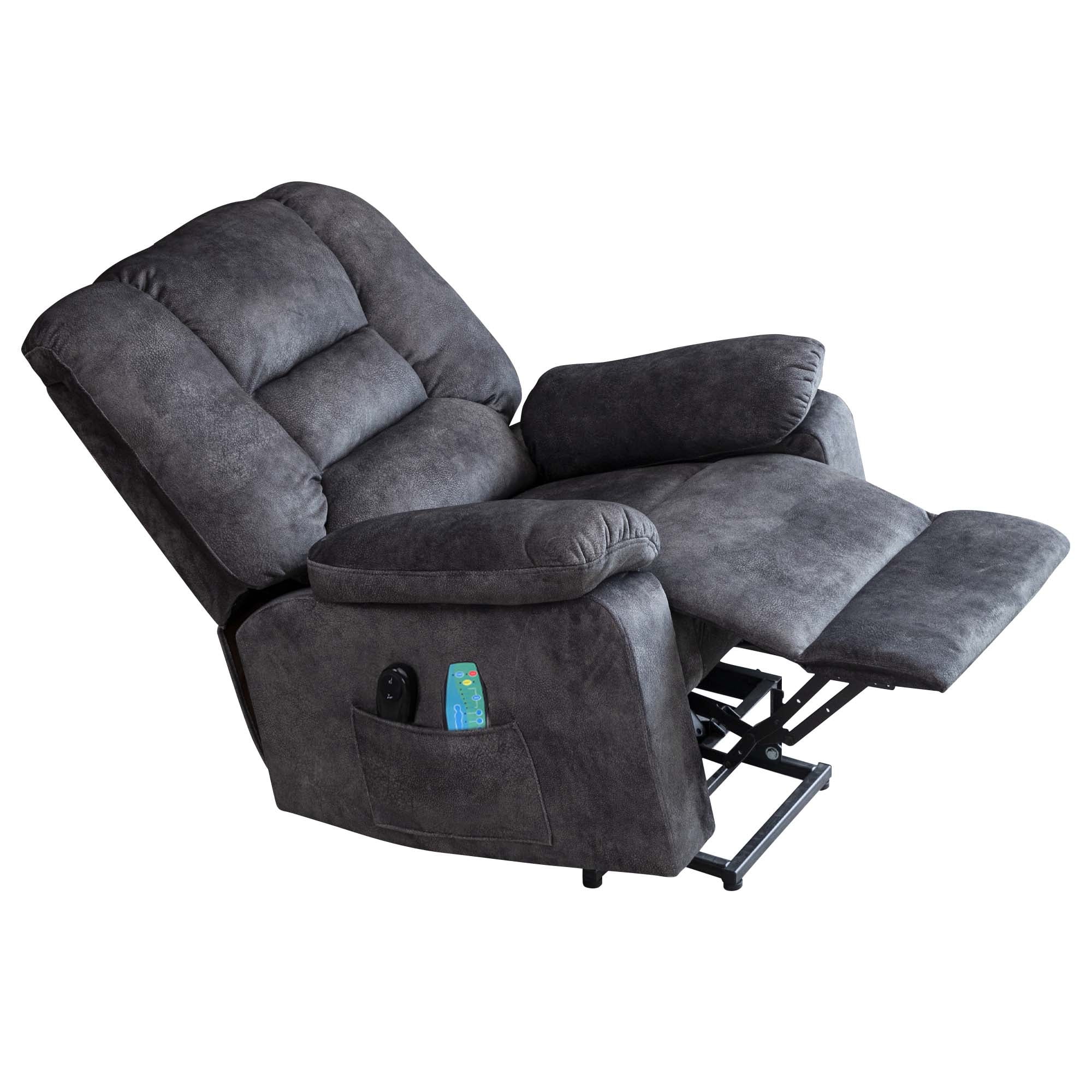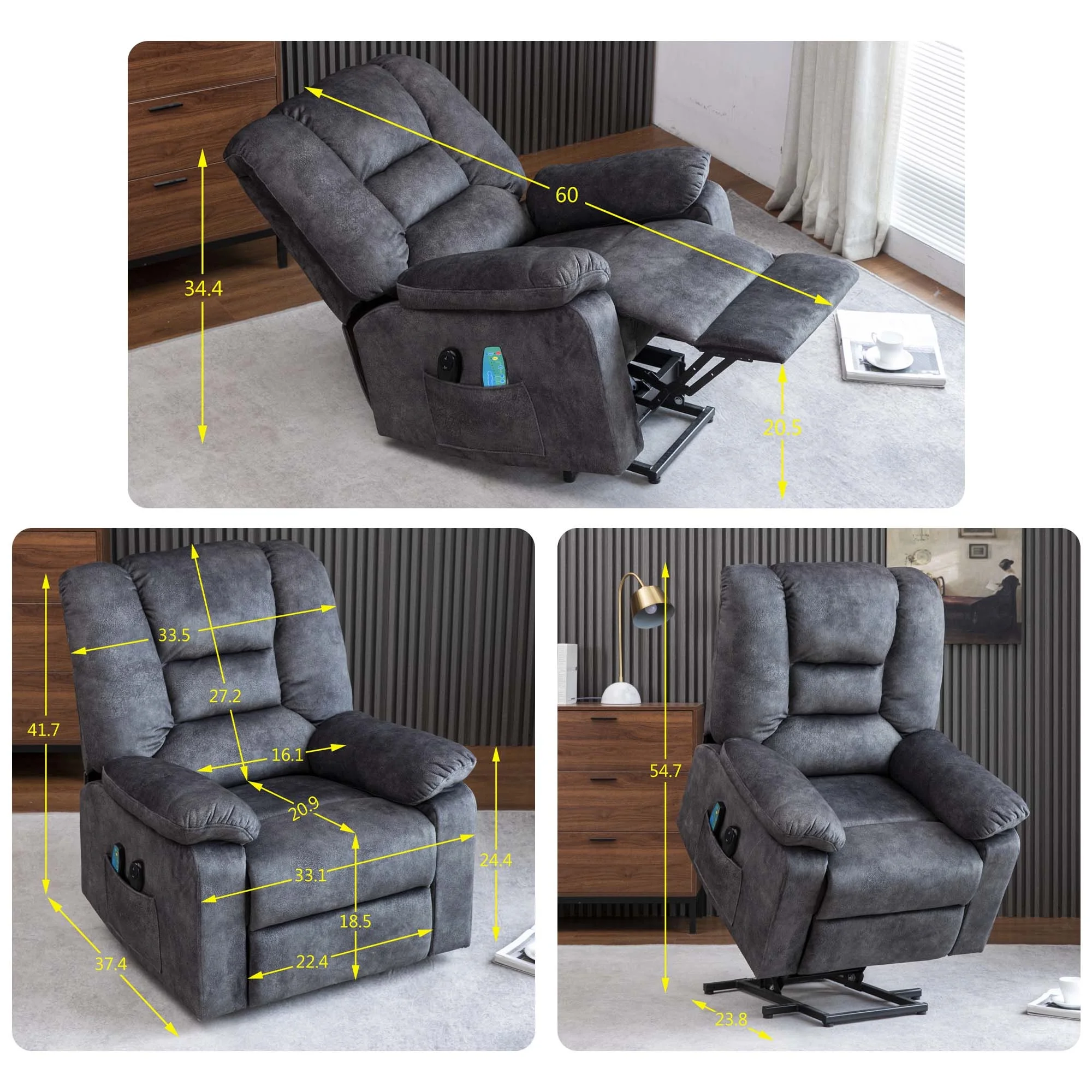 EFFORTLESS MOBILITY – Our AK-FR01-002 power lift recliner chair with heat and massage gently lifts and tilts forward, assisting the elderly in standing up easily, promoting independence. RELAXATION AT ITS BEST – Experience soothing warmth and customizable massages with the built-in heat and massage function, providing unparalleled comfort and relief for the elderly and adults. STYLISH AND VERSATILE – Designed to blend seamlessly with any interior decor, this recliner adds both functionality and style to any room, enhancing the overall ambiance of your home. PREMIUM COMFORT AND DURABILITY – Crafted with high-quality materials and plush cushioning, this auto lift chair ensures long-lasting comfort and support for users up to 330 lb. CLASSIC DESIGN – With smooth microfiber fabric, wide seating space, thick sponge back, armrests and bottom seats, and a slightly raised headrest to support your neck when you lie down. Each hand has a pocket for storing small items and books. EASY ASSEMBLY AND PACKAGE SITUATION – The chair consists of 2 packages as shipped, if you receive a sofa that is not complete, please be patient and wait for the second package. Assembly requires only a few steps and no additional tools. If you have any questions, please feel free to contact us, we will provide professional customer service and technical support for all customers. PRODUCT INFORMATION Overall: 37.1” L x 33.1” W x 41.7” H Back Height – Seat to Top of Back: 27.2”H Seat Depth – Front to Back: 20.9“ Seat Height – Floor to Seat: 18.5” Overall Product Weight: 105.8 lb Arm Height – Floor to Arm: 24.5” Minimum Door Width – Side to Side: 34” W Product Type: Power Lift Recliner Chair Chair Design: Heated; Reclining; Full Body Massage Upholstery Material: Microfiber/Microsuede Upholstery Material Details: Flannel Frame Material: Manufactured Wood + Solid Wood Fill Material: Foam Ottoman Included: No Cup Holders: No Massage Setting: Yes Massage Setting Options: Vibration Heating: Yes Customizable Programs: Yes Remote Control Included: Yes Weight Capacity: 330 lb Durability: Stain Resistant; UV Resistant; Scratch Resistant Reclining Type: Power Motion Type: Reclining; Lift Assist Supplier Intended and Approved Use: Residential Use Base Material: Metal Reclining Type Details: Power – Remote Control Storage Included: Yes Storage Location: Pocket Adjustability Features: Reclining Product Care: Do Not Wash Level of Assembly: Partially Assembly Needed Adult Assembly Required: Yes Suggested Number of People for Assembly/Install: 1 Product Warranty: Yes Full or Limited Warranty: Limited Warranty Length: One Year