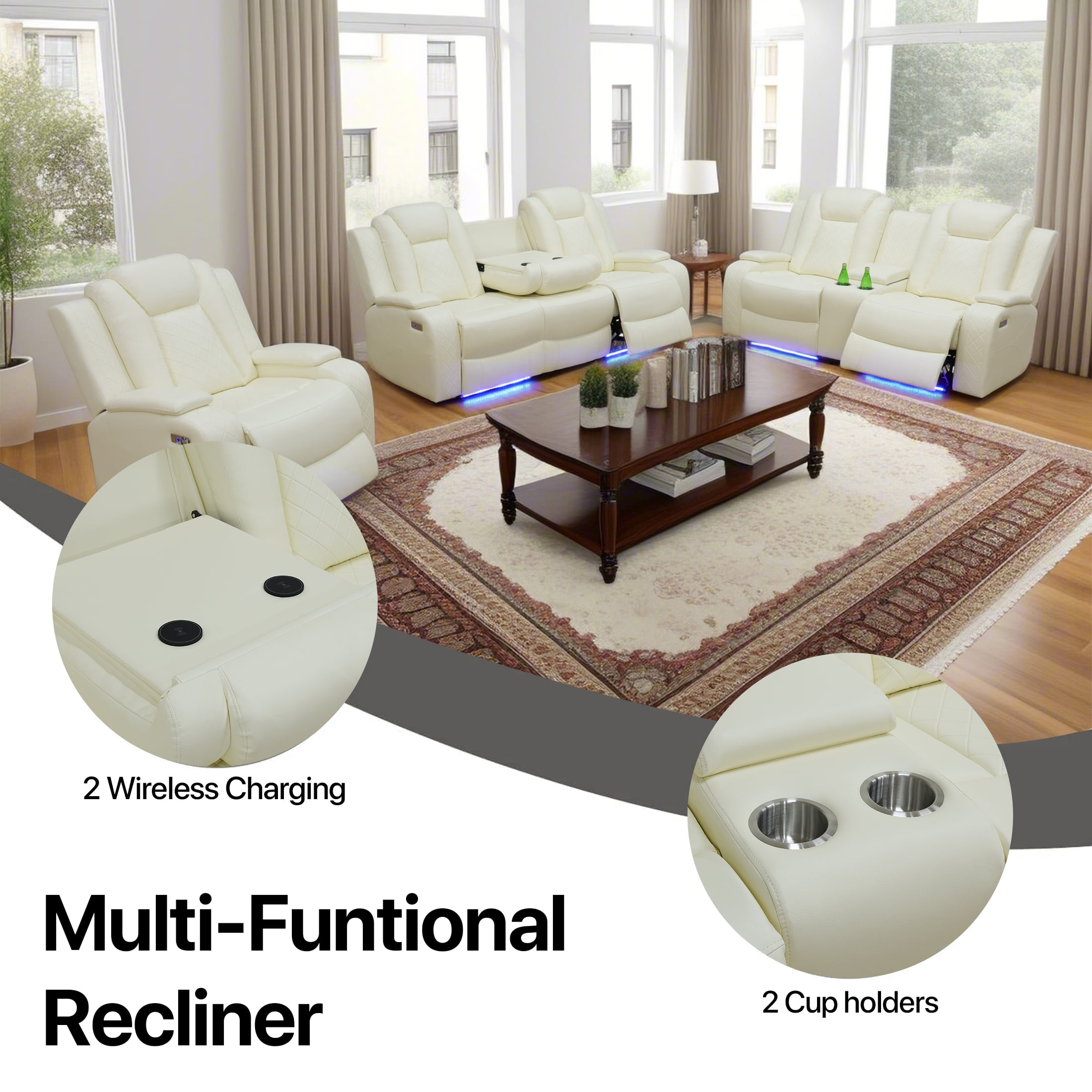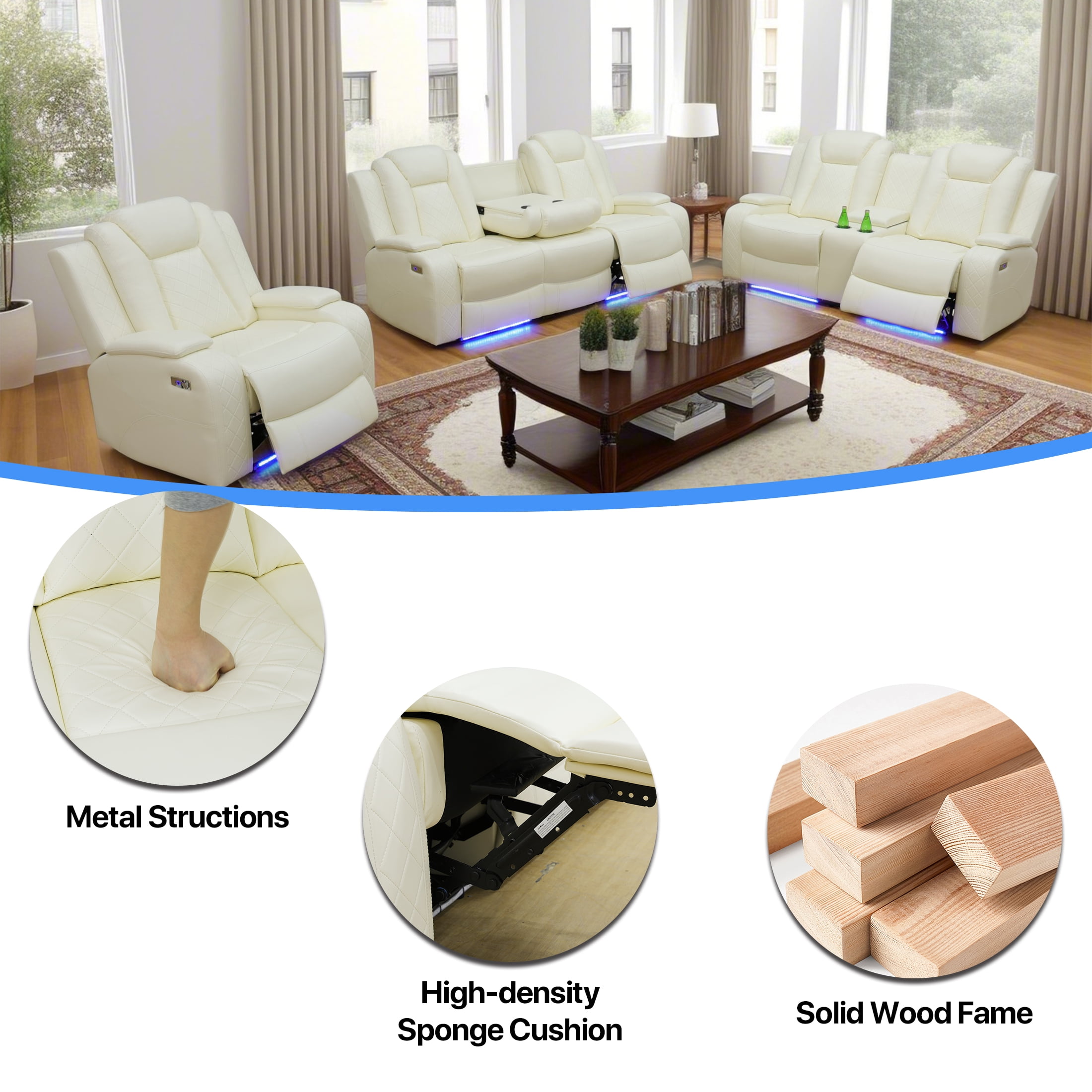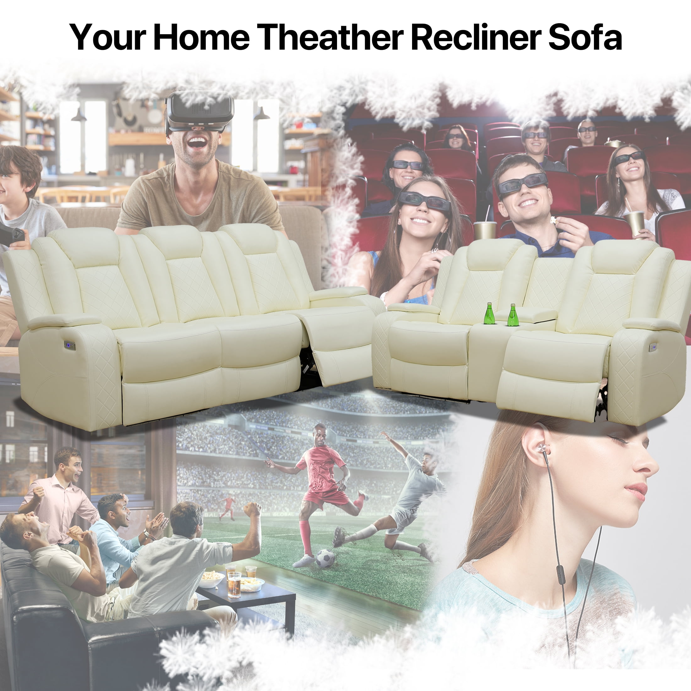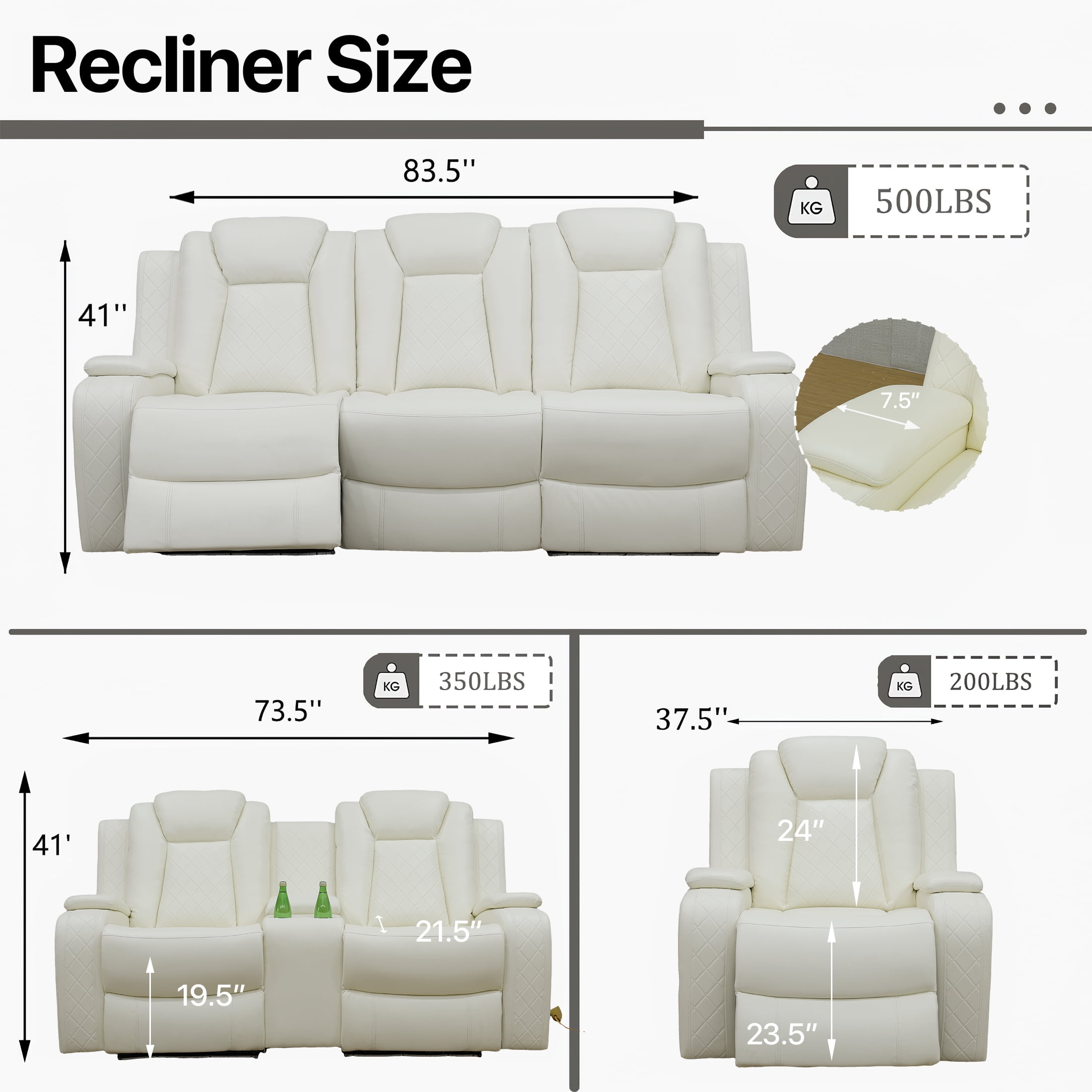 Comfortable & Durable: Experience comfort and durability with the Aukfa power recliner sofa set. Upholstered in breathable faux leather for easy clean and maintenance. High-density foam seats and plush cotton-filled back provide luxurious comfort. Built with a solid wood frame for lasting durability. Convenient Design: Our recliner chairs are equipped with storage compartments and USB ports for added convenience. The double recliner loveseat offers a center storage bin and cup holders. The 3-seater sofa includes a flip-over table panel, transforming into a mini-table with ample storage space for everyday essentials. Ergonomic Adjustable Recliner: This living room furniture sofa set features a manually adjustable backrest, reclining from 115-120° to 160-180°. The ergonomic design ensures optimal comfort for both sitting and lying down. With a length of 66″ when extended, it provides versatile relaxation to relieve fatigue. Wireless Charging &Reading Light: Experience seamless integration of technology and comfort with our reclining sofa featuring built-in wireless charging for your smartphone. Say goodbye to tangled cords and cables while enjoying the convenience of a built-in reading light for relaxing moments. (Only for 3 seater couch) Enhance Your Home Theater Experience:Our theater recliner sofa features eye-catching LED floor strips that illuminate your space, creating a home cinematic atmosphere. Easily control the lights with convenient buttons, Relax and immerse yourself in drama and action with our reclining sofa set.