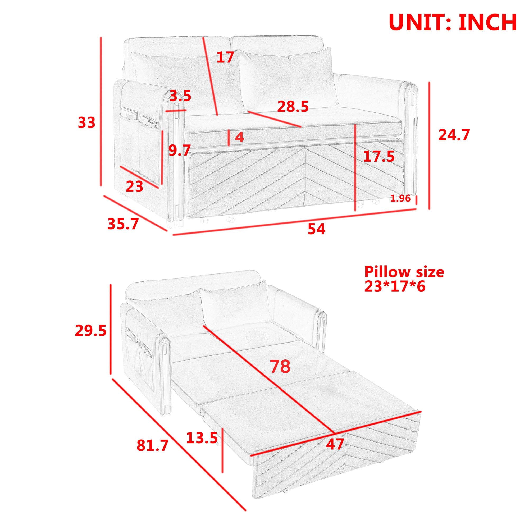 ONE-STEP CONVERT – Aukfa AK-FS02-024 couch bed converts quickly and easily into a sleeper bed with simple pull out action. CONTEMPORARY STYLE – The clean lines combined with elegant design, create a concise contemporary style that never goes out of style. MADE FOR COMFORT – Selected velvet fabric, fuzzy and constant temperature touch is irresistible. Thick backrest with a comfy lumbar pillow, lying as if wrapped, relieves the tiredness of the whole day. BUILD TO LAST – The sinuous springs and high-density foam create a durable yet soft seat, ensuring the couch sleeper will not sag over time. STORAGE POCKETS AND SOFT PILLOWS – Our sofa comes with two side storage bags for you to reach and use to store your TV remote, cell phone, glasses, or books. Also includes two soft pillows for added back support or sleep. ASSEMBLY – This pull out sofa arrives in 1 package, take 2 people 1 hour to assemble, and instruction and tools are included. 12-hour professional service team will support you if there is any problem. SPECIFICATION: PRODUCT INFORMAITON Overall – Sofa: 54” L x 35.7” W x 33” H Overall – Sleeper Sofa: 81.7” L x 47” W x 29.5” H Back Cushion: 17”H Seat Depth – Front to Back: 28.5“ Seat Height – Floor to Seat: 17.5” Minimum Door Width – Side to Side: 33”W Overall Product Weight: 125 lb Arm Height – Floor to Arm: 24.7” Leg Height – Top to Bottom: 2” Box Size: 48” L x 32.7” W x 20.5″ H;135 lb Features Product Type: Sofa Sofa Design: Sofa Bed Seating Capacity: 2 Upholstery Material: 100% Velvet Pattern: Solid Color Frame Material: Solid Wood + Manufactured Wood Upholstery Color: Gray Fill Material: Foam Leg Material: Plastic Leg Color: Black Arm Style: Square Arms Back Type: Tight Back Seat Style: Single cushion seat Storage Included: Yes Toss Pillows Included: Yes Tufted: Yes Removable Cushions: No Imported: Yes Supplier Intended and Approved Use: Residential Use Weight Capacity: 600 lb Product Care: Wipe Clean With A Damp Cloth With Soap And Water Assembly Level of Assembly: Full Assembly Needed Adult Assembly Required: Yes Suggested Number of People for Assembly/Install: 2 Additional Tools Required (Not Included): All Tools Included Warranty Product Warranty: Yes Full or Limited Warranty: Limited Warranty Length: One Year