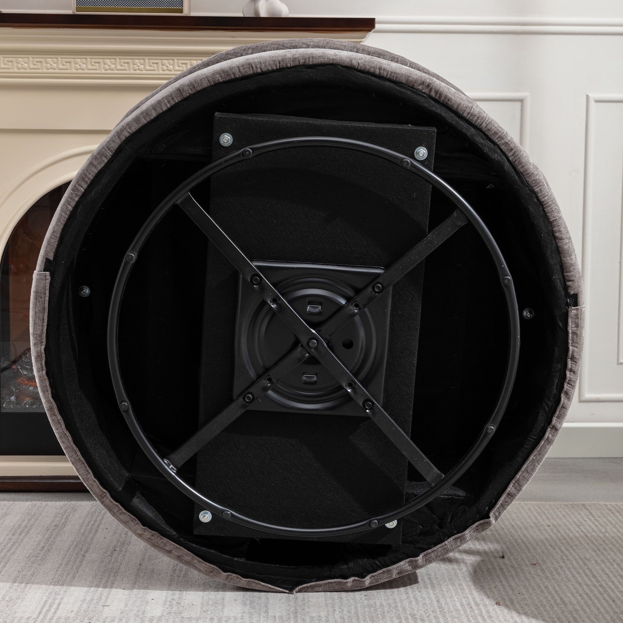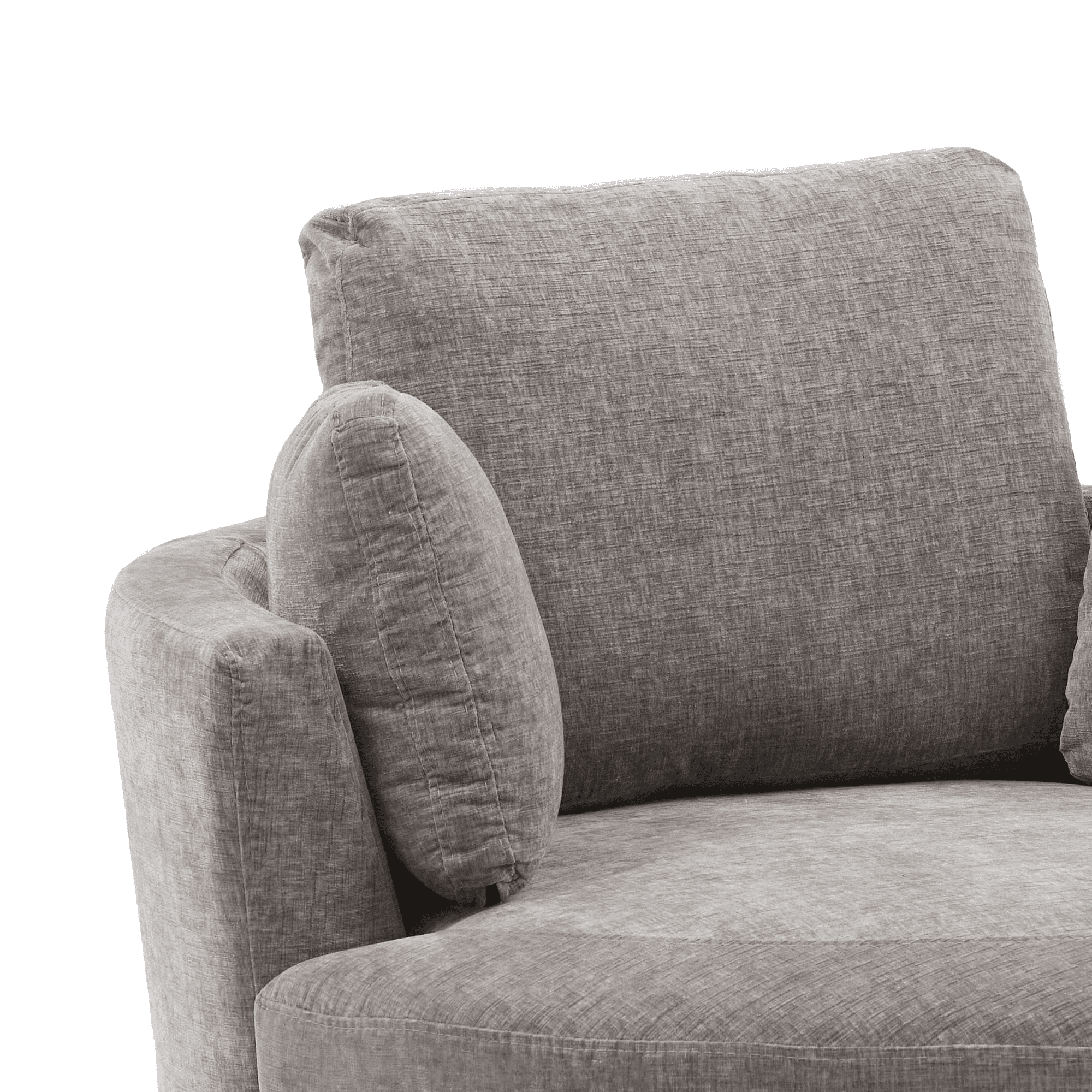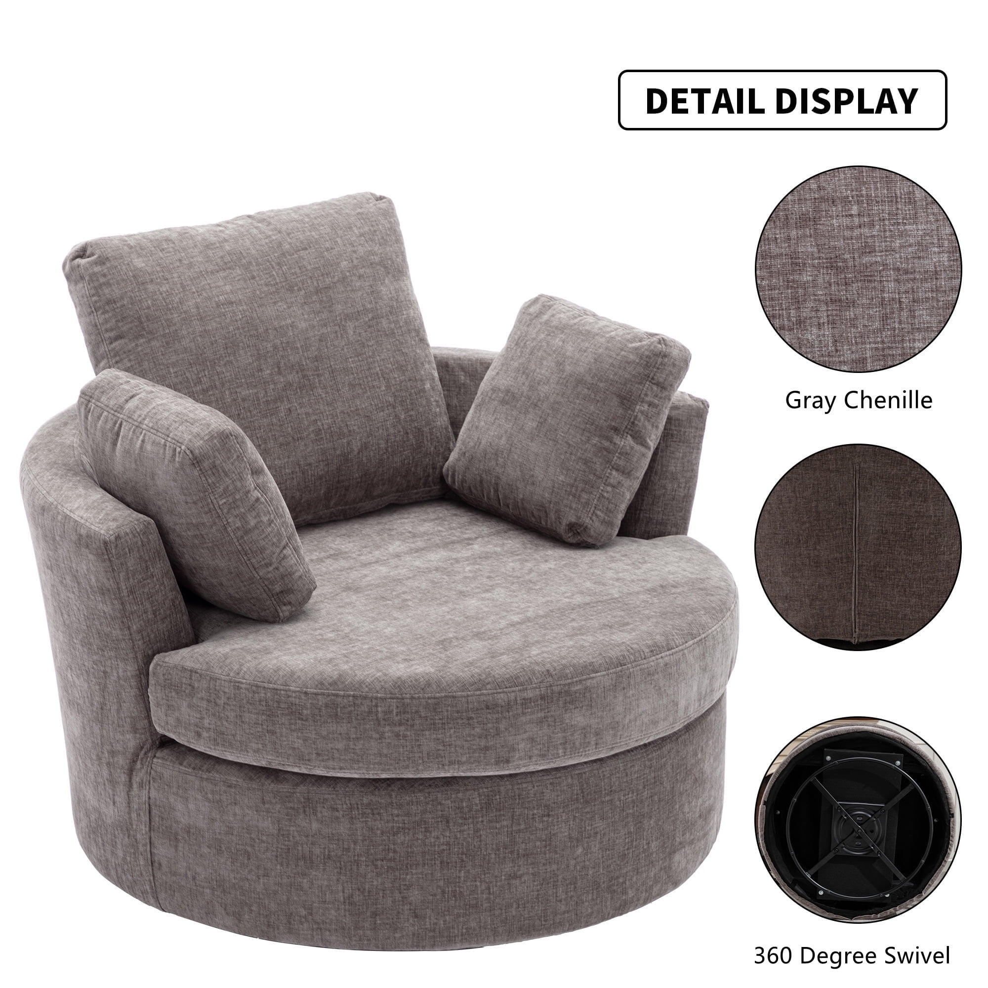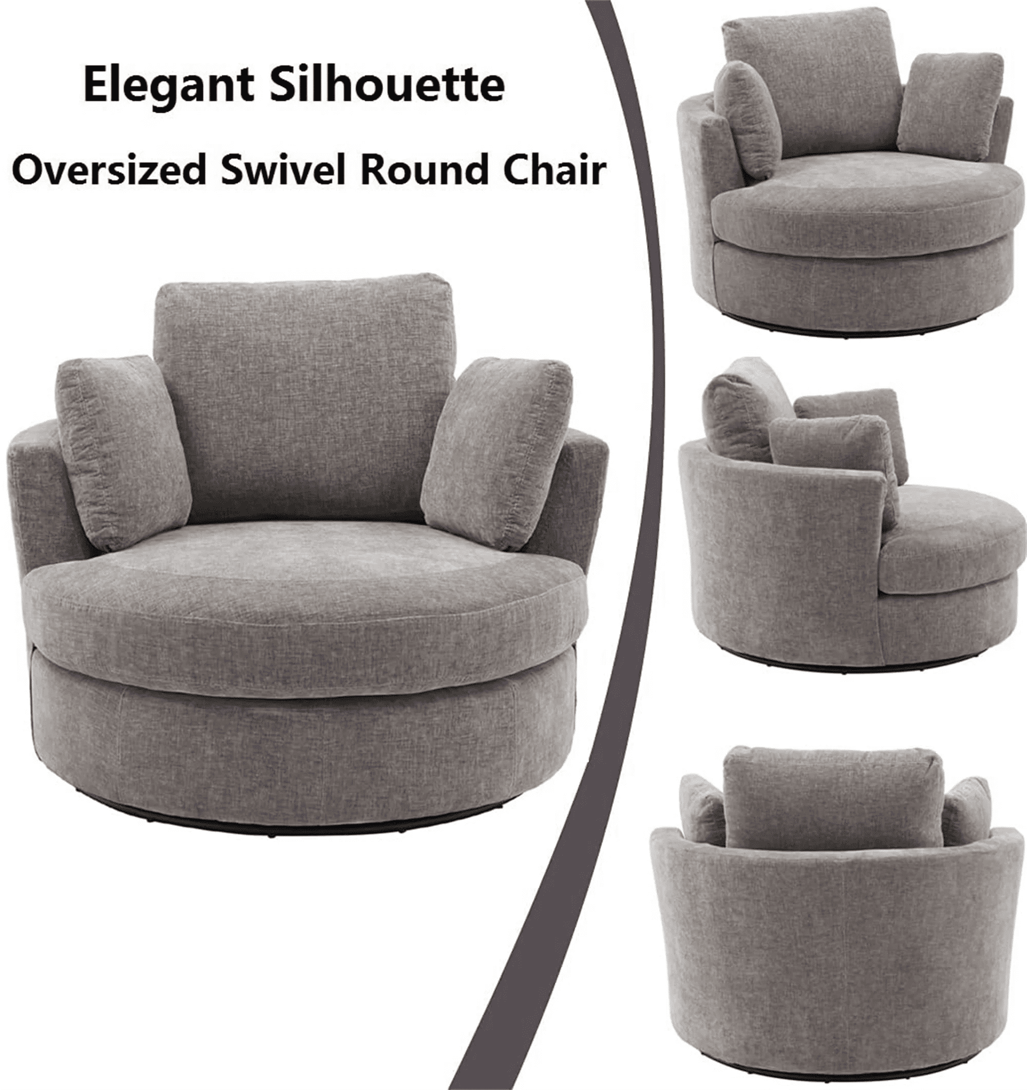 ULTIMATE COMFORT – Sink into blissful relaxation with our AK-FA01-027 oversized swivel barrel chair’s plush cushioning and ergonomic design. LUXURIOUS DESIGN – Elevate your home decor with this stylish and sophisticated oversized swivel barrel chair. 360-DEGREE SWIVEL – Enjoy the convenience of a smooth-gliding swivel base, perfect for socializing or changing views effortlessly. DURABLE CONSTRUCTION – Crafted with a sturdy wooden frame and high-quality upholstery for long-lasting comfort and support. LEISURE AND RELAXATION – The best sitting posture of this chair is to sit cross-legged on it to read a book or curl up on it to rest and watch TV. The two small pillows provide side support, and the large pillow behind it provides the main support. VERSATILE ACCENT CHAIR – Enhance any room with this neutral-colored chair that complements various interior design styles. SPECIFICATION: PRODUCT INFORMAITON Overall: 40.2” L x 42.1” W x 33.8” H Back Cushion: 18.6”H Seat Depth – Front to Back: 26.2“ Seat Height – Floor to Seat: 17.4” Overall Product Weight: 71.7 lb Weight Capacity: 440 lb Features Product Type: Oversized Swivel Barrel Chair Upholstered: Yes Upholstery Material: Chenille Fill Material: Foam Frame Material: Solid + Manufactured Wood Arms: Square Arms Pillow Included: Yes; 3 Pcs Ottoman Included: No Tufted: No Upholstery Color: Gray Swivel: Yes Seat Construction: Foam; Sinuous Spring; Pocket Spring Base Material: Metal Base Color: Black Seat Style: Upholstered Seat Back Type: Pillow Back USB Charging Included: No Removable Back Cushions: No Removable Seat Cushions: Yes Supplier Intended and Approved Use: Residential Use Cleaning Code: WW: Water-based agents only. Gently remove stains by blotting. Assembly Level of Assembly: Full Assembly Needed Adult Assembly Required: Yes Suggested Number of People for Assembly/Install: 1-2 Additional Tools Required (Not Included): All Tools Included Warranty Product Warranty: Yes Full or Limited Warranty: Limited Warranty Length: One Year