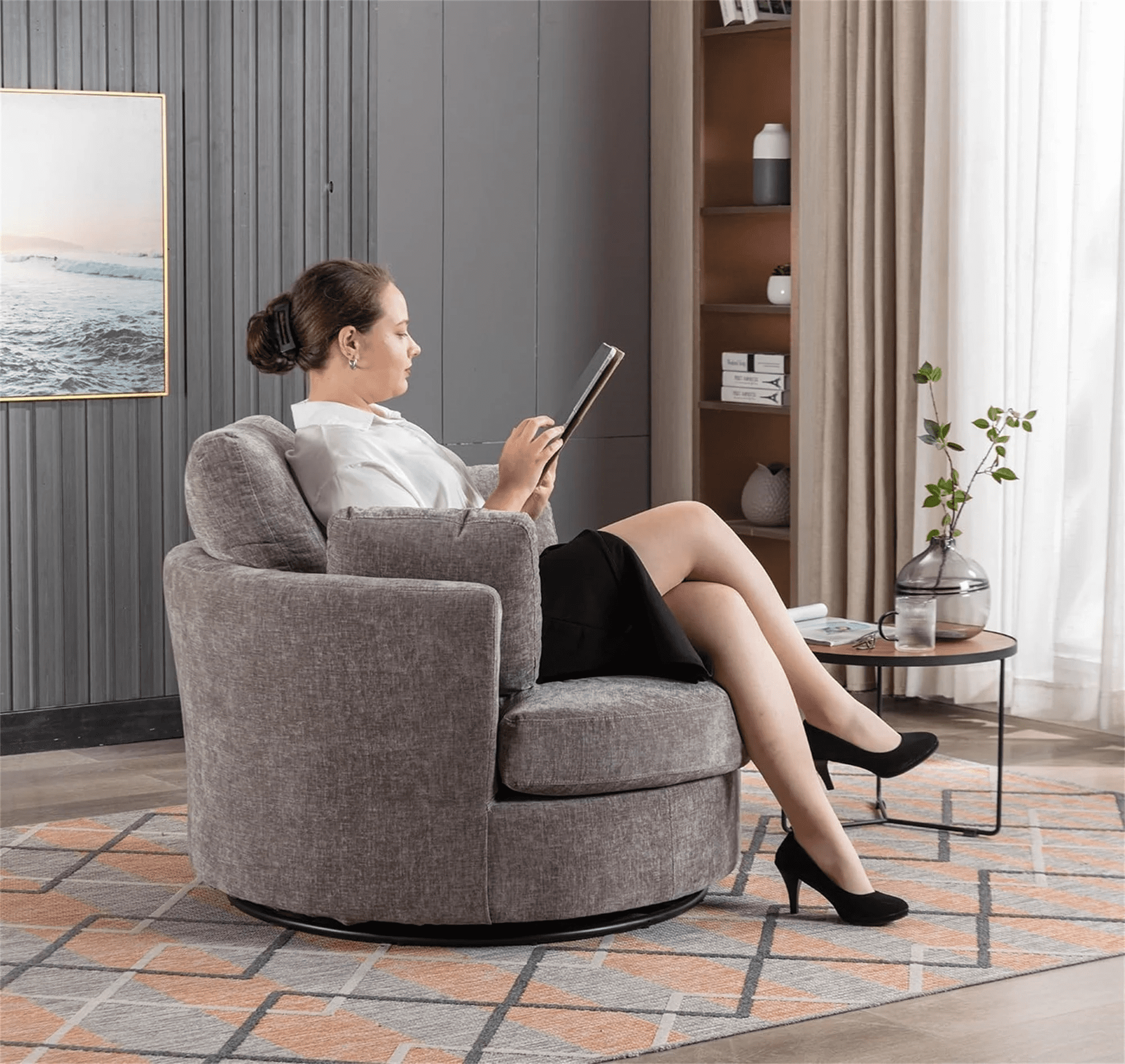Aukfa Swivel Accent Chair, 42″ Oversized Barrel Chair Read Chair for Living Room, Chenille, Gray