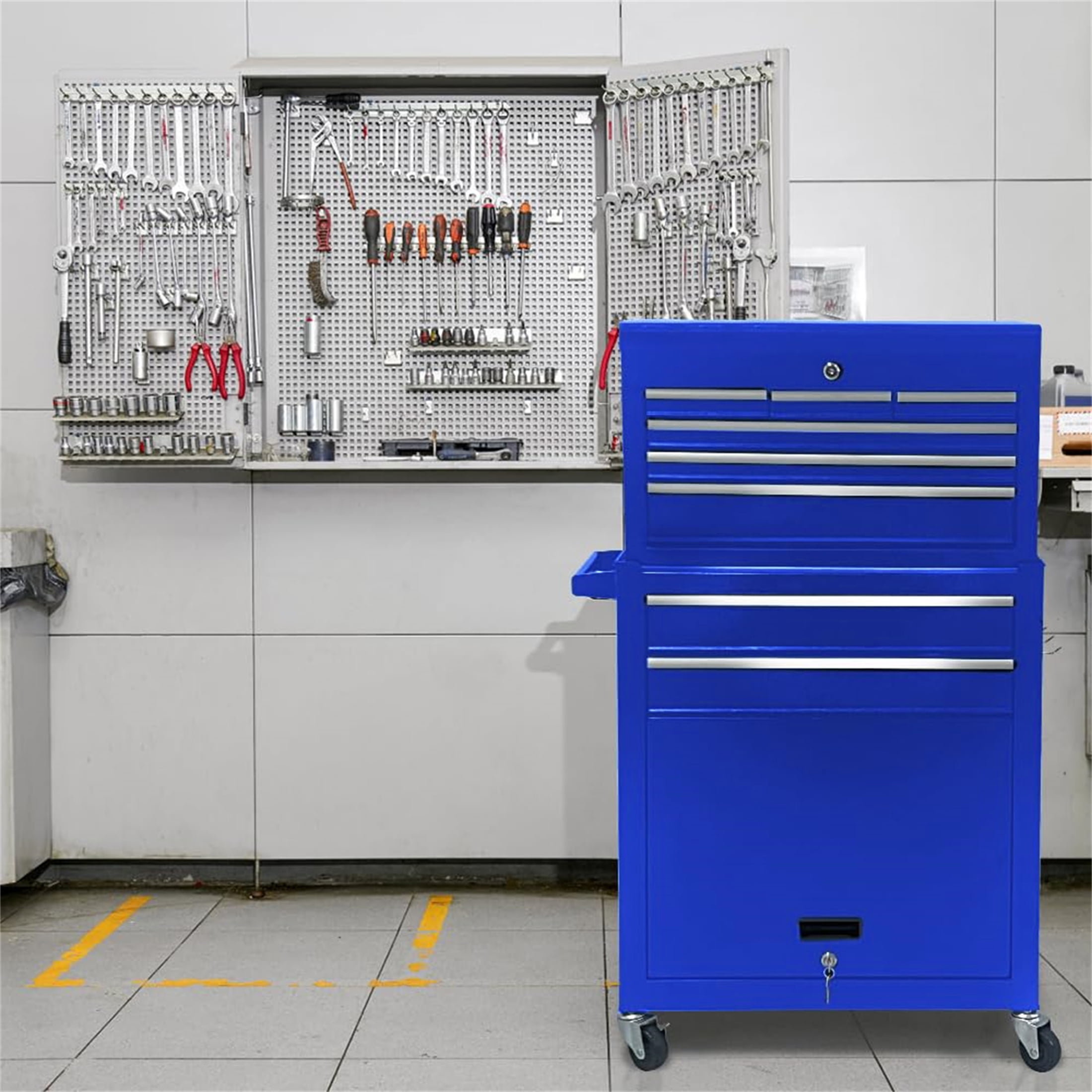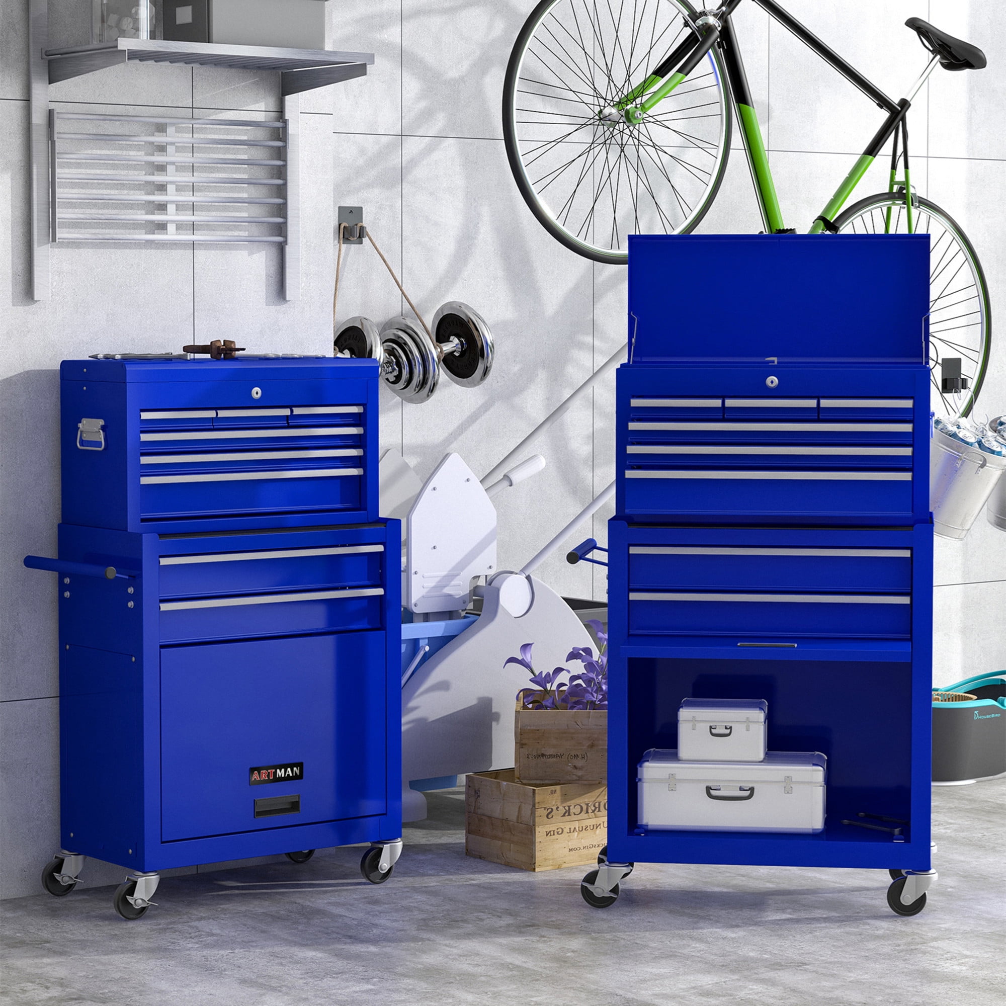 Aukfa Tool Box, 2 in 1 Steel Rolling Tool Chest & Cabinet on Wheels for Garage, 8-Drawers, Blue