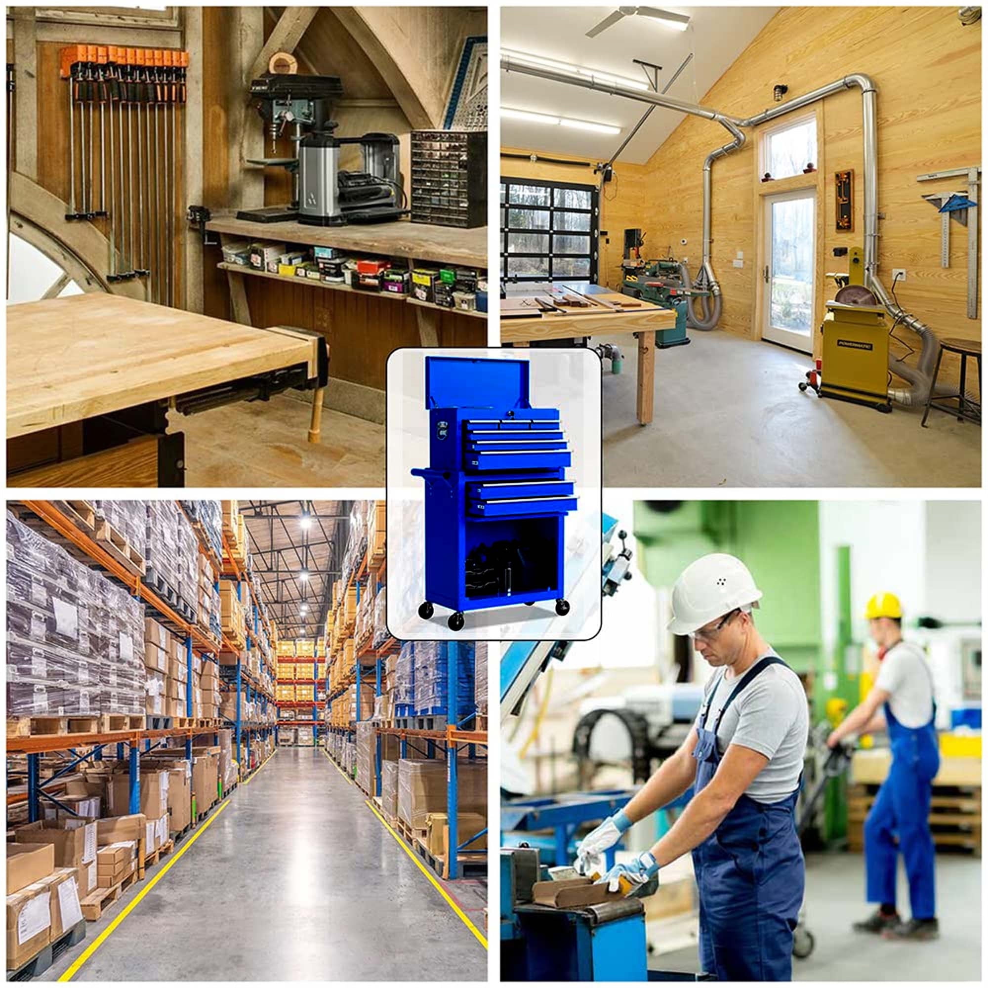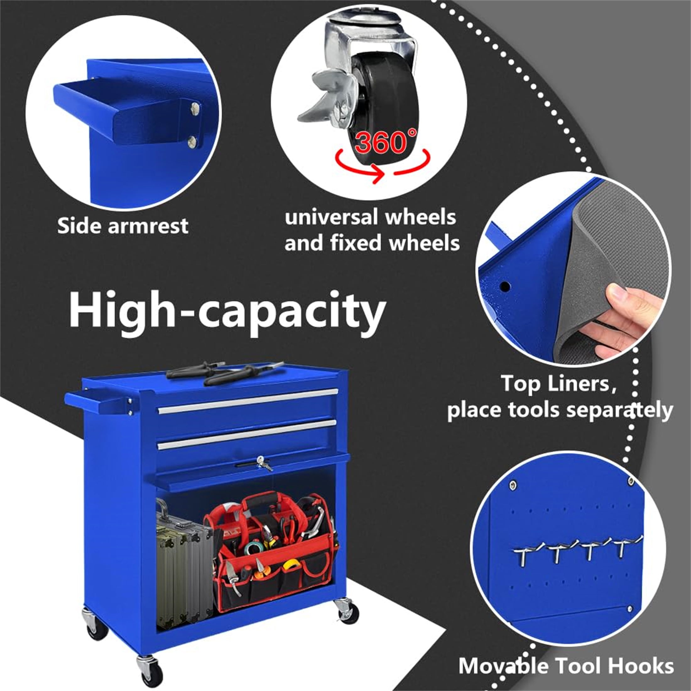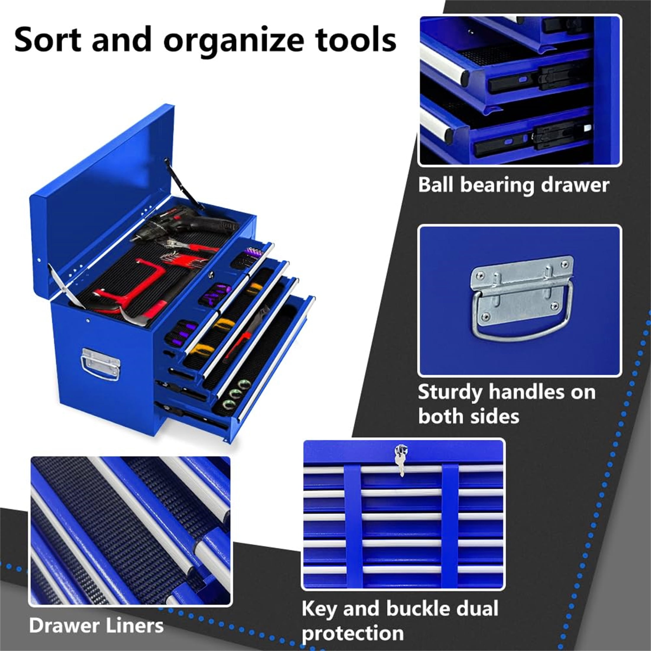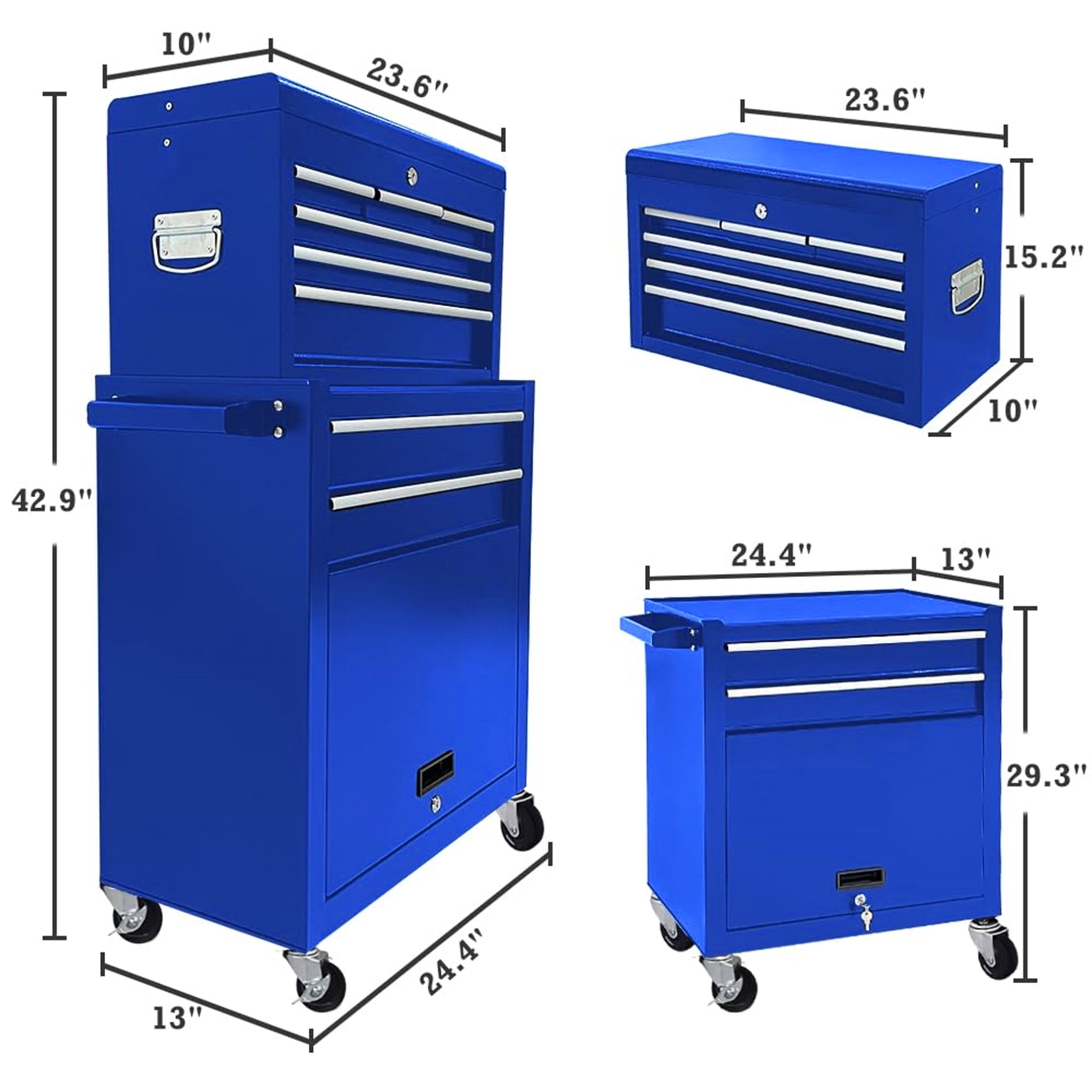 MULTI-PURPOSE TOOL CHEST – The Aukfa AK-HTS1-011 2 in 1 rolling tool chest uses the removable design of the upper tool box and bottom tool cabinet separation, you can use them separately according to different situations and is suitable for workshop, garage, warehouse, and other professional scenarios. (Tips: For the convenience of transportation, we placed the top of the toolbox at the bottom of the toolbox.) PREMIUM MATERIALS – The tool chest is made of high-quality cold-rolled steel. The tool chest is sturdy, and not easy to deform or bend. And the tool chest is coated with an anti-corrosion paint surface which is waterproof and rustproof. Design to organize and store tools better! Perfect for any kind of project – DIY projects, home improvement, auto mechanics, and more. HIGH CAPACITY – The rolling tool chest with wheels has 8 drawers and 1 large bottom cabinet, which has various spaces to store various tools. Each drawer of the toolbox is equipped with an anti-slip mat to prevent your tools from being lost. CONVENIENCE TO USE – The rolling tool box is equipped with handles on the left sides and the tool chest is equipped with push handles for your convenience. And the tool chest has two locks system that you can lock when not in use to prevent tools from being lost. EASY TO MOVE – The rolling tool chest has 4 wheels, including 2 directional wheels, and 2 brake wheels, so you can use it even on sloping ground. The 4 wheels are made of rubber and plastic composite material, which are less prone to damage and deformation. Overall: 24.2” L x 13” D x 42.8” H Overall Product Weight: 61.7 lb Box Size: 26.4” L x 14.6” W x 27.9″ H;68.3 lb Product Type: Rolling Tool Box Primary Material: Steel Locking System: Yes Drawers Included: Yes Number of Drawers: 8 Ball-Bearing Drawer Glides: Yes Color: Blue Drawer Liner Included: Yes Soft Close or Self Close Drawer Glides: Yes Wheels Included: Yes Locking Casters/Wheels: Yes Removable Casters/Wheels: Yes Cabinet: Yes Shelves Included: Yes Number of Shelves: 1 Legs Included: No Power Strip Included: No Side Push Handles: Yes Supplier Intended and Approved Use: Residential Use Weight Capacity: 220 lbs Powder Coated: Yes Drawer Slide: Soft Close; Ball Bearing Worktop Material: Steel Adjustable Shelves: Yes Assembly Required: Yes Installation Location: Wheels; Side Push Handles Product Warranty: Yes Full or Limited Warranty: Full Warranty Length: 90 Days