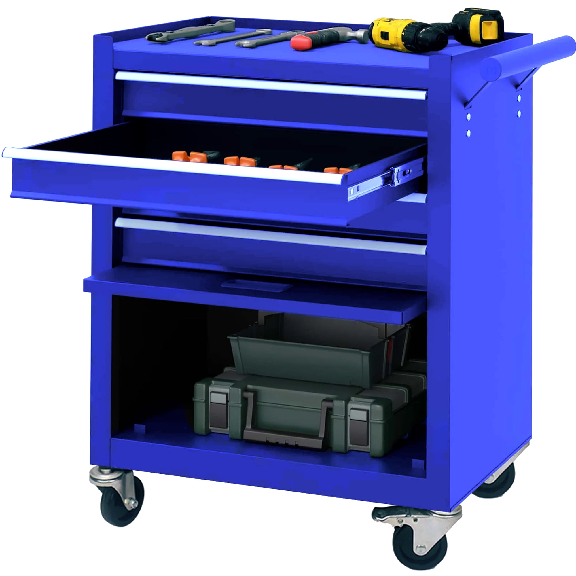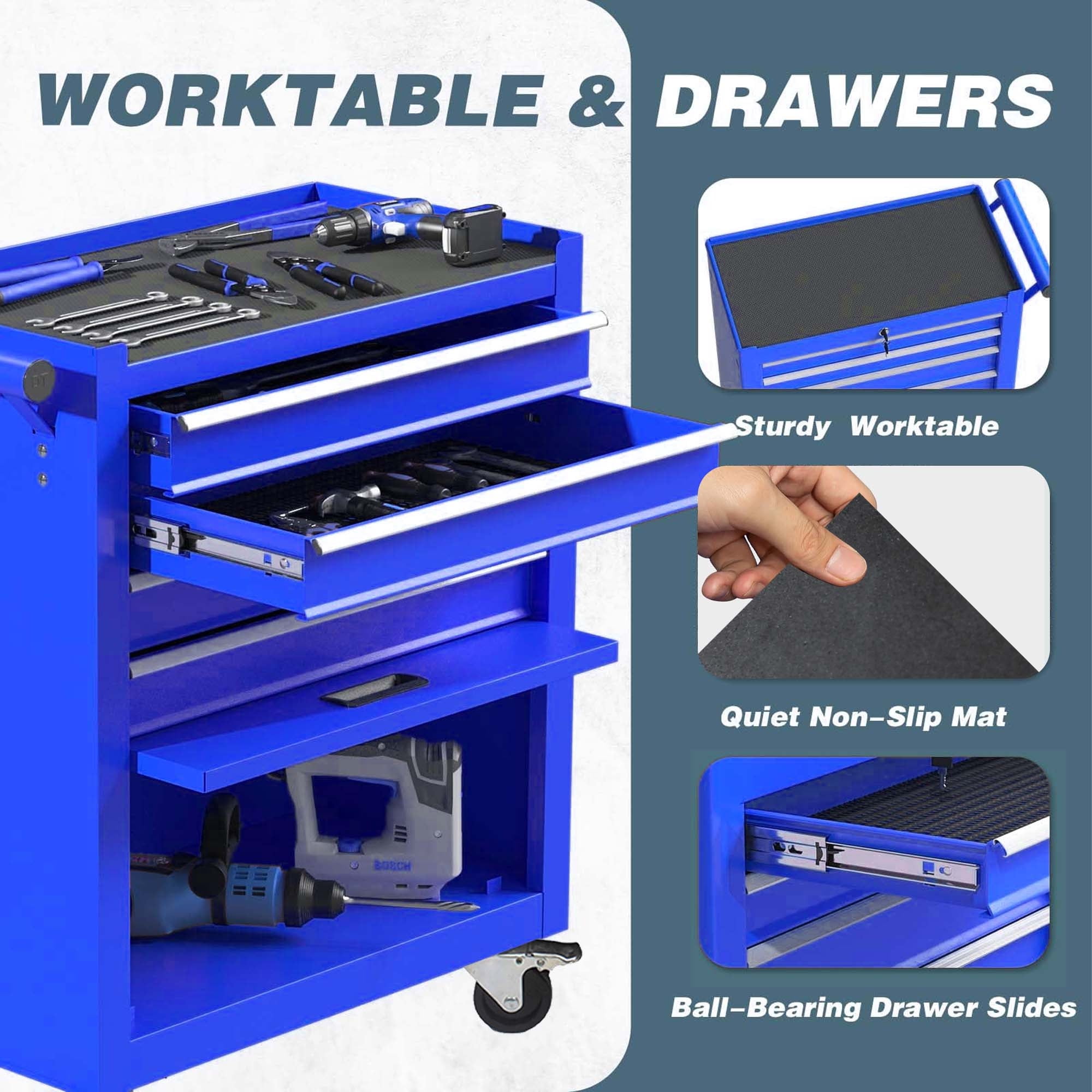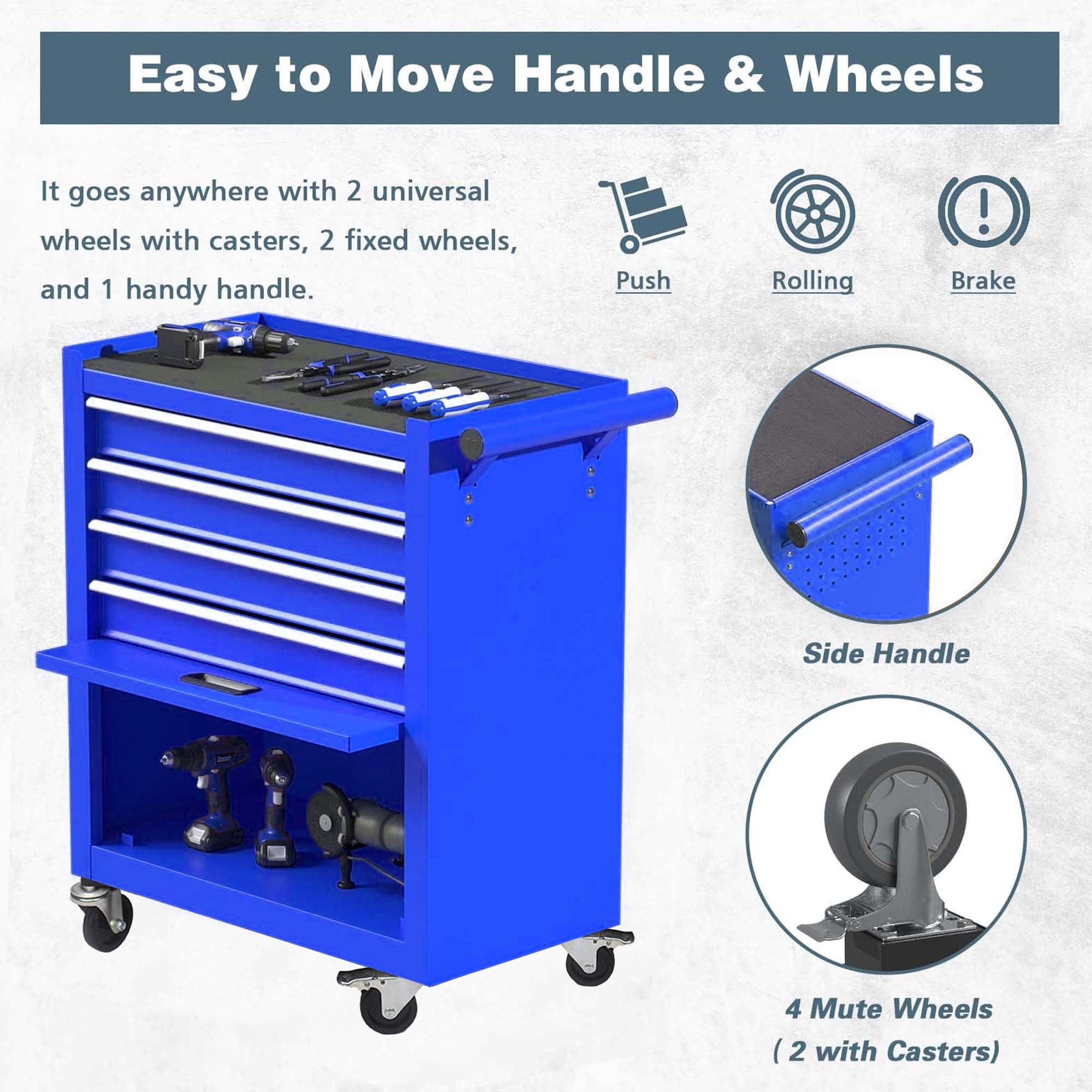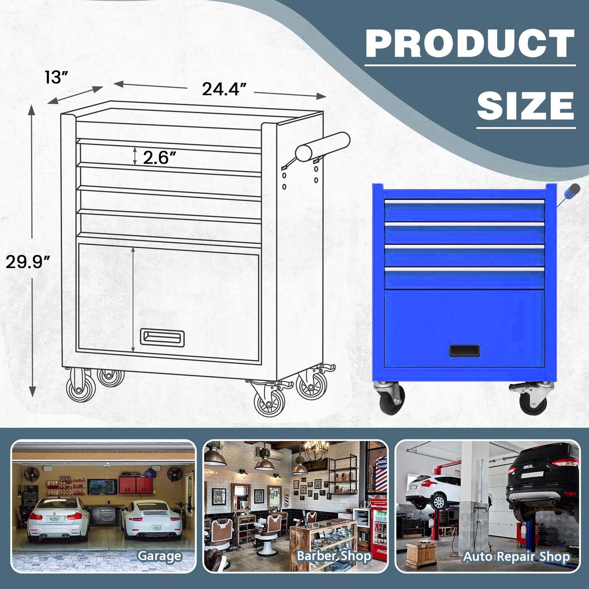 CONVENIENT STORAGE SOLUTION – Our AK-HTS1-005 rolling tool chest offers ample space to organize and store your tools, ensuring easy access and efficient workflow in your garage or workshop. ANTI-RUST MATERIAL – This tool box is made of high quality metal steel material, has a stable construction, prevents scratching, denting, and chipping, more durable; adopts a powder coat, classic neutral color, beautiful and anti-rust. LARGE HIGH CAPACITY – The rolling toolbox has 4 sliding drawers and 1 bottom cabinet, to store different size tools and meet your needs. Each drawer is designed with a liner to prevent scratches. EASY MOVING & SECURE STORING – Our general tool cart can be easily moved and stored because there are 4 universal casters, 2 of which are braked. Also, the side with handles, helps you to move forward. MUTI-PURPOSE GIFT – It is a Christmas gift, and it is a holiday tool organizer for husbands and women. With classic color and unique appearance, lockable tool chests can be furniture for your home, garage, warehouse, shop, etc. PRODUCT INFORMATION Overall: 24.2” L x 13” D x 29.9” H Overall Product Weight: 41.9 lb Box Size: 29” L x 26.9” W x 15″ H;52.2 lb Features Product Type: Rolling Tool Box Primary Material: Steel Locking System: Yes Drawers Included: Yes Number of Drawers: 4 Ball-Bearing Drawer Glides: Yes Color: Blue Drawer Liner Included: Yes Soft Close or Self Close Drawer Glides: Yes Wheels Included: Yes Locking Casters/Wheels: Yes Removable Casters/ Wheels: Yes Cabinet: Yes Legs Included: No Power Strip Included: No Side Push Handles: Yes Supplier Intended and Approved Use: Residential Use Weight Capacity: 300 lbs Powder Coated: Yes Drawer Slide: Soft Close; Ball Bearing Worktop Material: Steel Assembly Assembly Required: Yes Installation Location: Wheels;Side Push Handles Warranty Product Warranty: Yes Full or Limited Warranty: Full Warranty Length: 90 Days Warranty Product Warranty: Yes Full or Limited Warranty: Full Warranty Length: 90 Days