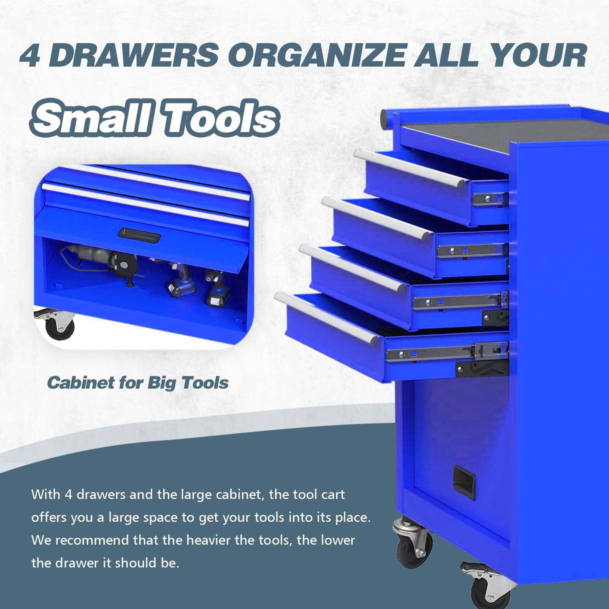 Aukfa Tool Chest, 24.5 in Steel Rolling Tool Box & Cabinet On Wheels for Garage, 4-Drawer, Blue