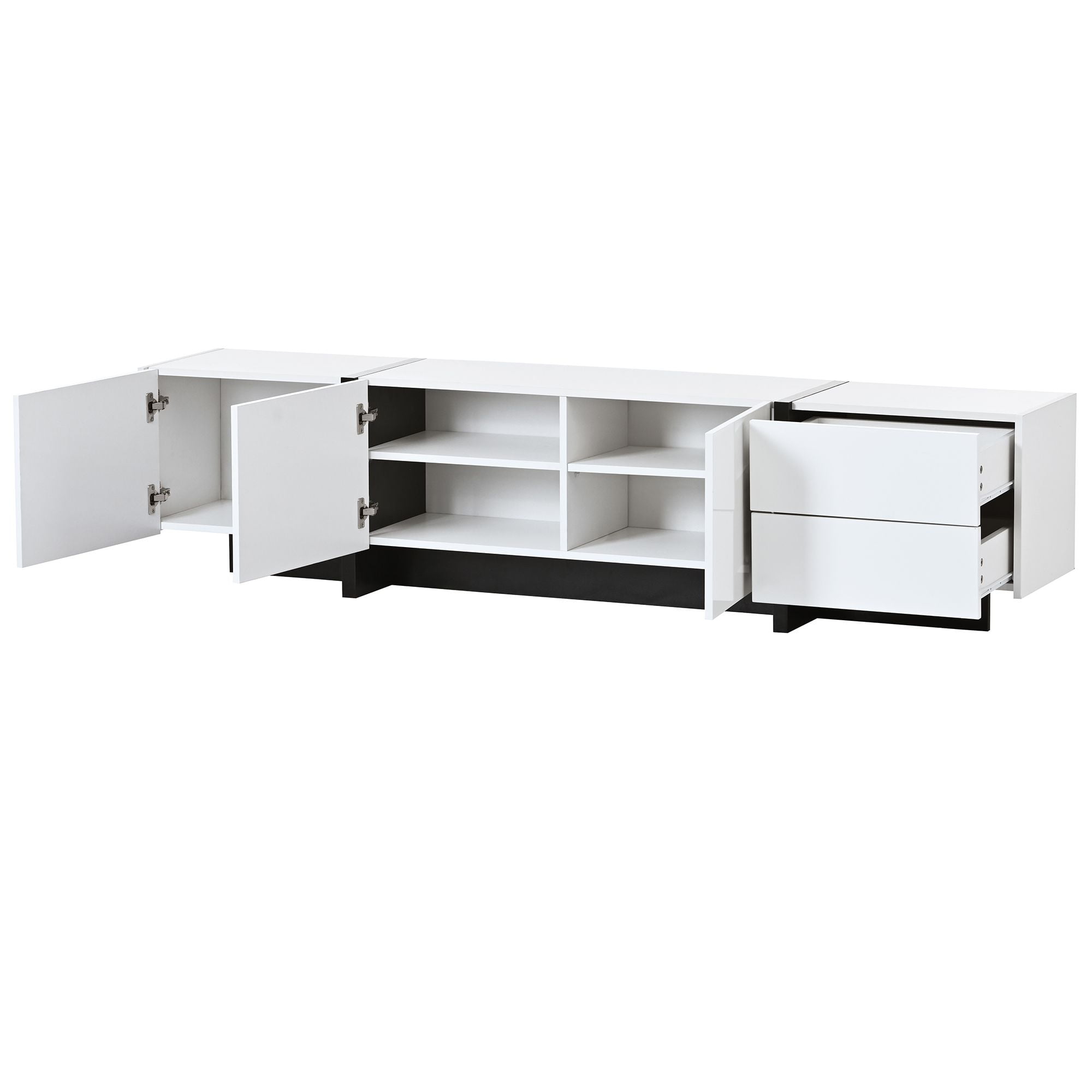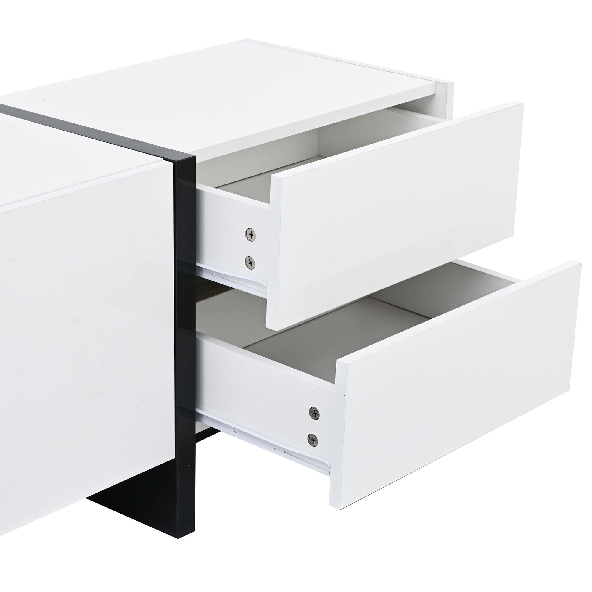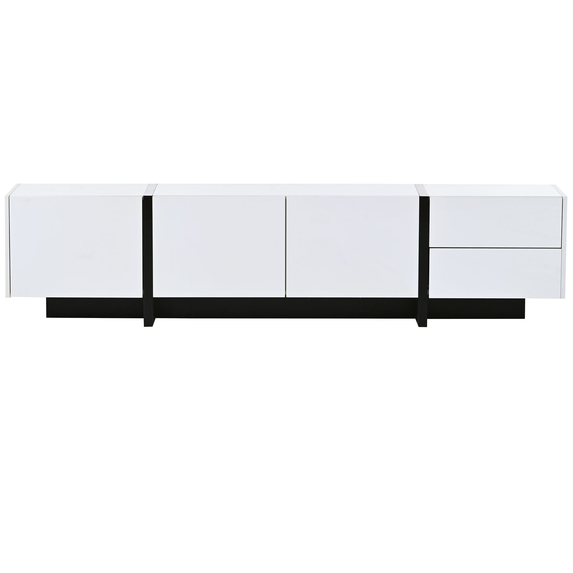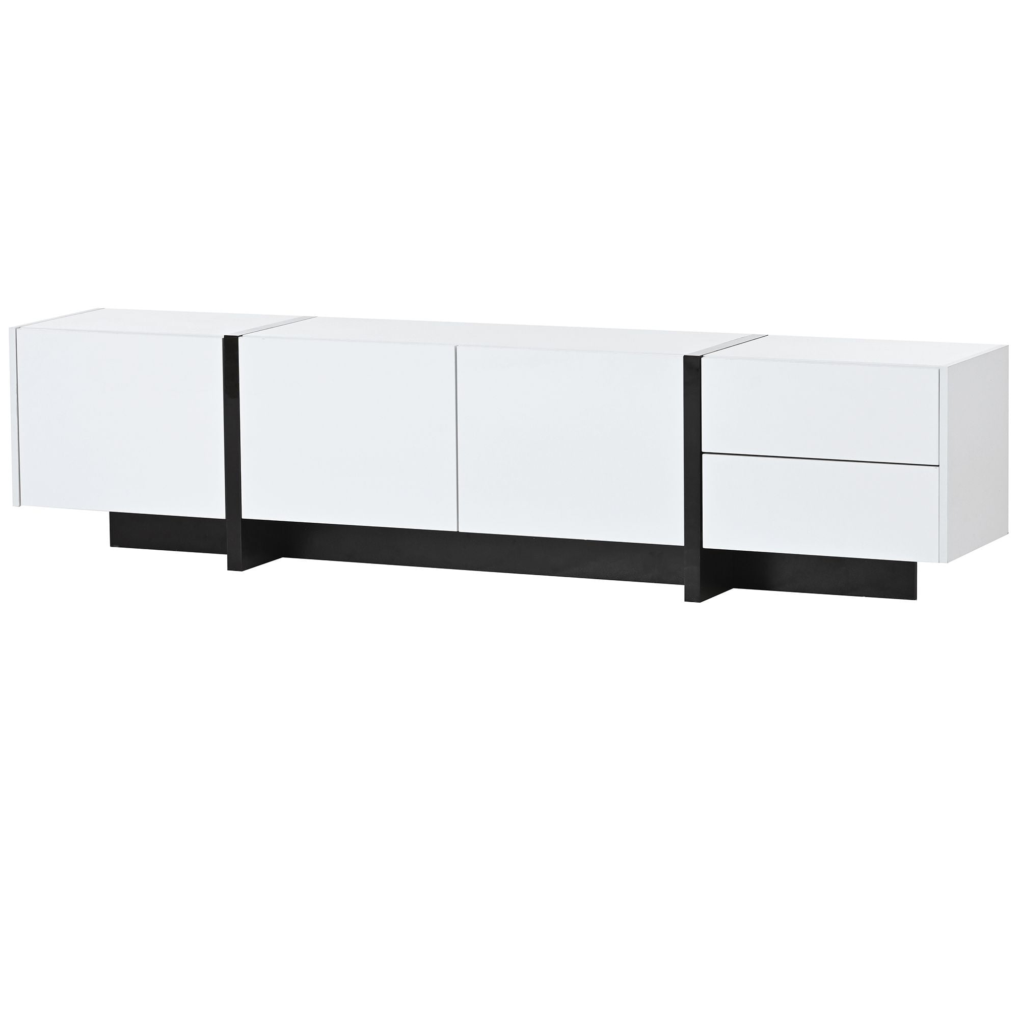 CONTEMPORARY DESIGN – The white table body is separated by two black straight lines, which brings more layers visually. The UV surface also provides a light luxury style to your space. GREAT STORAGE CAPACITY – This AK-FT01-072 TV console features 2 small drawers and 3 big cabinets, providing plenty of room for your different items. Overall size: 74.8”W x 13.7”D x 17.7”H. Load-bearing: 291LBS. TV STAND FOR TV UP TO 80″ – As a modern design TV cabinet for TVs Up to 80”, it can match a variety of interior designs, and it is also a good choice if you own a TV in the bedroom. STABLE & DURABLE – To ensure the stability, the main body is manufactured of particle board. High quality hardware accessories ensure the long-term usage. EASY INSTALLATION – The assembly process of this budget-friendly piece is completed with simple step-by-step instruction. So please read the general assembly guideline in the package before installing it to your living room. Each screw and pin has its own code and clear labels on the board to help you assemble quickly and without difficulties. PRODUCT INFORMATION Overall: 74.8”W x 13.7”D x 17.7”H Side Cabinet: 17.7”W x 12.4”D x 12.2”H Drawer: 15.7”W x 11”D x 3.1”H Table Top Thickness: 0.59inch Overall Product Weight: 90.4 lb. Features Product Type: TV stand Top Shape: Rectangle Furniture Design: Cabinet/Enclosed storage Top Color: White Top Material: Particle Board Base Color: White Drawers Included: Yes Number of Drawers: 2 Cabinets Included: Yes Number of Cabinets :3 Shelves Included: Yes Number of Shelves: 2 Drawer Glide Mechanism: Metal Glides Drawer Glide Material: Metal Tip over Restraint Device Included: NO Product Care: Wipe Clean With a Dry Cloth; Wipe Clean with Damp Cloth Supplier Intended and Approved Use Residential Use; Non Residential Use Table top Weight Capacity: 88LB Side Cabinet Weight Capacity: 44LBS Drawer Weight Capacity: 18LBS Assembly Assembly Required: Yes Level of Assembly: Full Assembly Needed Installation Required: Yes Installation Hardware Included: Yes Warranty Commercial Warranty: Yes Product Warranty: Yes Warranty Length: One Year Full or Limited Warranty: Full PACKAGE INFORMATION: 1 x TV Stand 1 x User Manual:AK_AK-HL04WPB072-W0_PUM_JZ-032323