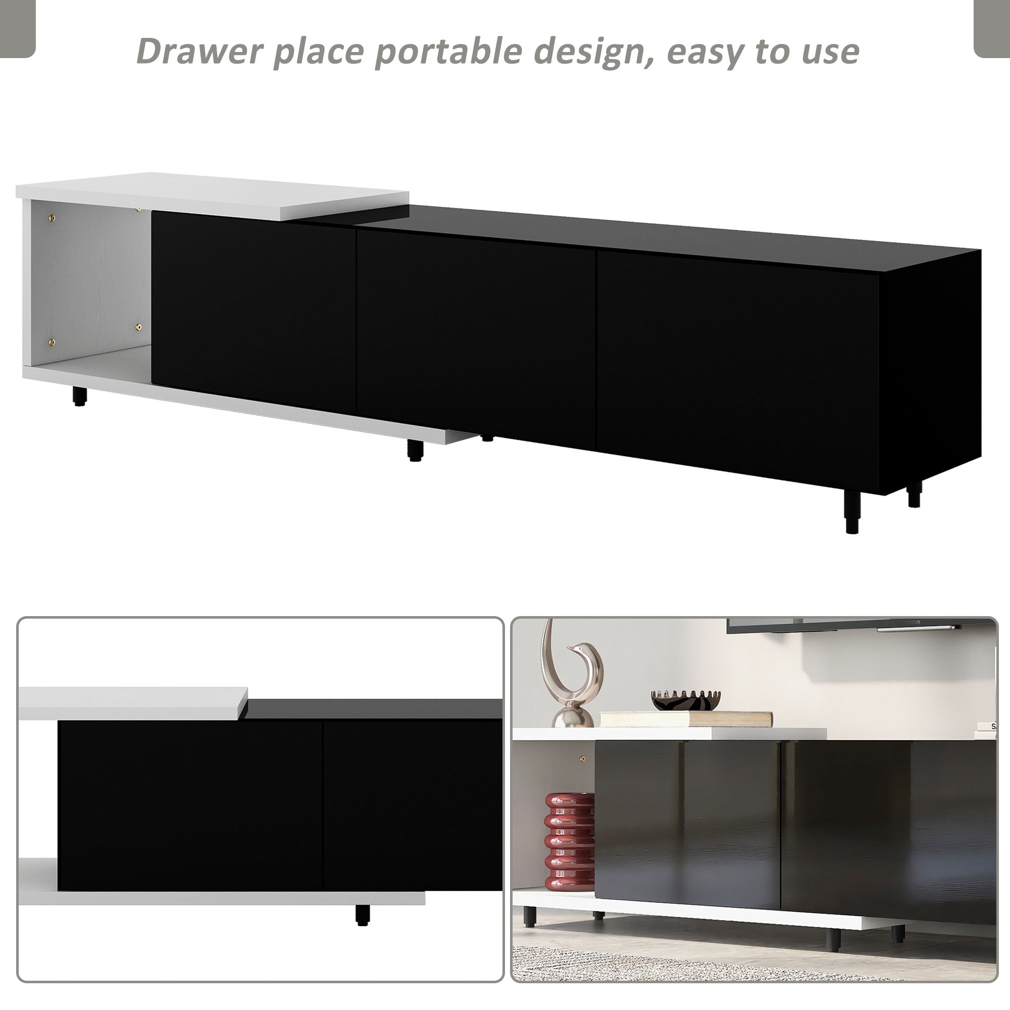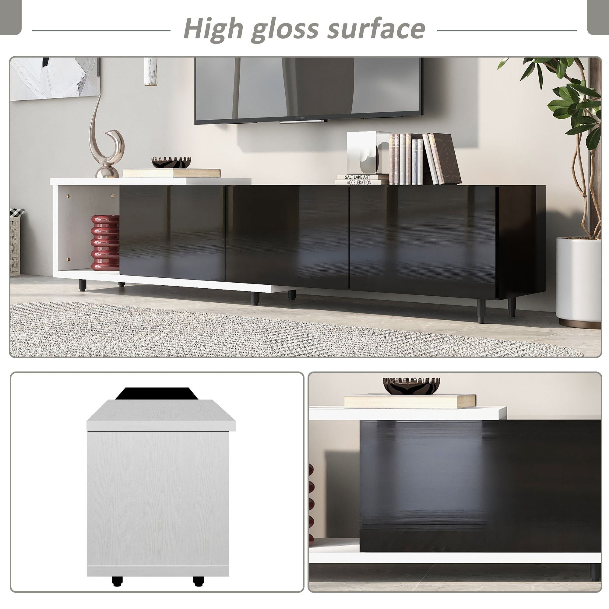Aukfa AK-FT01-019 TV stand brings elegance and modernity to your living room. Particle board with a clean-lined silhouette in black & white lacquered hue fits into your existing arrangement easily. Designed with a smooth and wear-resistant tabletop, this functional TV stand provides plenty of space for the TV screen and decorative accents, while it features 3 large drawers for internal storage. And offers extra and flexible storage space. Stylish, functional, and high-quality, this TV stand is a wise choice for your home furnishings needs.