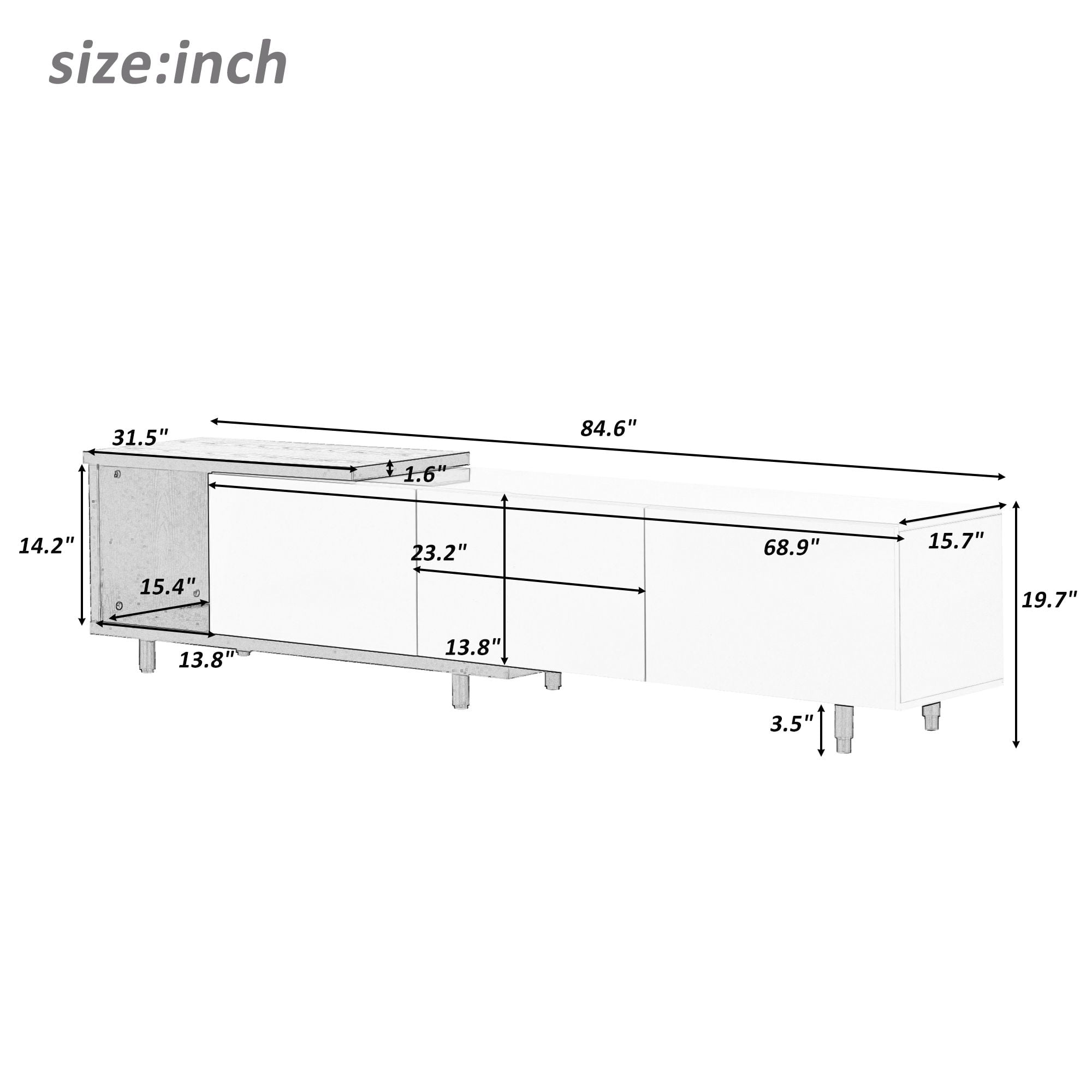 TV STAND FIT TVS UP TO 80″ – Our TV stand is as charming as it is functional. The rectangular media cabinet is smartly designed to display and conceal everything associated with audio, video and gaming. The expansive top holds up to a 80 in TV. LARGE-CAPACITY STORAGE – Three drawers provide adequate storage for remote controls, films, CD players, magazines and other multimedia items. MULTI-FUNCTION USAGE – AK-FT01-019 Television stand can match any style of room decoration perfectly, and also can be used as a media console gaming table. TV cabinet can meet all your display and storage needs. STURDY & DURABLE LIVING ROOM STAND – Environmentally friendly and durable particle board can support the entertainment center for many years.The TV stand can fit a TV set up to 80 inches in size and hold up to 170 pounds. the TV stand will not pinch or make noise when closed. EASY TO ASSEMBLE AND CLEAN – This wood TV stand comes with a clear instruction, which has straight forward illustrations and descriptions. Each screw and pin has its own code to let you easily understand the assembly progress. In addition,its smooth surface is waterproof and easy to keep clean with a damp cloth. PRODUCT INFORMATION Overall:19.7” H x 14.2” W x 84.6” D Top Weight capacity:170 Ibs Shelves Capacity:20 Ibs Drawers Capacity:50 lbs Table Top Thickness:1.6 Inch Clearance-Floor to Bottom:3.5 Inch Overall Product Weight:105 LBS Features Product Type:TV Stand Shelving:Yes Furniture Design:Cabinet/Enclosed storage Top Shape:Rectanole Top color:White Top Material:MDF Base Color:White Base Material:Particle board Purposeful Distressing Type:NO Wheels Included:NO Number of Shelves:1 Shelves Included:Yes Number of Drawers:3 Drawers Included:Yes Cabinets Included:NO Media Storage:Yes Estimated Time to Set Up:1H Eligible for Replacement Parts:Some Eligible for Hardware Packs:Yes Assembly Assembly Required:Yes Level of Assembly:Full Assembly Needed Installation Required:Yes Installation Hardware Included:Yes Warranty Commercial Warranty:Yes Product Warranty:Yes Warranty Length:One Year Full or Limited Warranty:Full PACKAGE INFORMATION: 1 x TV Stand 1 x User Manual:AK_AK-HL04WPB019-K0_PUM_JZ-022323
