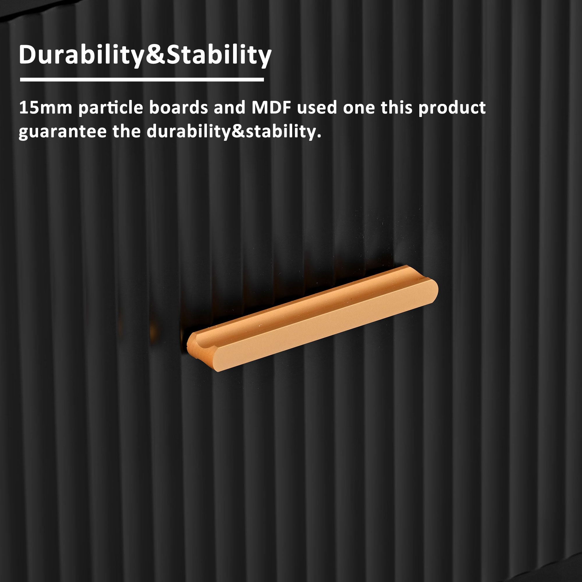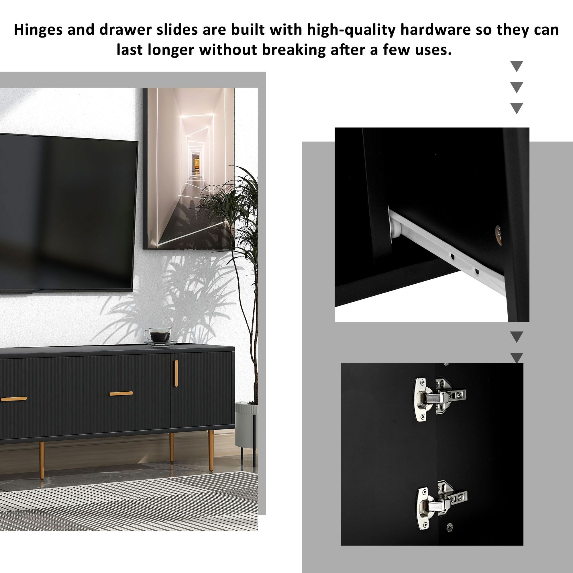 ELEGANT TV STAND FIT TVS UP TO 75″ – The AK-FT01-030 TV stand for 65 inch TV is designed in accent tone combined with a classic style appearance, which creates an attractive frame long tv stand, with elegant round legs, suitable for all style living rooms/bedrooms, not only a under TV console, it can also be used as a console table, home theater cabinet, entertainment center or media table DURABLE&STURDY FRAME – This TV stand with rich textured veneer not only gives an attractive modern look but also features superior stability and its resistance against wear and tear.Five Champagne legs are used, which can make the cabinet stronger. MORE STORAGE SPACE – The TV stand is designed for simplifying your life! With 2 storage and two cabinets.Cable management is included, so cords won’t be tangled, helping media accessories with ventilation and heat dissipation. EASY MAINTAIN MATERIAL – This TV Stand material is 15mm particle bpard,back board is 3mm MDF.Made of wooden structure and easy maintenance. Tides can be easily wiped with a washcloth. EASY TO ASSEMBLE AND CLEAN – This wood TV stand comes with a clear instruction, which has straight forward illustrations and descriptions. Each screw and pin has its own code to let you easily understand the assembly progress. In addition, its smooth surface is waterproof and easy to keep clean with a damp cloth. PRODUCT INFORMATION Overall Size: 19.69” H x 15.75” W x 67” D Top weight Capacity: 66 Ibs Shelves Capacity: 11 Ibs Drawers Capacity: 20 lbs Table Top Thickness: 0.78 Inch Clearance-Floor to Bottom: 5.9 Inch Overall product Weight: 85LBS Features Exterior Shelf Material:Wood Shelving: Yes Furniture Design: Cabinet/Enclosed storage Color: Black Material: MDF Gloss Finish: Yes Cabinets Included: Yes Number of Cabinets: 2 Number of Shelves: 2 Number or Drawers: 2 nterior Shelf Material: Wood Cable Management: Yes Wheels Included: No Built-in Lighting: Yes Bulb Included: Yes Tipover Restraint Device Included: No Shagreen-embossed Exterior: No Supplier Intended and Approved Use: Residential Use; Non Residential Use Imported: Yes Assembly Assembly Required: Yes Level of Assembly: Full Assembly Needed Installation Required: Yes Installation Hardware Included: Yes Warranty Commercial Warranty: Yes Product Warranty Yes Warranty Length: One Year Full or Limited Warranty: Full PACKAGE INFORMATION: 1 x TV Stand 1 x User Manual:AK_AK-HL04WX1030-K0_PUM_JZ-030223