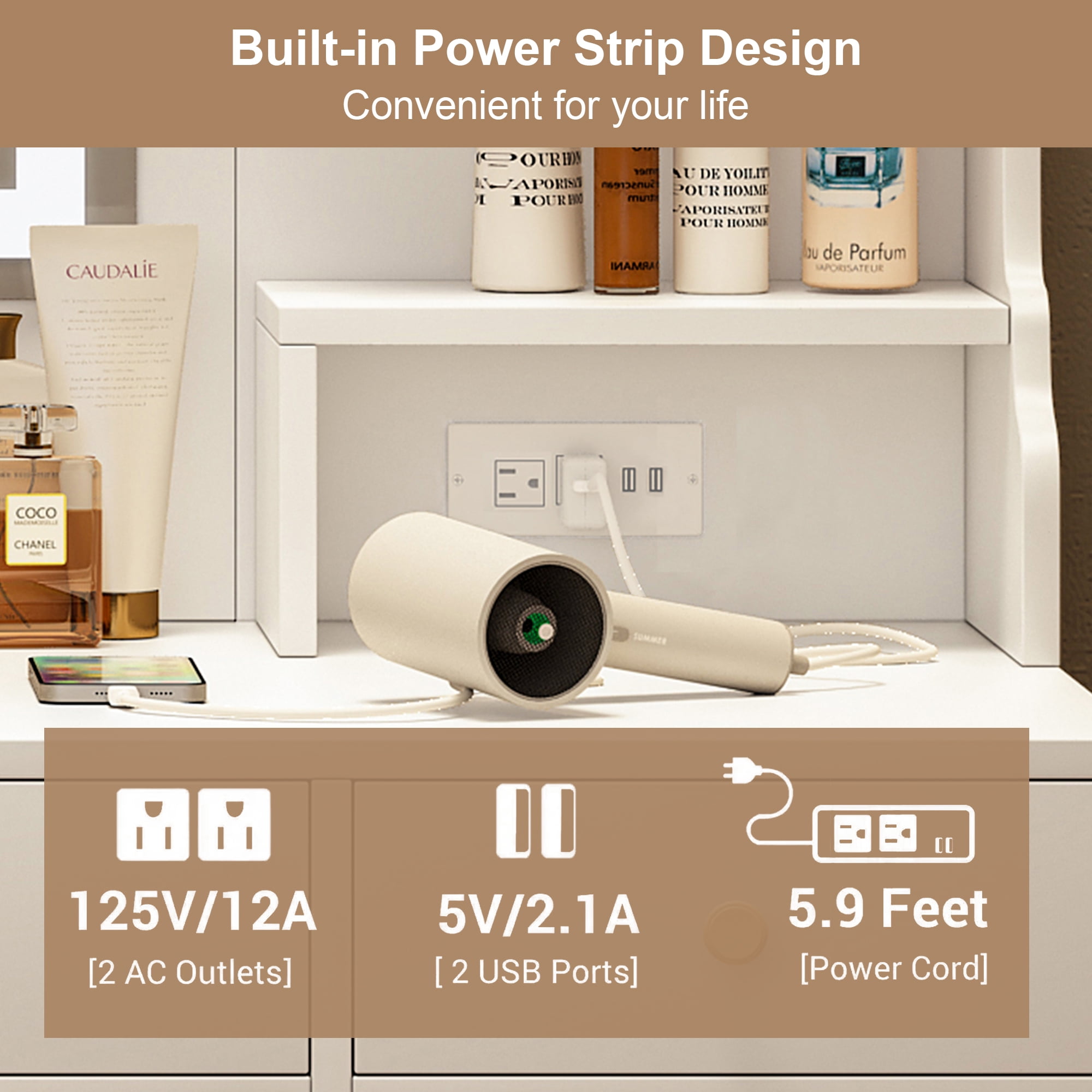 3 LIGHTING MODES & BRIGHTNESS ADJUSTABLE – Equipped with a large mirror and LED bulbs, this vanity table offers bright and soft lighting for a star-like makeup experience. Choose from three light colors: warm yellow, warm white, and cool white, each with adjustable brightness to suit different environments and makeup needs. POWER STRIP WITH USB PORTS & OUTLETS -Conveniently charge your electronics with the built-in power strip on the 3-drawer cabinet. The charging station includes 2 USB ports and 2 sockets, allowing you to easily use devices like curling irons or hair dryers while seated at the vanity. VANITY AND NIGHTSTAND 2-IN-1 DESIGN – Designed with a bedside table on the right side, this lighted makeup vanity can double as a nightstand. Place it next to your bed for dual functionality, saving space and money while enhancing your room’s layout. POWERFUL STORAGE CAPACITY -Keep your cosmetics organized with the vanity’s ample storage options. It features two desktop drawers, three side drawers, and shelves above the desktop, providing both hidden and open storage spaces to maintain a neat and tidy workspace. EASY ASSEMBLY – The vanity set comes with detailed paper instructions and all hardware pieces are perfectly labeled. For a smooth assembly process, it is recommended to lay out all the pieces according to their numbers before putting them together. This ensures a hassle-free and efficient setup. PRODUCT INFORMATION: Overall: L 41.3″x W 15.7″ x H 59.6″ Overall Product Weight: 94.8 LBS Features: Product Type: Makeup Vanity Desk; Vanity Table Color: White Base Material: MDF Seat Included: No Mirror Included: Yes Mirror Type: Standing Lighted Mirror: Yes Drawers Included: Yes Drawer Glide Mechanism: Roller Glides Supplier Intended and Approved Use: Residential Use Supplier Intended and Approved Use: Residential Use