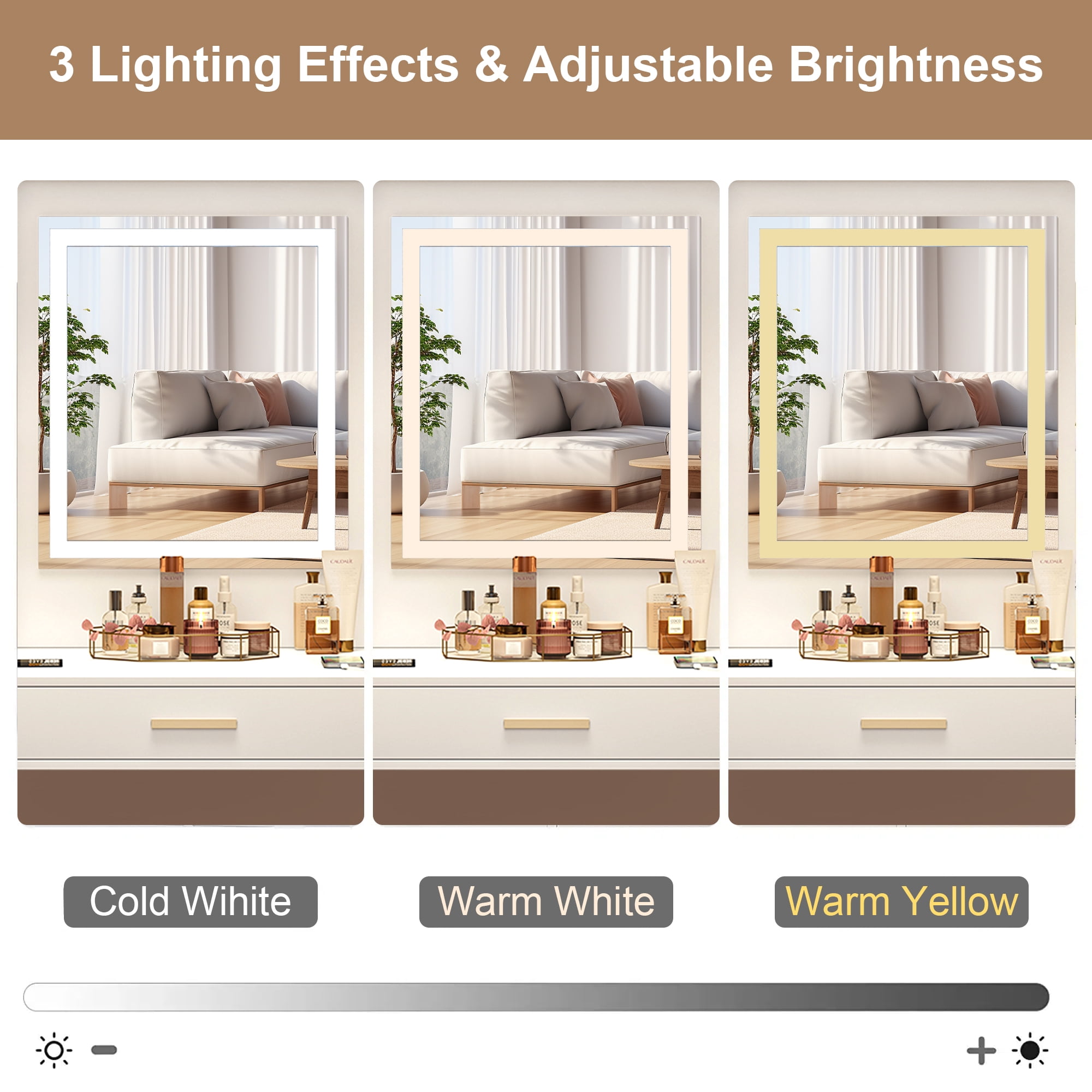 This modern vanity provides ideal lighting for your morning routine. The wide mirror lets you see every angle, and its touch switch lets you customize your self-illumination with 3 color modes of LED bulbs. Made of solid wood, this dresser has drawers for cosmetics, perfume and jewelry. The soft seat is the perfect height and even doubles as storage so you can keep everything in one place. Our vanity combines sophisticated design with functionality to create a perfect beauty space. Experience the ultimate in beauty and elegance with our beautiful dressing tables!