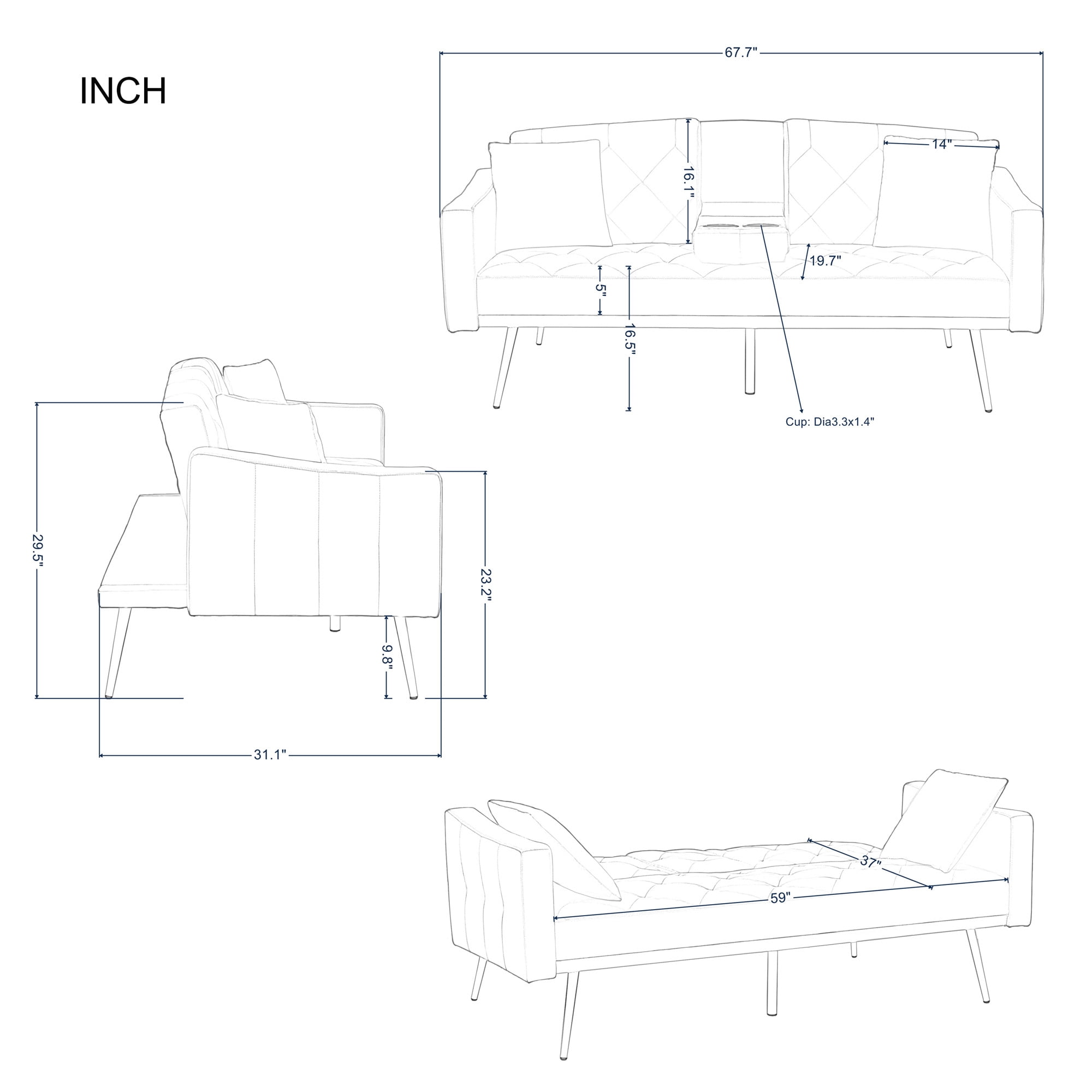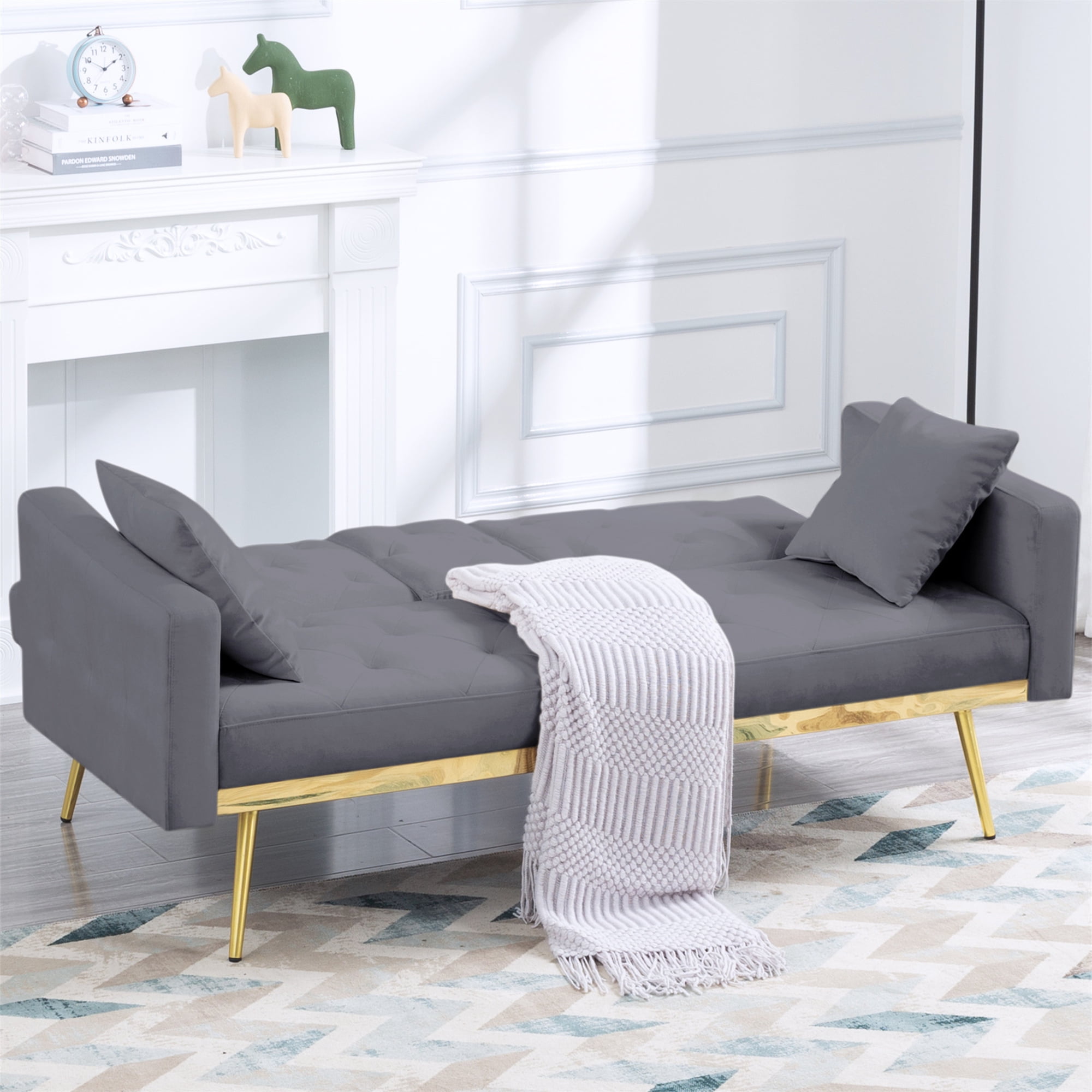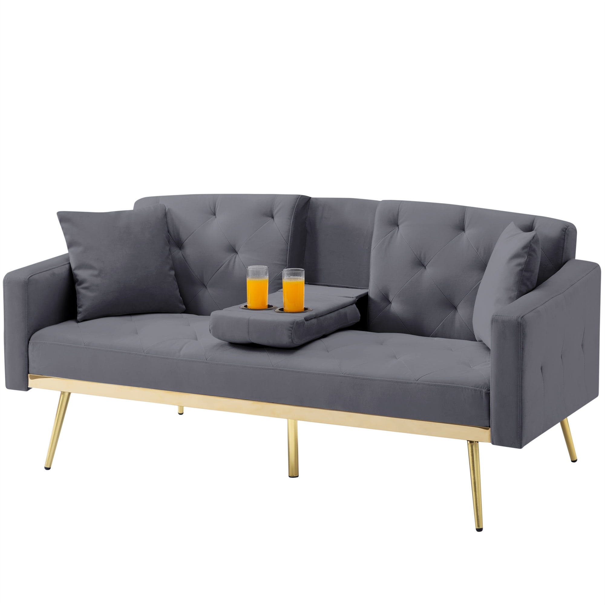 MODERN STYLE AND VERSATILITY – The Aukfa AK-FF01-038 futon sofa bed is designed with a fashionable appearance and modern style, perfect for living room, bedroom, office, apartment, RV, etc. From now on, use it to upgrade and decorate your house! Tips: All accessories, armrests, and legs are hidden in the space at the bottom of the sofa. You can find them by unzipping the zipper. FUTON WITH HIDDEN CUP HOLDER – Folding middle armrest with 2 cup holders in the middle of the sofa allows you and your family and friends to enjoy drinks while relaxing. It can make it more convenient for you and your family to drink while watching a sports game. DURABLE MATERIALS – Elevated on 5 gold metal legs, This futon sofa bed is constructed of a manufactured wood frame, velvet fabric upholstery, foam fill, and metal zig zag springs for robust structure and unmatched durability. 2 pillows are included. 3-IN-1 DESIGN FUTON – The space saving futon sofa bed features a folding contraption to lock the back at 105 degrees for reading/TV or 140 degrees for lounging and lay down the back as a 66″ long by 37″ wide twin size bed. ON-TREND ADDITION – Solid-hued upholstery, sleek lines and gleaming metal legs give out an understated yet contemporary appeal, while tufted details lend a touch of texture to the futon sofa bed. The neutral color tone will not easily clash with your existing color palette. SPECIFICATION: PRODUCT INFORMATION Overall: 67.7″L x 31.1″W x 29.5″H. Open size – sleeper: 67.7″L x 37″W Back Cushion: 16.1”H Seat Width: 59” Seat Depth: 19.7” Seat High: 16.5” Leg High: 9.8” Minimum Door Width: 20” Product Weight: 74.8 lbs Carton Size: 61.02”L x 37.8” W x 7.09”H. 83.77 lbs Features Product Type: Futon Sofa Bed Seating Capacity: 2 Frame Material: Wood Weight Capacity: 600 lb Sleeper Size: Twin Upholstery Material: 100% Velvet Tufted: Yes 2 Toss Pillows Included: Yes Upholstery Color: Gray Fill Material: Foam Seat Fill Material: Foam + Sinuous Spring Arm Type: Square arms Supplier Intended and Approved Use: Residential Use Leg Material: Metal Leg Color: Gold Back Type: Tufted Back Position Lock: Yes Cushion Construction: Foam Product Care: Wipe clean with dry cloth, do not use strong liquid cleaners Assembly Assembly Required: Yes Level of Assembly: Partial Assembly Warranty Product Warranty: Yes Full or Limited Warranty: Limited Warranty Length: One Year
