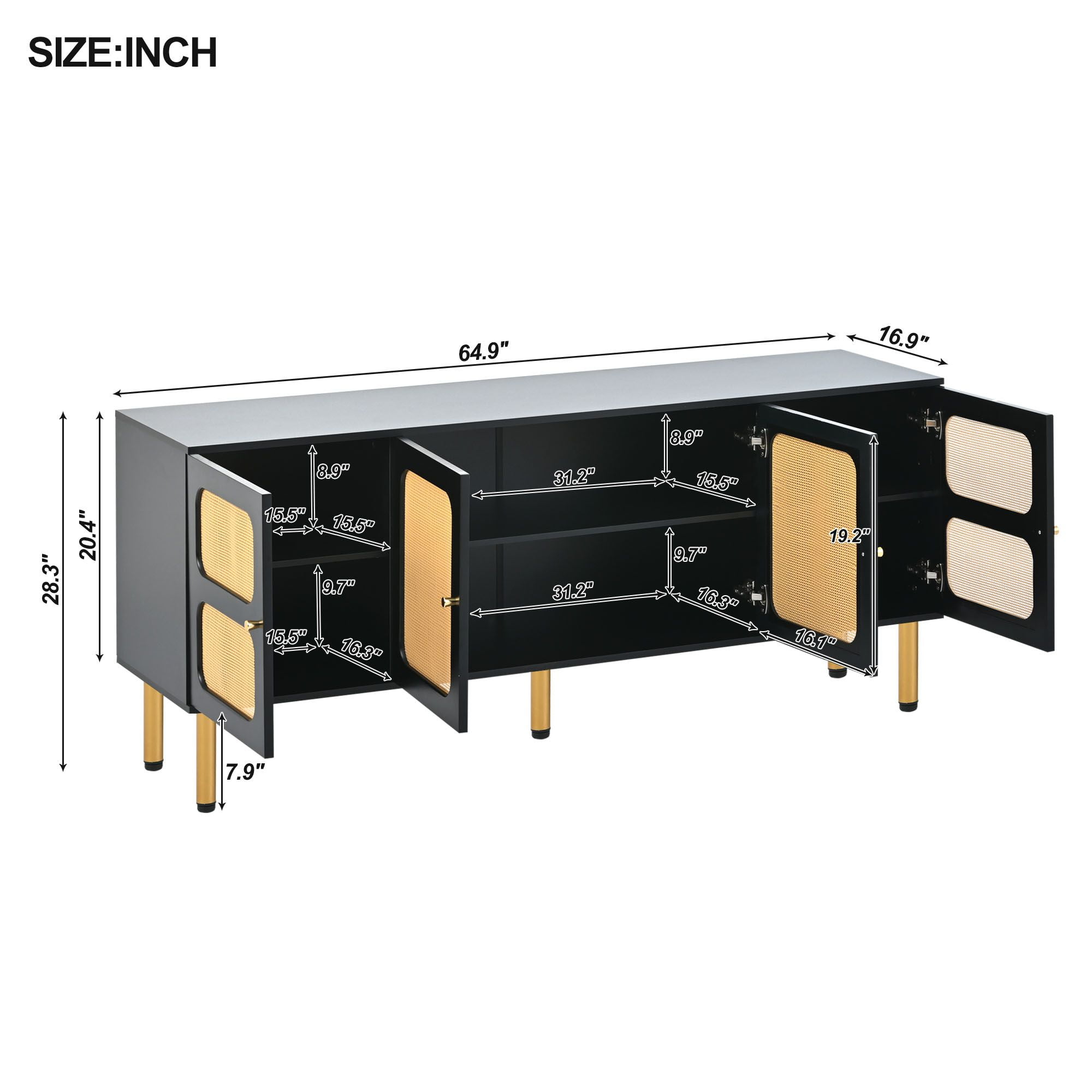 ELEGANT APPEARANCE – The combination of rattan details of texture and gold metal base is a modern interpretation of country style, bringing visual enjoyment to your space.The stylish wooden round handles on each doors not only provide convenience for opening the cabinet door, but also adds excellent aesthetics. UNIVERSAL DESIGN – It not only can be used as a TV stand for TVs up to 70”, but can be placed in the hallway or living room as an attractive and practical side board. GREAT STORAGE CAPACITY – This AK-FT01-065 TV stand features 2 small cabinets and a big middle cabinet with adjustable shelves, providing plenty of room for your items.providing plenty of room for your television, consoles, media cases, remotes and more. STABILITY & DURABILITY – To ensure the stability, the main body is manufactured of MDF. High quality hardware accessories ensure the long-term usage. EASY TO ASSEMBLE AND CLEAN – This wood TV stand comes with a clear instruction, which has straight forward illustrations and descriptions. Each screw and pin has its own code to let you easily understand the assembly progress. In addition, its smooth surface is waterproof and easy to keep clean with a damp cloth. PRODUCT INFORMATION Overall Size: 64.9”W x 16.9”D x 28.3”H Maximum TV Screen Size Accommodated: 70 inches Table Top Thickness: 0.59inch Clearance – Floor to Bottom: 7.95inch Load-bearing: 176.37LBS Overall product Weight: 79.3 lbs. Features Product Type: TV stand Top Shape: Rectangle Furniture Design: Open shelving; Cabinet/Enclosed storage Top Color: Black Top Material: MDF Top Finish Application: Veneer Base Color: Black+Brown Base Material: Metal Base Finish Application: Painting Built-In Lighting: Yes Table top Weight Capacity: 44lbs Middle shelf Weight Capacity: 22LBS Side shelf Weight Capacity: 33LBS Shelves Included: Yes Number of Shelves: 3 Supplier Intended and Approved Use: Residential Use; Non Residential Use Assembly Assembly Required: Yes Level of Assembly: Full Assembly Needed Installation Required: Yes Installation Hardware Included: Yes Warranty Commercial Warranty: Yes Product Warranty: Yes Warranty Length: One Year Full or Limited Warranty: Full PACKAGE INFORMATION: 1 x TV Stand 1 x User Manual:AK_AK-HL04WX1065-K0_PUM_JZ-032023