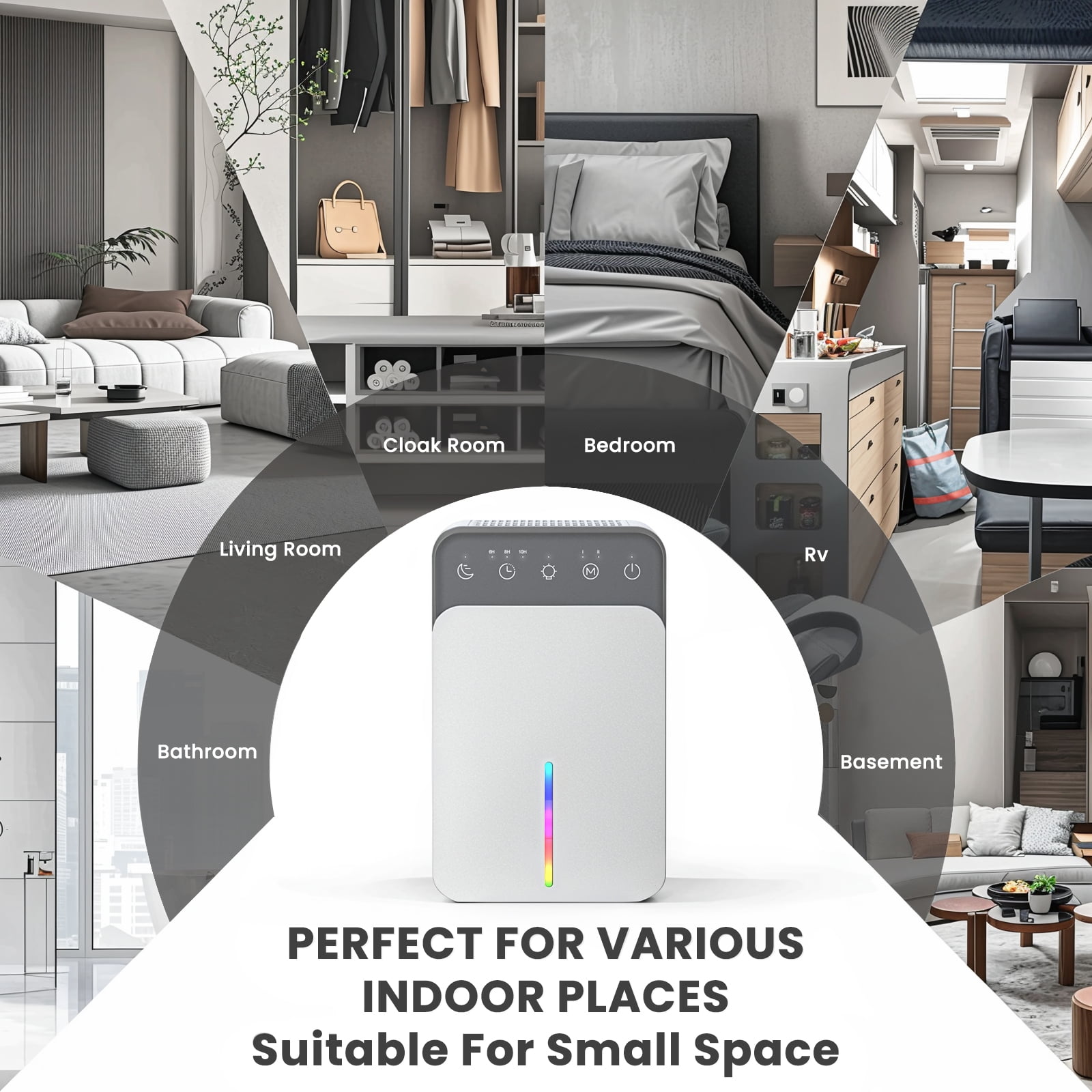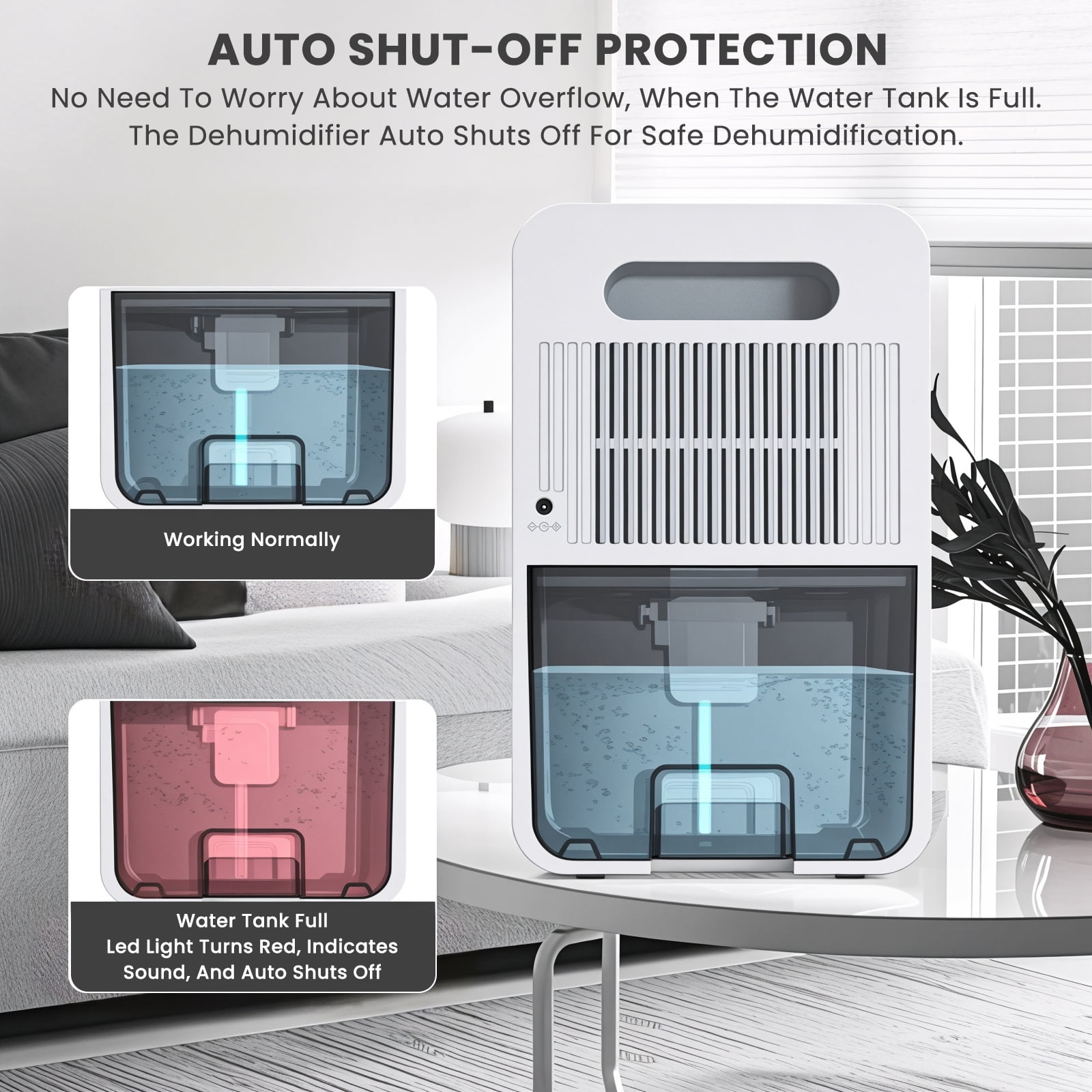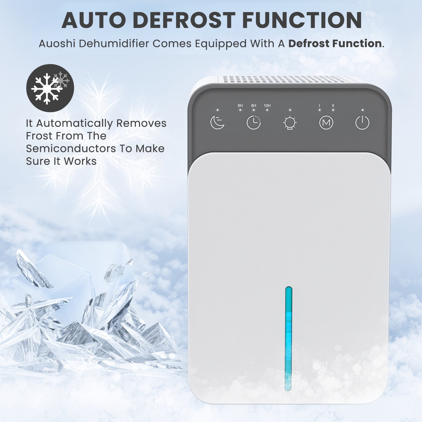 【HIGHLY EFFICIENT DEHUMIDIFIER】The AUOSHI dehumidifier employs advanced semiconductor condensation technology for superior moisture removal. Ideal for spaces up to 500 sq.ft., it maintains humidity below 45%, ensuring a comfortable home environment. 【52.8 oz LARGE CAPACITY】 This dehumidifier ensures extended operation, Featuring a 1500 ml (52.8 oz) large capacity water tank. The AUTO Shut-Off protection activates when the tank is full, turning on a red warning light and automatically stopping the dehumidifier. 【QUIET SLEEP MODE】Our bedroom dehumidifier features a sleep mode that operates at under 30dB, ensuring a peaceful sleeping environment. With 7 color light modes, it can be personalized for use in the bedroom, basement, or bathroom. 【TIMER FUNCTION】Our dehumidifier for bathroom includes a 4/6/8 hour timer that automatically shuts off at the set time, ensuring it only runs for your specified duration. This feature saves electricity and eliminates the need to manually turn off the dehumidifier. 【AUTO DEFROST FUNCTION】The dehumidifier automatically activates the defrost function when frost is detected. During defrosting, the fan runs continuously while dehumidification pauses to melt the ice. If the ambient temperature drops below 59°F (15°C), the unit will automatically defrost to maintain safe operation. Dehumidification resumes once defrosting is complete.