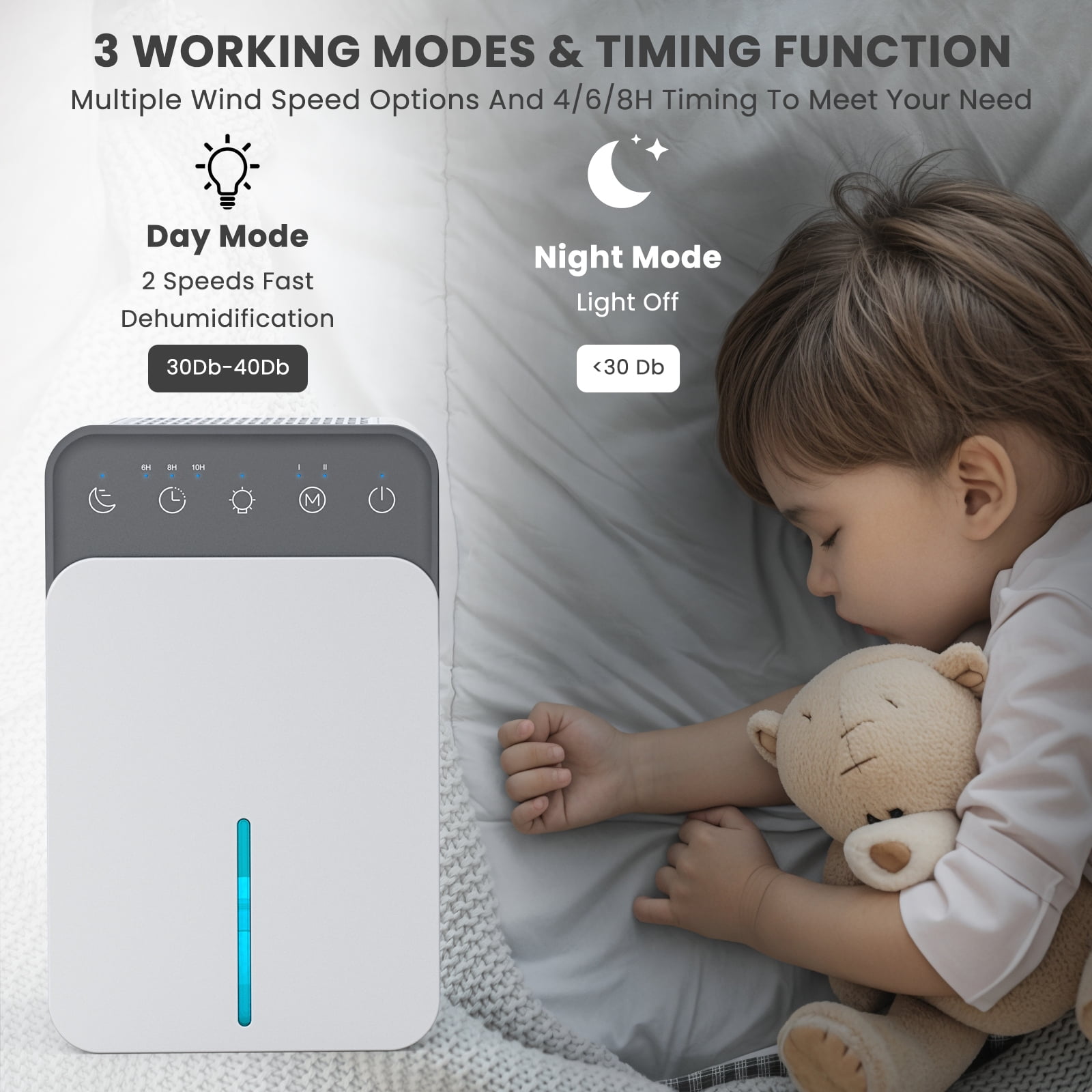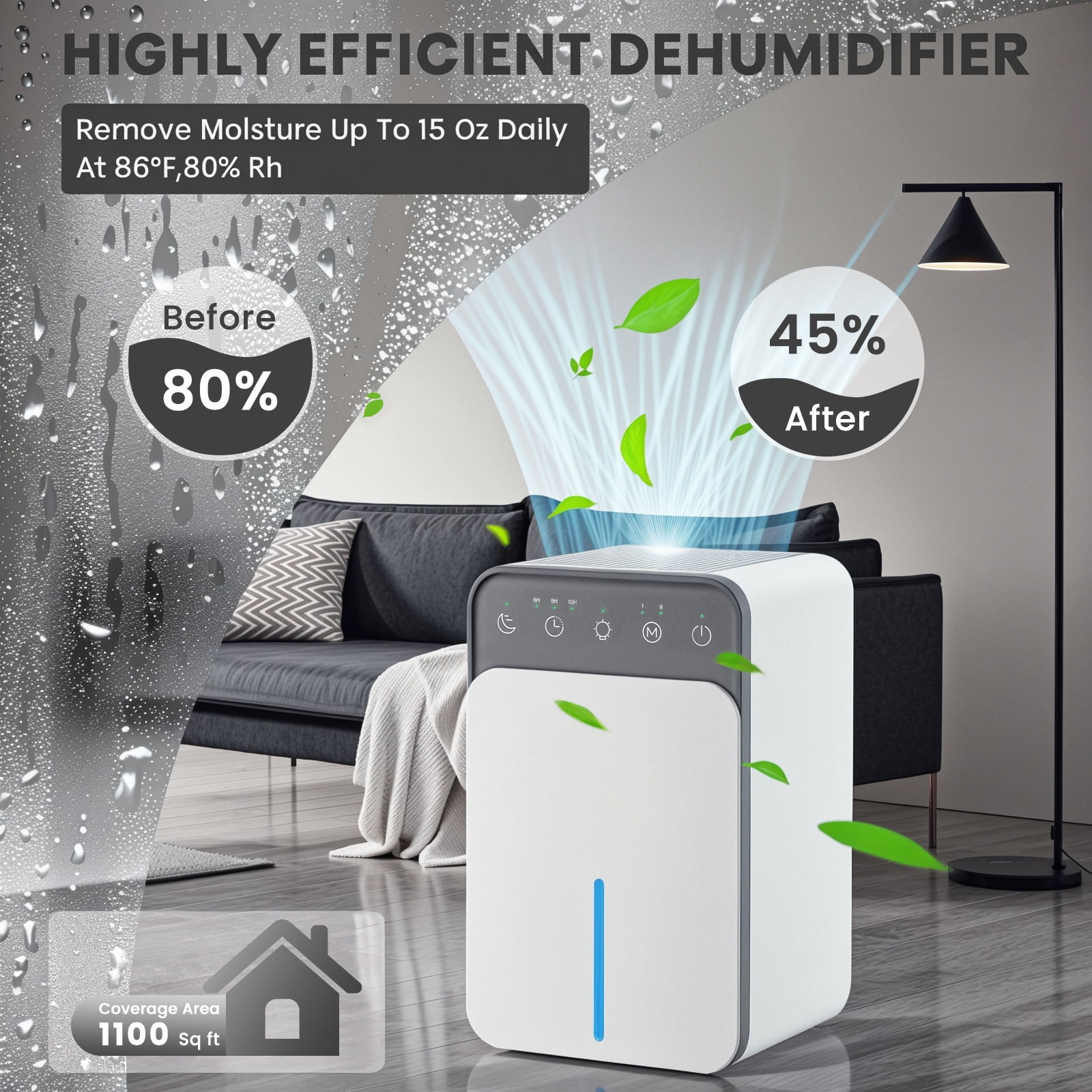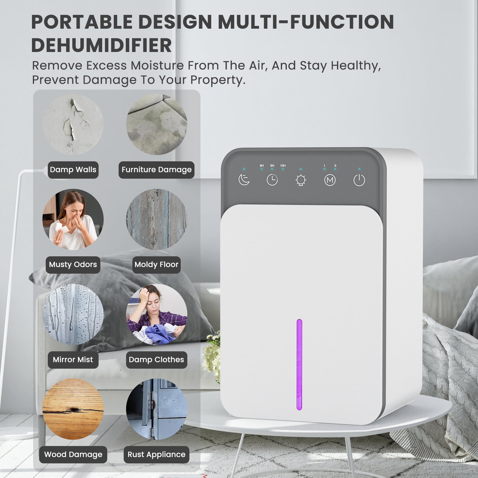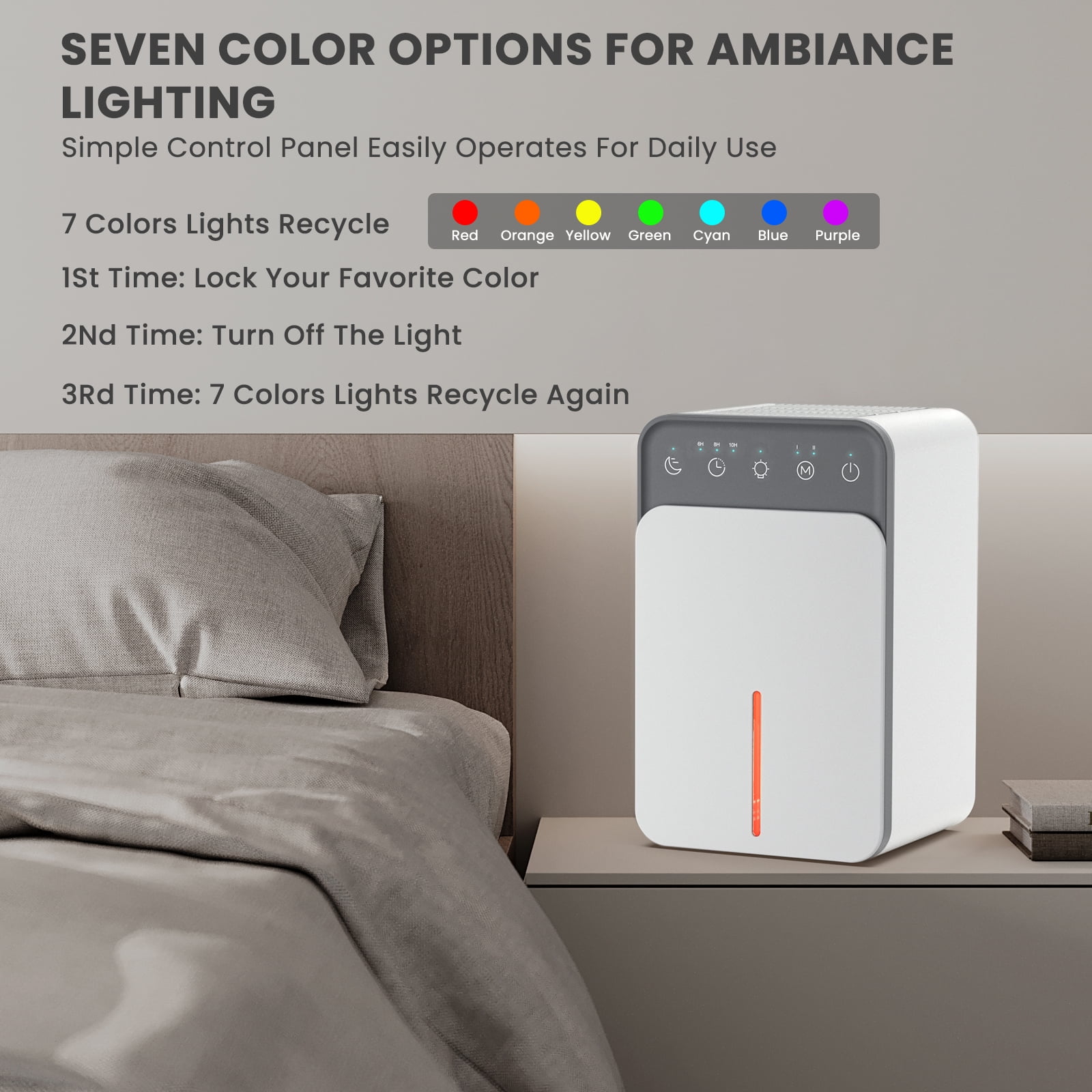 【HIGHLY EFFICIENT DEHUMIDIFIER】The AUOSHI dehumidifier employs advanced semiconductor condensation technology for superior moisture removal. Ideal for spaces up to 500 sq.ft., it maintains humidity below 45%, ensuring a comfortable home environment. 【52.8 oz LARGE CAPACITY】 This dehumidifier ensures extended operation, Featuring a 1500 ml (52.8 oz) large capacity water tank. The AUTO Shut-Off protection activates when the tank is full, turning on a red warning light and automatically stopping the dehumidifier. 【QUIET SLEEP MODE】Our bedroom dehumidifier features a sleep mode that operates at under 30dB, ensuring a peaceful sleeping environment. With 7 color light modes, it can be personalized for use in the bedroom, basement, or bathroom. 【TIMER FUNCTION】Our dehumidifier for bathroom includes a 4/6/8 hour timer that automatically shuts off at the set time, ensuring it only runs for your specified duration. This feature saves electricity and eliminates the need to manually turn off the dehumidifier. 【AUTO DEFROST FUNCTION】The dehumidifier automatically activates the defrost function when frost is detected. During defrosting, the fan runs continuously while dehumidification pauses to melt the ice. If the ambient temperature drops below 59°F (15°C), the unit will automatically defrost to maintain safe operation. Dehumidification resumes once defrosting is complete.