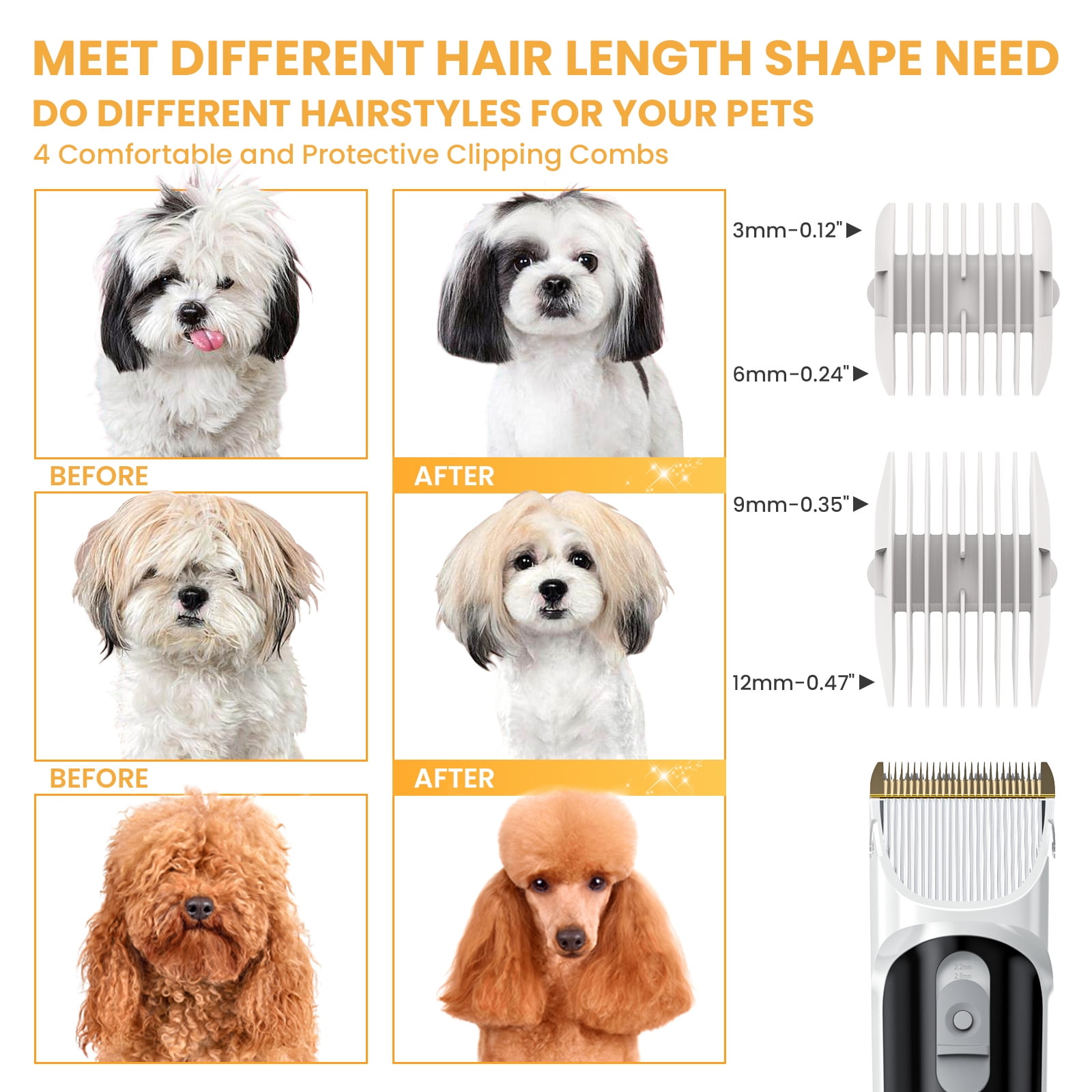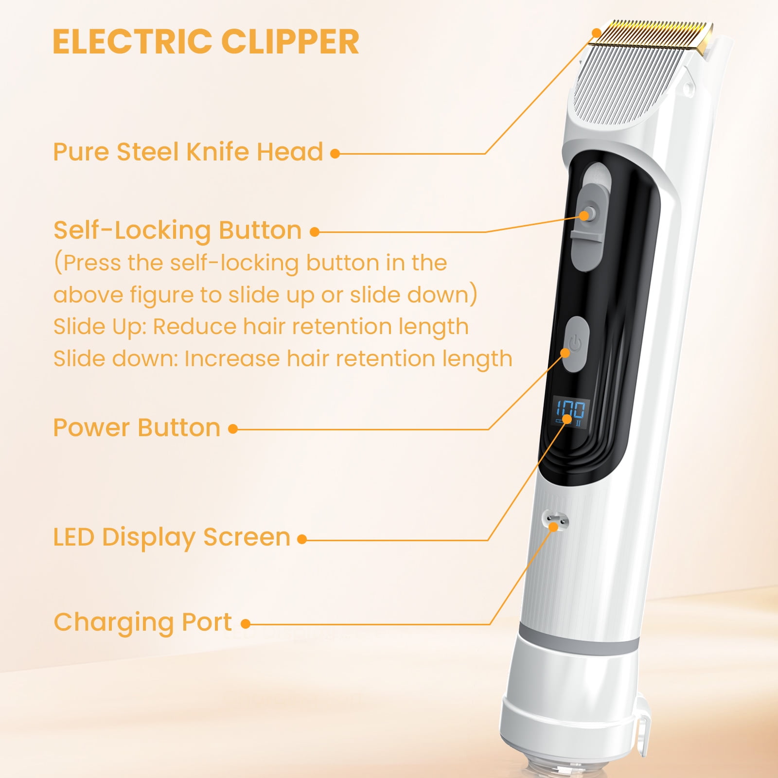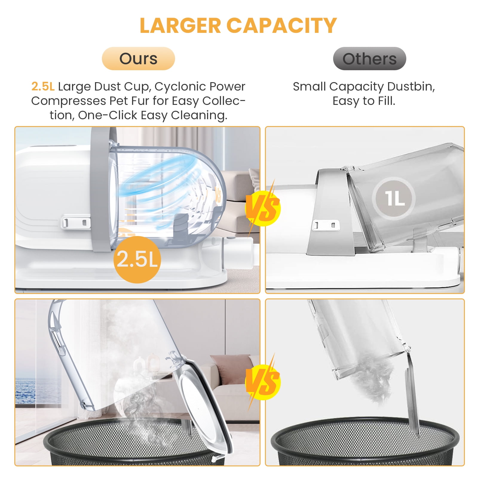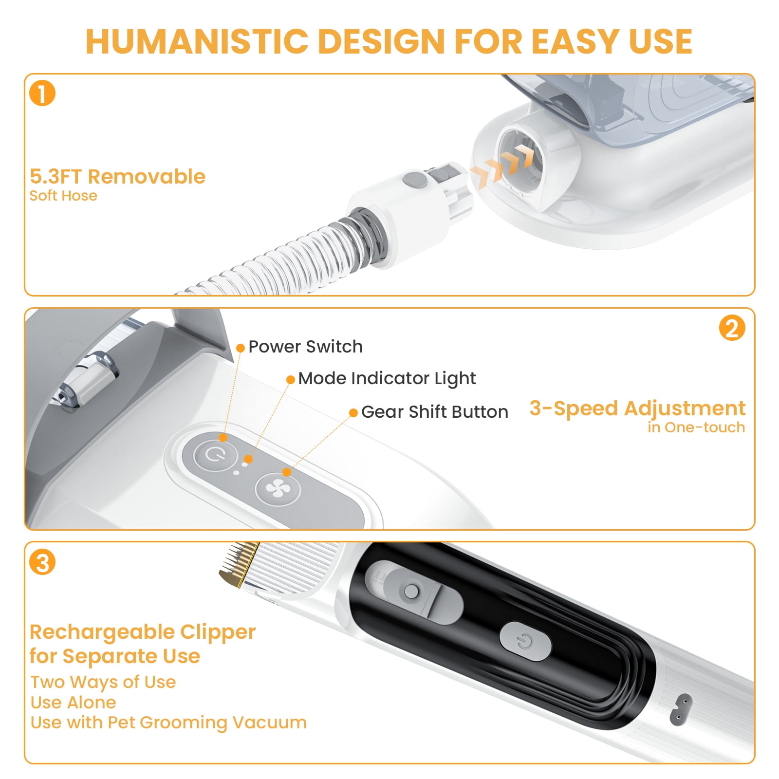 [Powerful 13000 Pa Suction = Clean Floors & Furniture] Features 3 suction levels (Eco/Standard/Boost) up to 13000Pa to instantly vacuum 99% of loose hair and dander — keeping your sofa, carpets, and clothes pet-hair free with no extra cleaning effort. [5-in-1 Grooming Tools = All You Need in One Kit] Comes with grooming brush, deshedding tool, low-noise wireless clipper (with 4 guide combs), cleaning brush, and nozzle — perfect for brushing, trimming, cleaning and styling your pet from head to paw. [Low-Noise Pet-Friendly Design = Stress-Free Grooming] Designed with noise-reduction tech, keeping sound levels as low as 50dB — gentle enough for anxious pets. Give your dog or cat a calm spa experience at home. [Large 2.5L Dust Cup = Less Emptying, More Grooming] Spend less time cleaning and more time bonding. The spacious dust cup captures hair from multiple grooming sessions and detaches easily for quick emptying. [Save Time & Trips to the Groomer = DIY Salon at Home] Get professional results at home — no appointments, no waiting, no expensive visits. Perfect for busy pet parents who want grooming made easy and affordable.