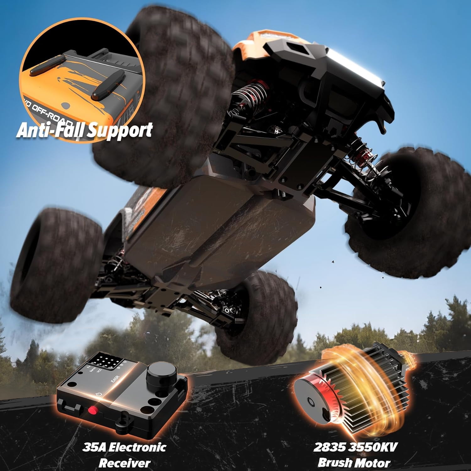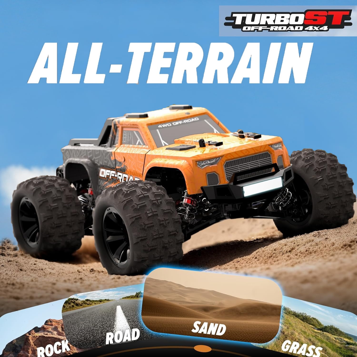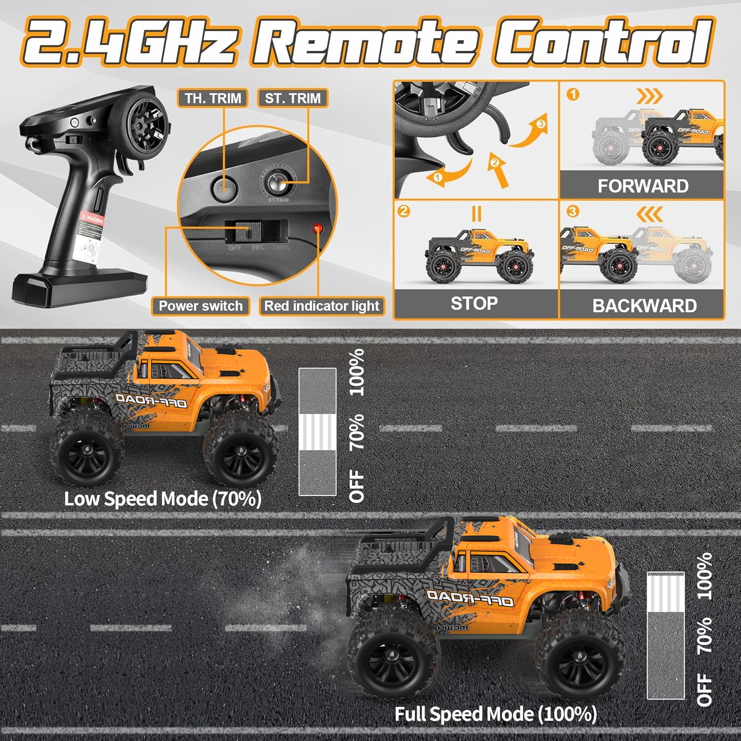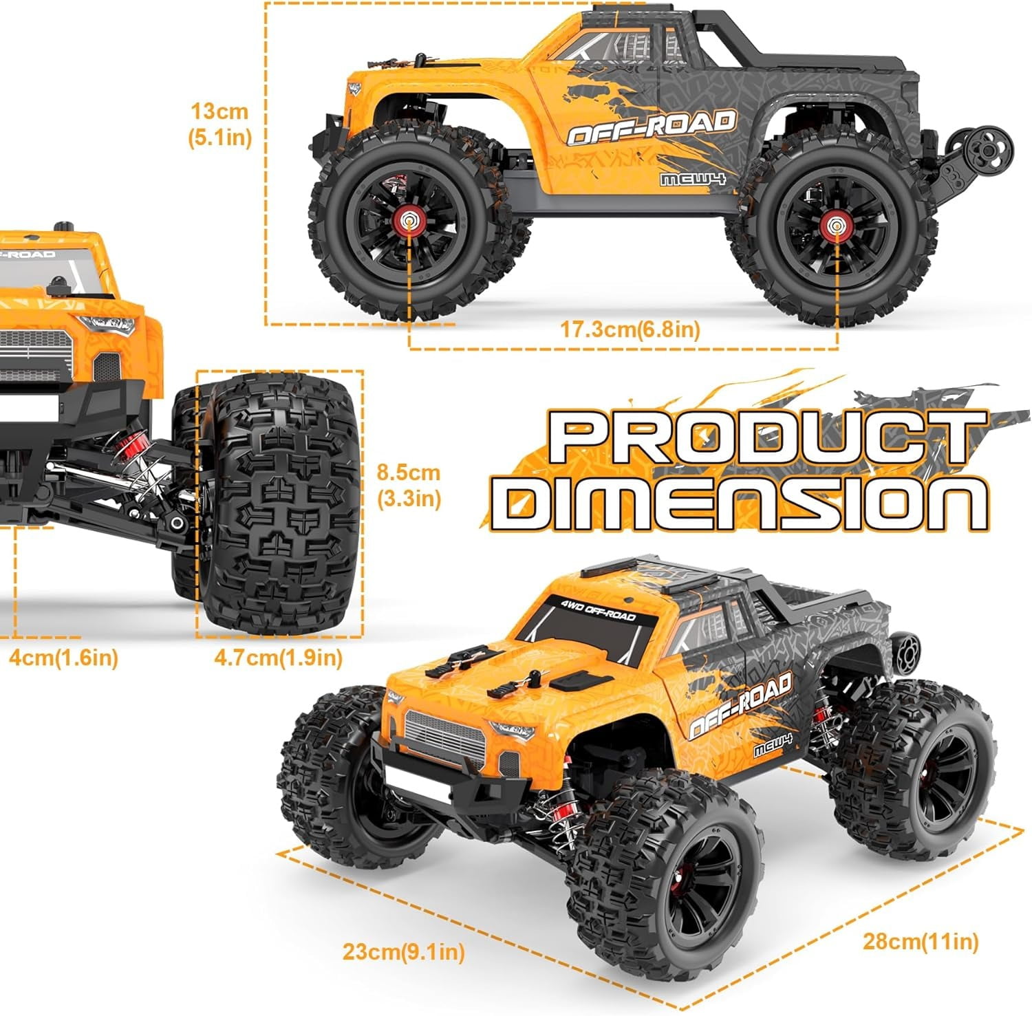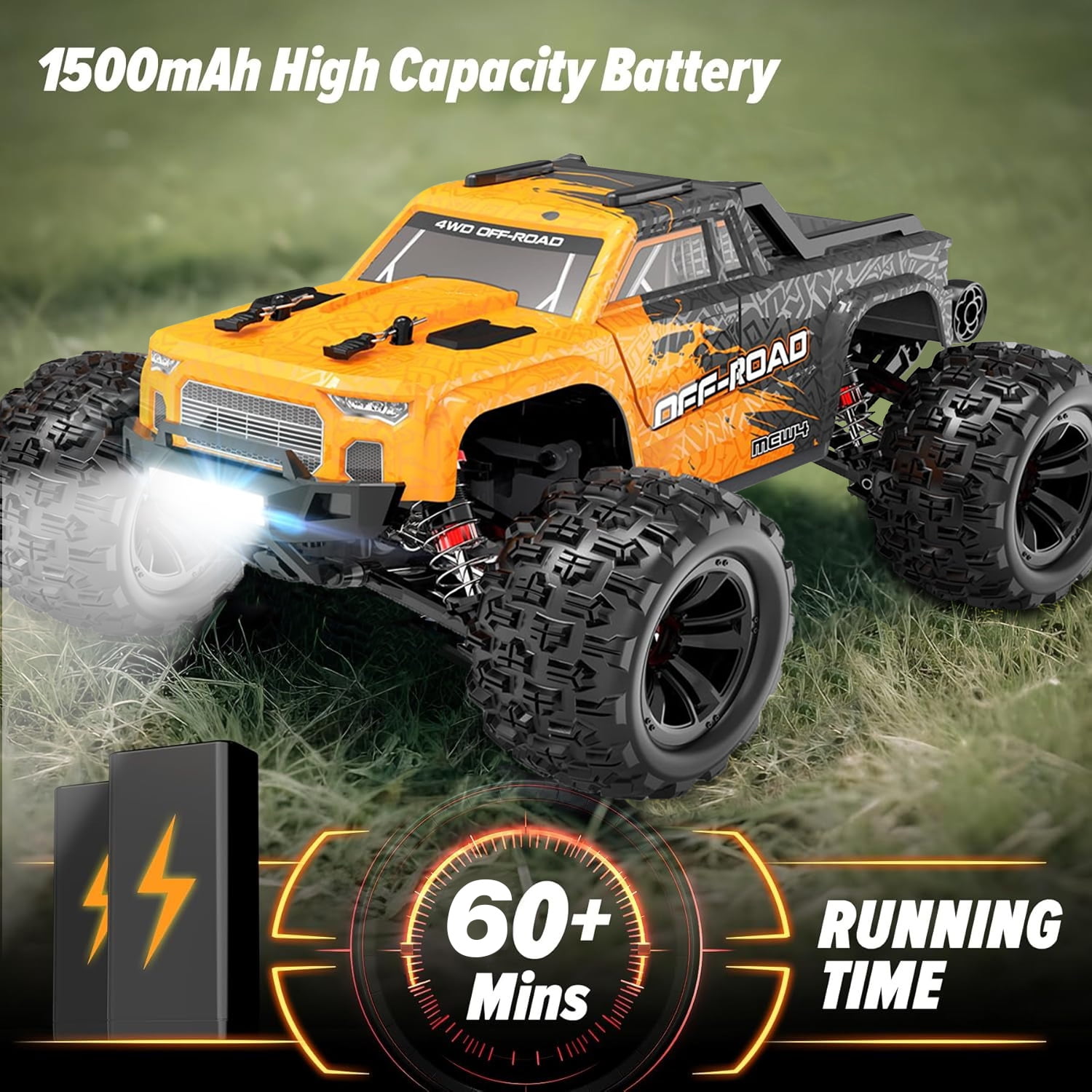 ????【Built For The Track】The off-road RC truck features an upgraded powerful 390 magnetic motor, and strong power makes the remote control car easy to run on rugged roads or off-road without affecting its performance. Super strong anti-collision structure and 4WD make it possible to drive on any road condition without getting stuck on larger obstacles along the way. reaching a top speed of over 55+km/h, delivering the ultimate thrill for you. ????【Durable All-Metal Driving System】The RC car overall super stable structure features 16 ball bearings, a metal transmission shaft, and high-quality gears in the transmission system to minimize power loss. The high-quality PA material frame is flexible and maintains collision resistance. Makes this 1:16 RC car even more rugged and difficult to damage and improves the service life of the remote control car. ????【Oil Filed Shock】The extra-long oil-filled shock design gives this monster truck 4cm of ground and excellent shock absorption. The Oil-filled shock absorbers greatly reduce the shaking of the remote control truck when driving at high speed. More stability and much safer for conquering more terrain: uneven roads, mud, grass, sand …… ????【Full-Function Transmitter】2.4GHz wireless radio control car with light bar control, forward/brake/reverse. No signal interference when racing fast RC cars with your friends. Most importantly, the 70% throttle limit switch is perfect for beginners, with a designated normal/slow speed switch for beginners and children. ????【2 X 1500mAh Rechargeable Battery】The high-speed RC car comes with a 2* 7.4V-2S1P-1500mAH lithium battery with a batterie management system safe, powerful, and high-capacity, this battery also carries a battery management system to prevent overcharging–, over-discharge, and short circuits, which greatly improves safety, and 2 batteries can play for 60+ minutes, 200% more fun! (Depending on operation). ????【Best Gift for Adults & Kids】The fast remote control car, is suitable for boys and adults. Its upgraded drivetrain ensures a smoother operation, providing an unparalleled level of enjoyment for operators. It is more like a creative hobby-grade truck, which can not only cultivate children’s hobbies and interests but also develop their manipulation skills. If you are looking for Christmas or birthday gifts for friends and children, this toy car will be your favorite.