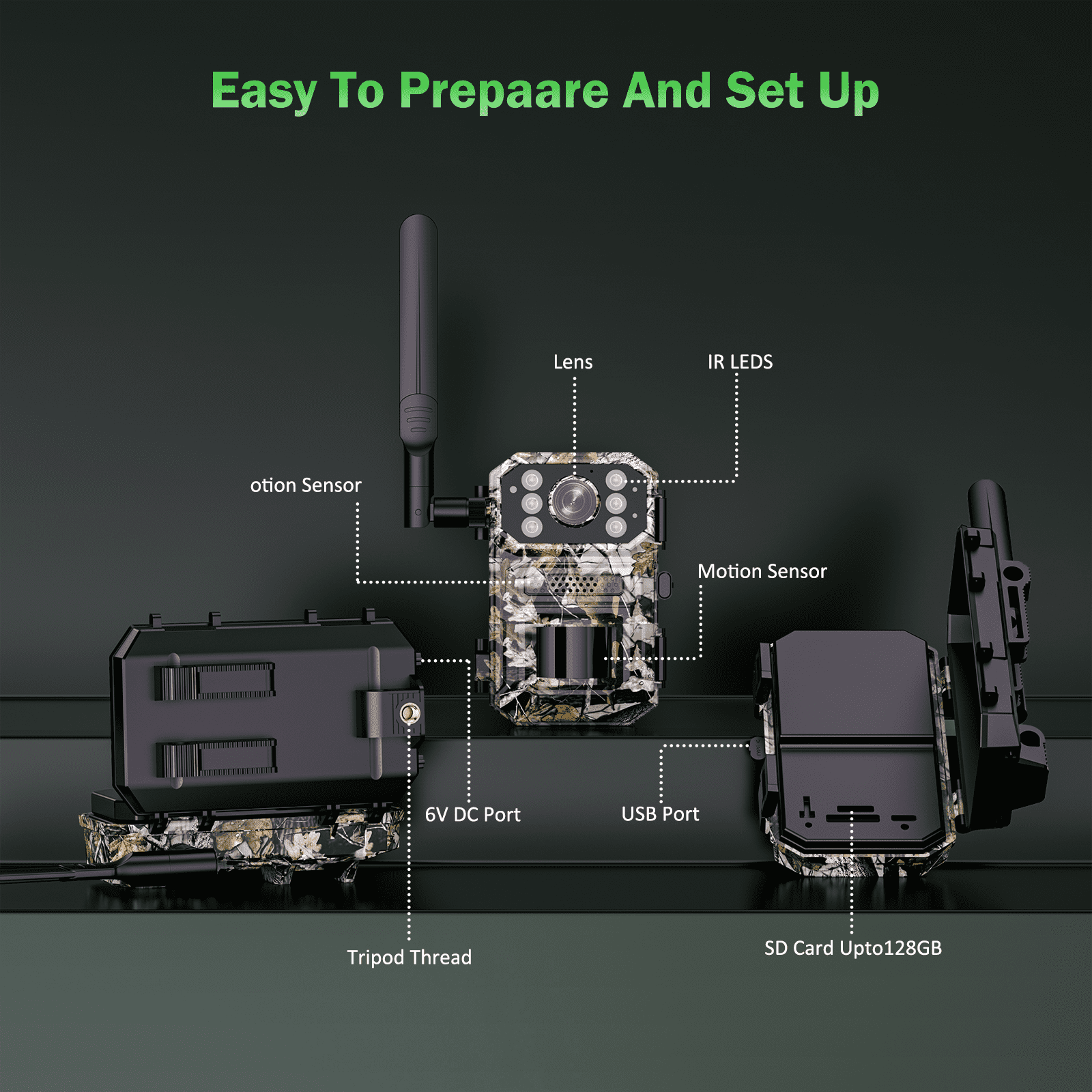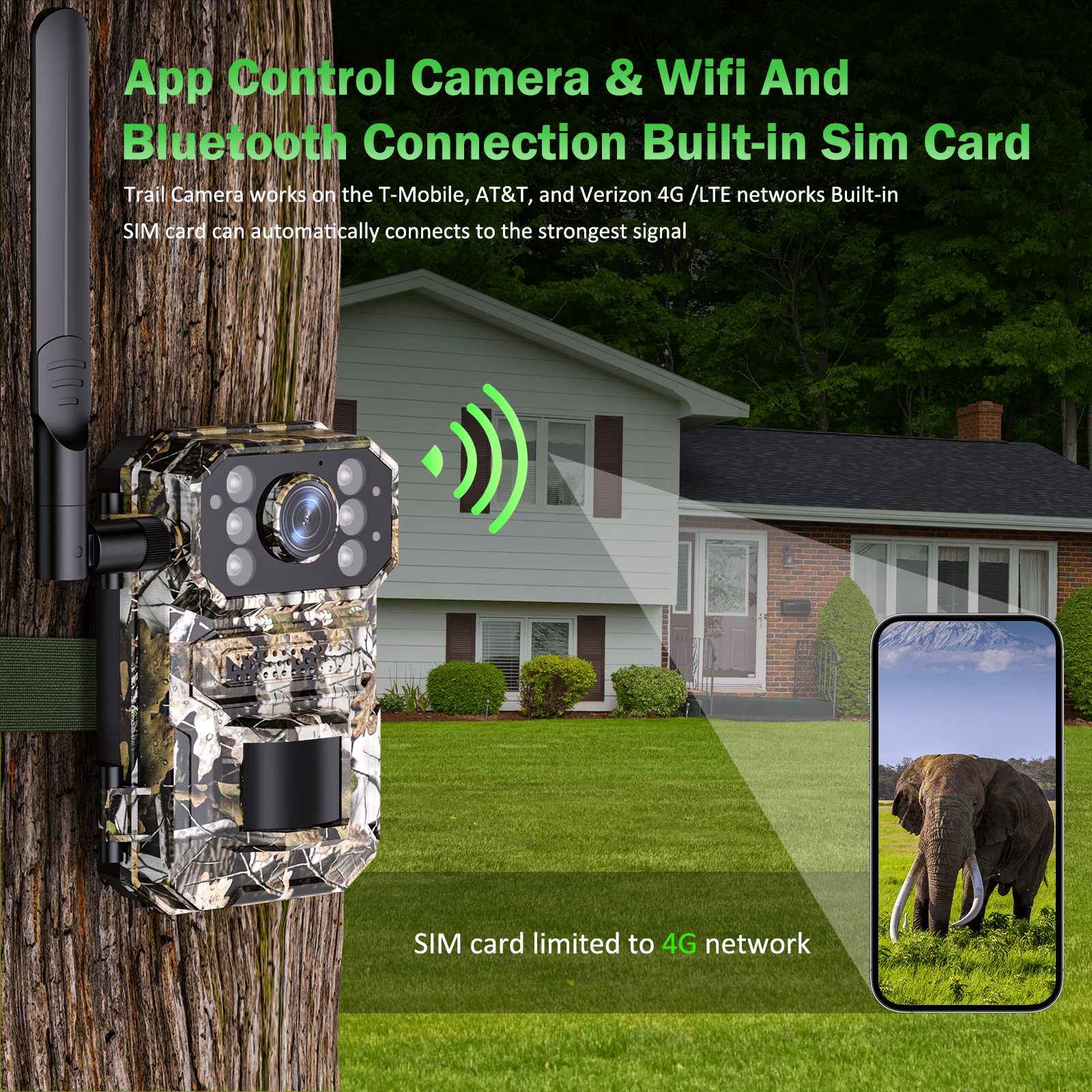 2025 Newest Upgraded Dual Lens 4G LTE cellular Trail Cameras which Built-in SlM Card, provide you 2 perfect view with No blind spots! 4G Spypoint Cellular Trail Camera with Dual Lens 1. Camera built in 4G SlM card(can’t be changed) 2. SlM card comes with 300MB of free data Powered by solar panels The hunting camera has a 12-month standby time, can be charged by USB or solar powered, has a built-in battery and has a long battery life. WIFI Connection & APP Control You can connect your mobile phone to your hunting camera to observe things, with 4K Ultra HD Vedio&48MP Dual Lens Security Camera Built-in SIM Card With 300MB sim card(Valid within one month of activation) 32GB SD card(supports up to 128GB) Cloud storage Offers a free trial for 30 days 0.5s Trigger&Night Vision&IP66 Waterproof The trail camera is waterproof and is not afraid of cold, hot, windy or rainy weather. When tracking things, the fastest time to start shooting is 0.05 seconds, lightning speed! Packaging: a hunting camera, a solar panel, a 4G SIM card, a 32GB memory card, USB cable