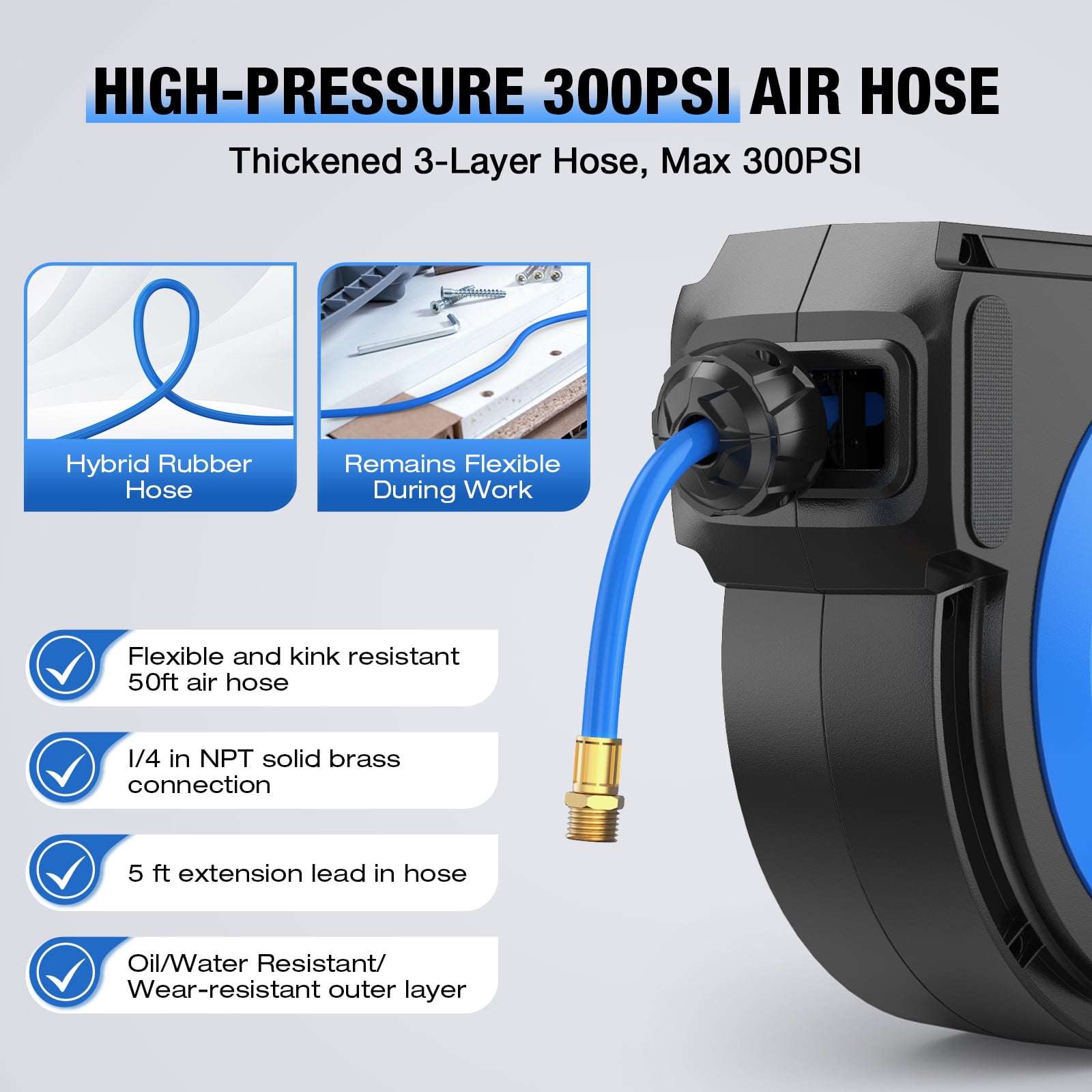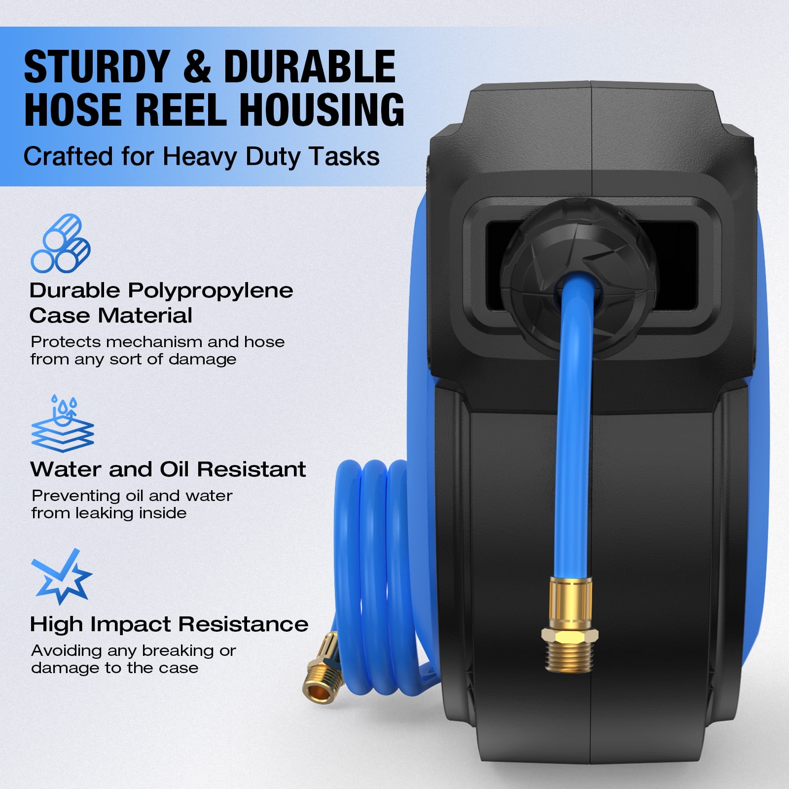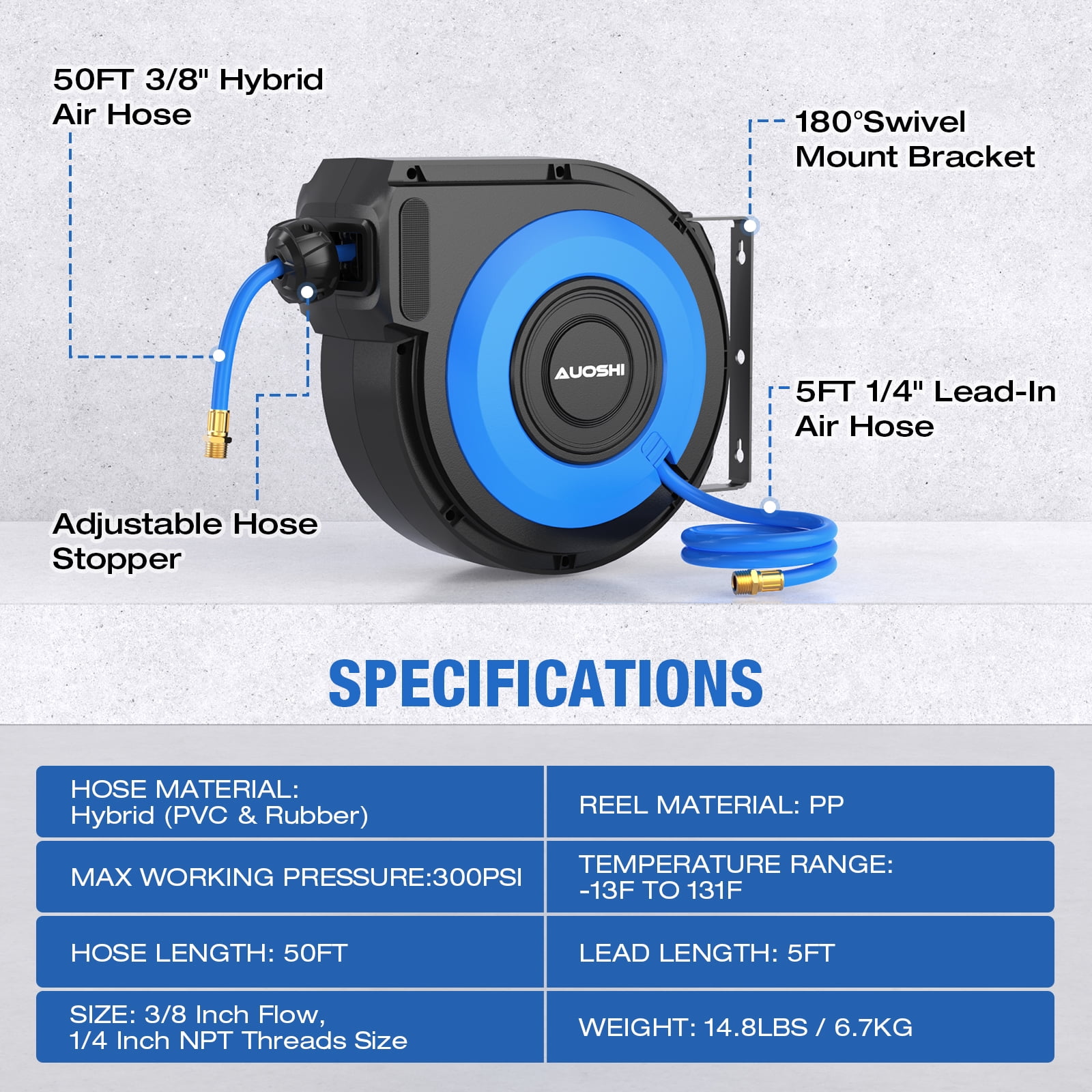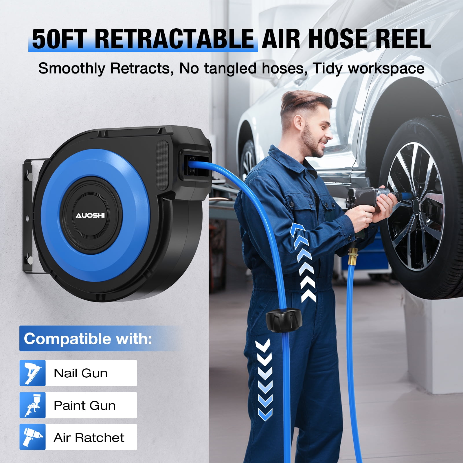 AUOSHI ZYA016-Q10D PVC, 50 Ft Retractable Air Hose Premium Retractable Air Hose AUOSHI air hose with a 50 + 5ft oil and abrasionresistant air hose that offers allweather flexibility with a temperature range from 13 to 131 ℉, making it ideal for yearround use, including cold winters Automatic Rewind Simply give the air hose a gentle tug, and the air compressor hose reel will retract effortlessly, eliminating tangled hoses Hose Guide & Lock Lock the hose at any desired length with ease. Two nonsnag rollers guide the hose, minimizing abrasion and wear while preventing kinks and tangles under pressure Durable & Sturdy Solid Brass Fitting Built with professionalgrade allsteel construction and brass fittings, featuring a corrosionresistant powder coat finish for exceptional durability, ensuring years of reliable service