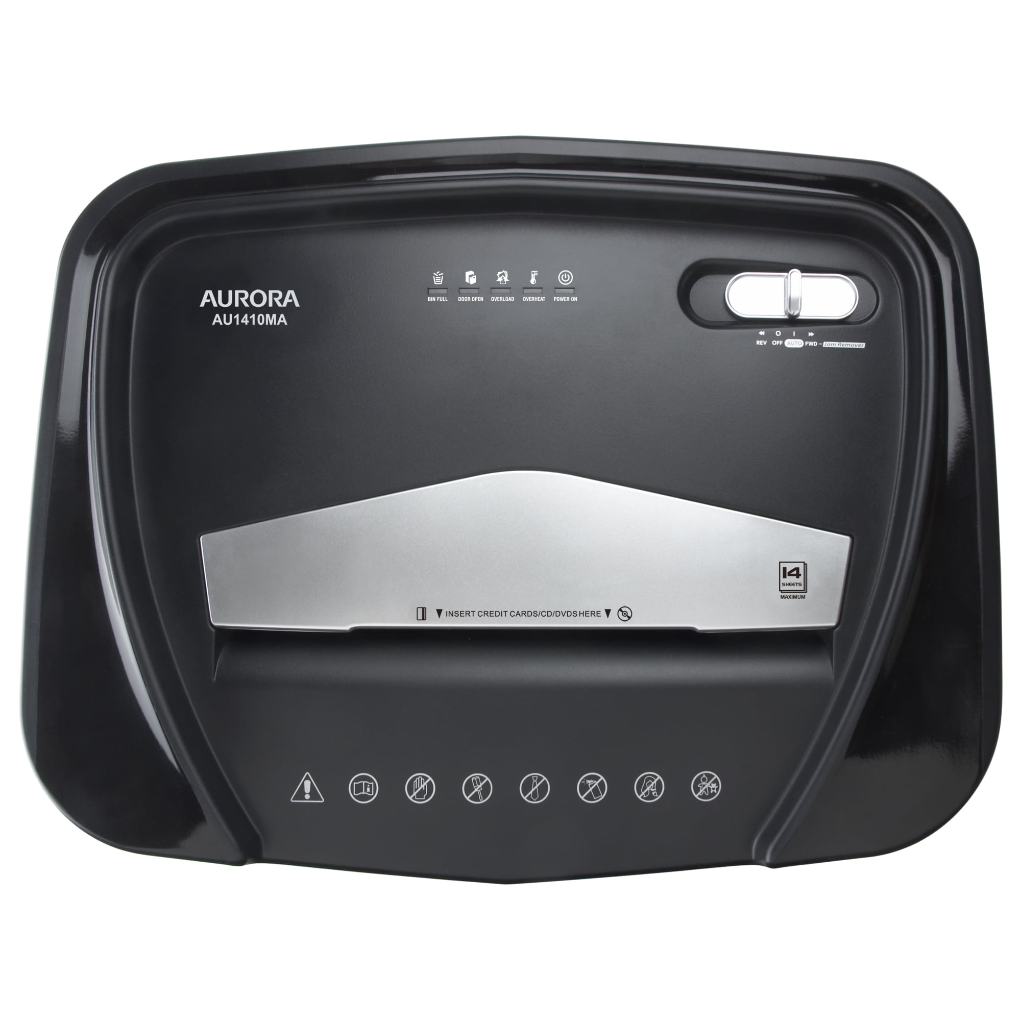 The Aurora AU1410MA 14-sheet micro-cut paper/ CD/ credit card shredder with 5.0-Gallon pullout basket is the perfect business and home office device to keep you safe from identity theft. The AU1410MA accepts up to 14 sheets of paper at a time and shreds them into small pieces (5/32 by 15/32 inches), security level P-4. Ultimate protection with particles 4 times smaller than standard cross-cut. Anti-jam Auto-reverse to clear paper jams. Non-stop 30-minute continuous run time and quiet operation. In addition to paper, the AU1410MA shreds CDs/DVDs/credit cards, keeping vital information from falling into the wrong hands. The throat of the shredder is 8.7 inches wide and has casters for easy mobility. LED indicator lights: Standby/ Overheat/ Bin-full/ Overload/ Door open.