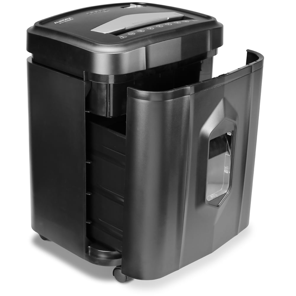 Aurora GB High Security Micro-Cut with 16 sheet capacities; destroys CDs, DVDs, credit cards and small paper clips. 5-gallon pullout bin with LED indicator lights Standby/ Overheat / Overload/ Door open/ Bin-full status; moving casters included Nonstop 10-minute continuous run time. Overload jam-stop protection prevents serious paper jams; quiet operation. Shreds paper, CDs, DVDs, credit cards into small pieces (5/32 by 15/32 inches), security level P-4.