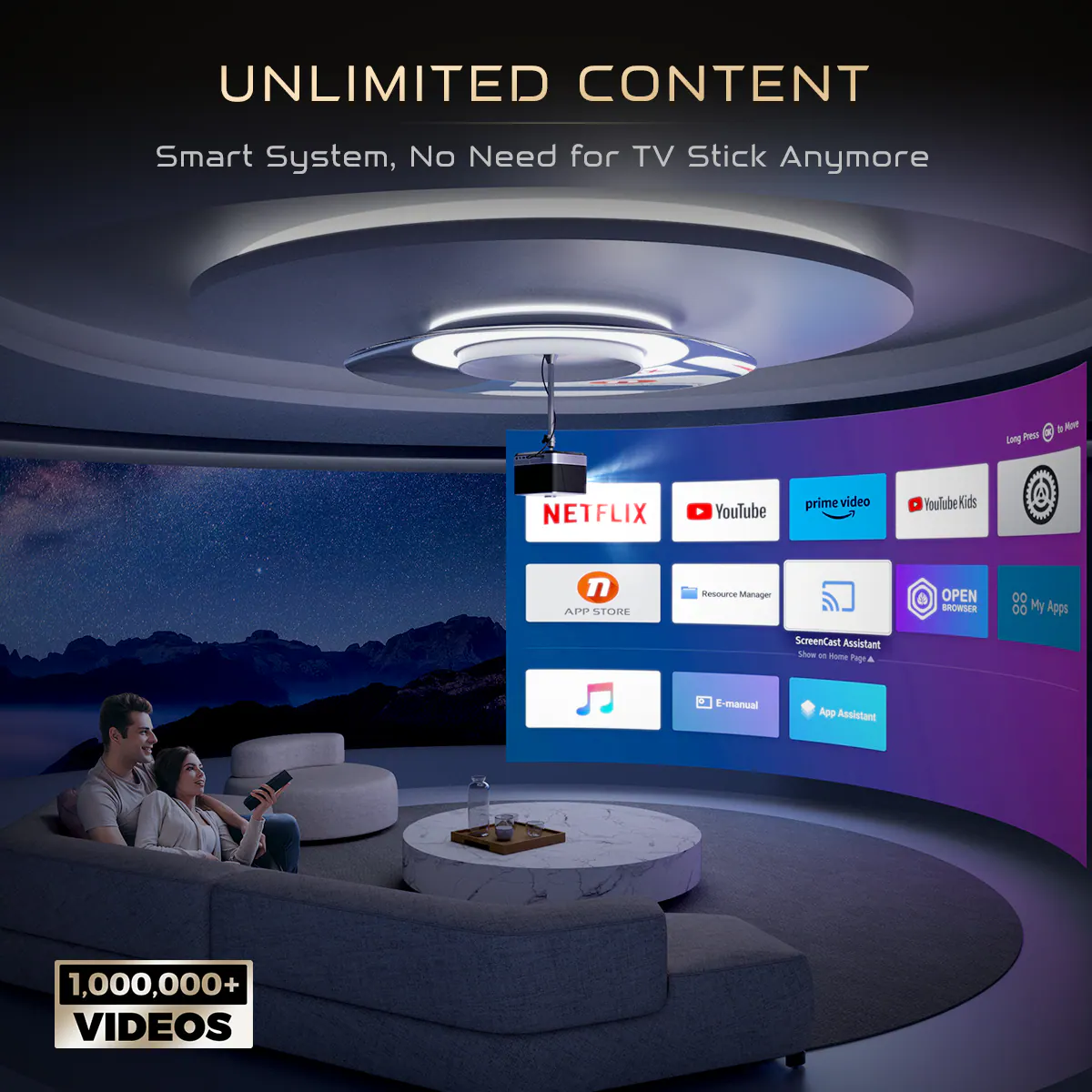 This smart projector is equipped with advanced smart TV OS which supports 1,000,000+ videos. It’s pre-loaded with certified Netflix, Prime Video, and YouTube, which enable you to quickly launch your favorite movies or TV shows with just one click. Besides, the Open Browser and the APP STORE enable you to download your favorite apps. No need to connect with external TV sticks