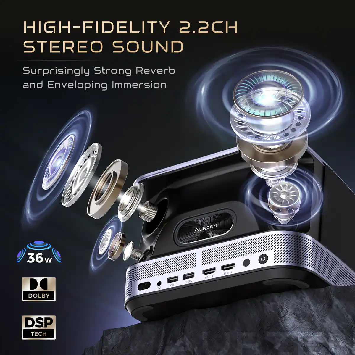 Aurzen BOOM 3 Netflix projector revolutionizes stereo surround sound with 36W powerful speakers and Dolby Audio, delivering crisp highs, rich midranges, and deep bass. It’s the top choice for audio quality among thousand dollar projectors, offering an immersive cinematic experience. With two way Bluetooth, it doubles as a high quality speaker. Ideal for movies, gaming, or presentations.