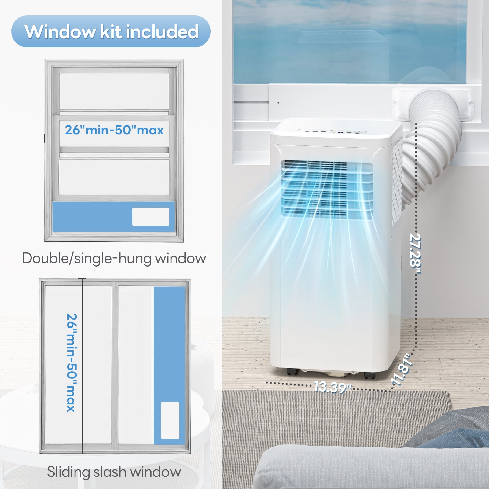 【High Efficiency Cooling】 Auseo 6,000 BTU portable air conditioners is equipped with a high-efficiency compressor that can cool a room of 450 square feet. You can adjust the temperature between 62℉ and 86℉ (17℃-30℃) according to your preference. You can choose from two air speeds: high and low, making it suitable for a variety of spaces such as living rooms, bedrooms and offices. 【3-in-1 Function & Remote Control】 This portable room air conditioner has three modes: cooling, fan and dehumidifying. There are two control methods: control panel and remote control, and the product is equipped with an LED display, which makes the remote control extremely convenient for you when you are lying in bed and don’t want to move. 【Sleep Mode & 24-hour Timer】 Low noise (53db) and silent operation, allowing you to have a quiet rest and working environment. When you go to bed, turn on the sleep mode, the temperature will gradually rise with time, avoiding prolonged low temperature causing cold and flu. Use the 24-hour timer function to set the time in advance and enjoy the coolness as soon as you enter the room. 【Portable】 This portable air conditioner is only 13.39*11.81*27.32 inches, which is small and doesn’t take up much space. It also comes with a carrying handle and four universal wheels so you can easily move it anywhere! 【Easy to Install】 Our portable mobile air conditioner package comes with the accessories and instructions you need to assemble it, it is very simple and easy to understand, you can also feel free to contact us, we are more than happy to help you solve the problem.