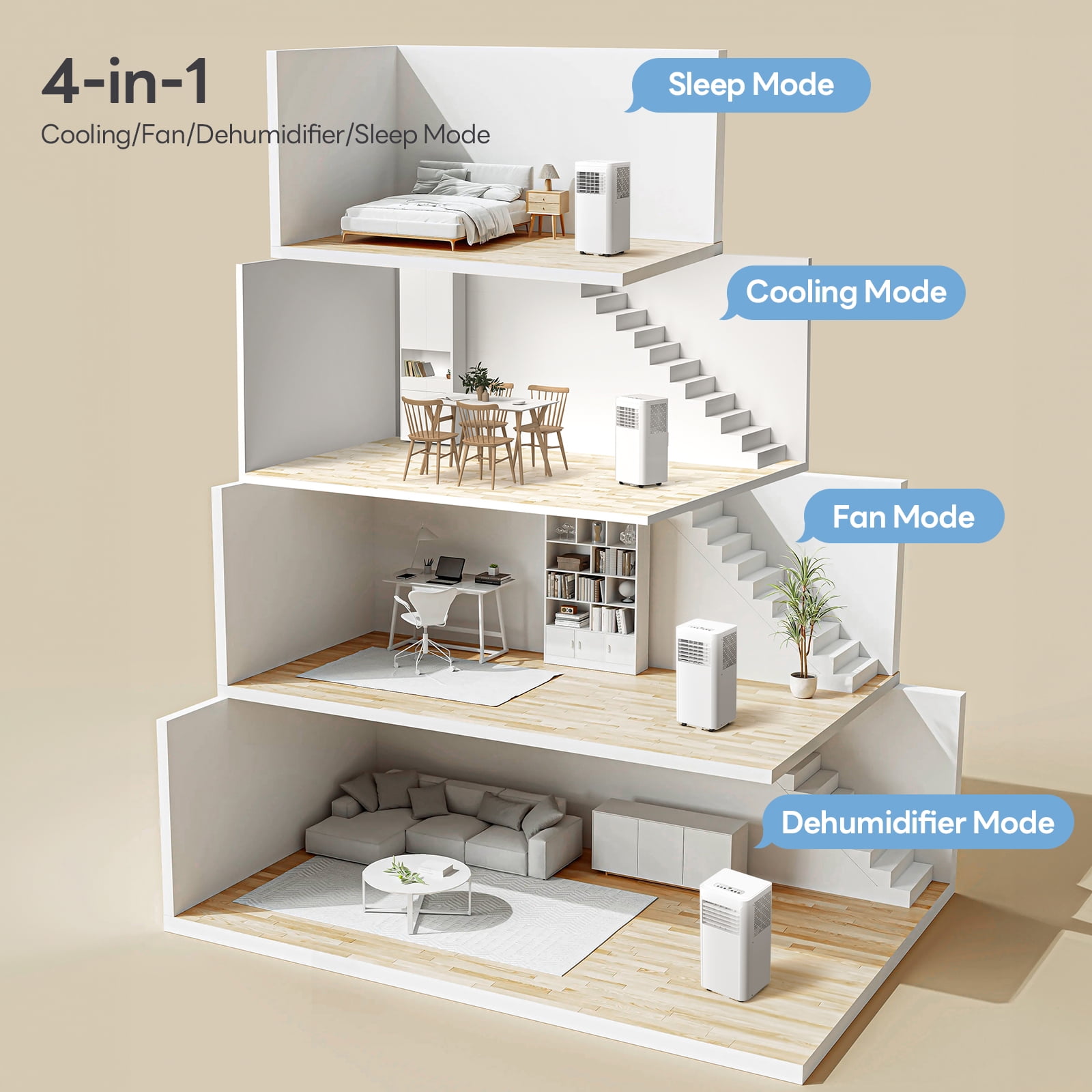 Auseo 3-in-1 mobile air conditioner is equipped with three modes: cooling, dehumidification and fan. The two wind speeds can be adjusted according to your own situation. Built-in 24-hour timer and sleep mode, low running noise, saving energy and money, and providing a good sleep atmosphere. Auseo 10,000 BTU ASHRAE portable air conditioner can ventilate and circulate air in your room, making your space more comfortable and fresh, and the intelligent and simple operation will give you a better experience.
