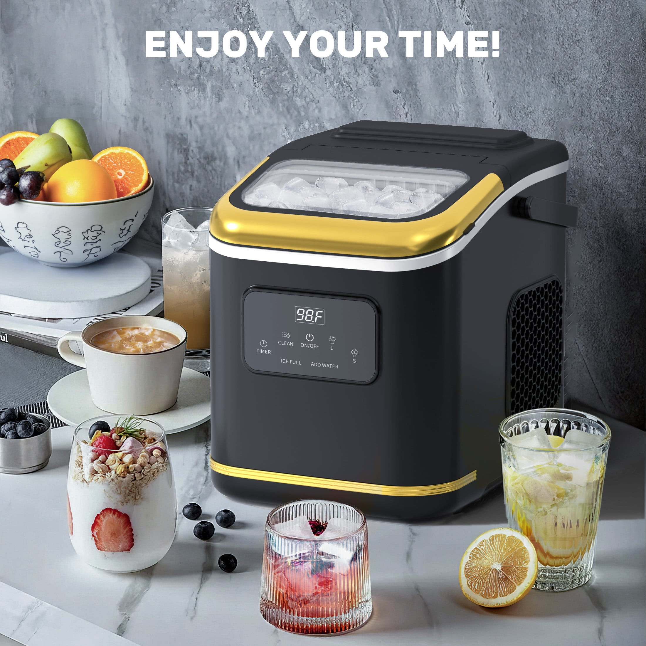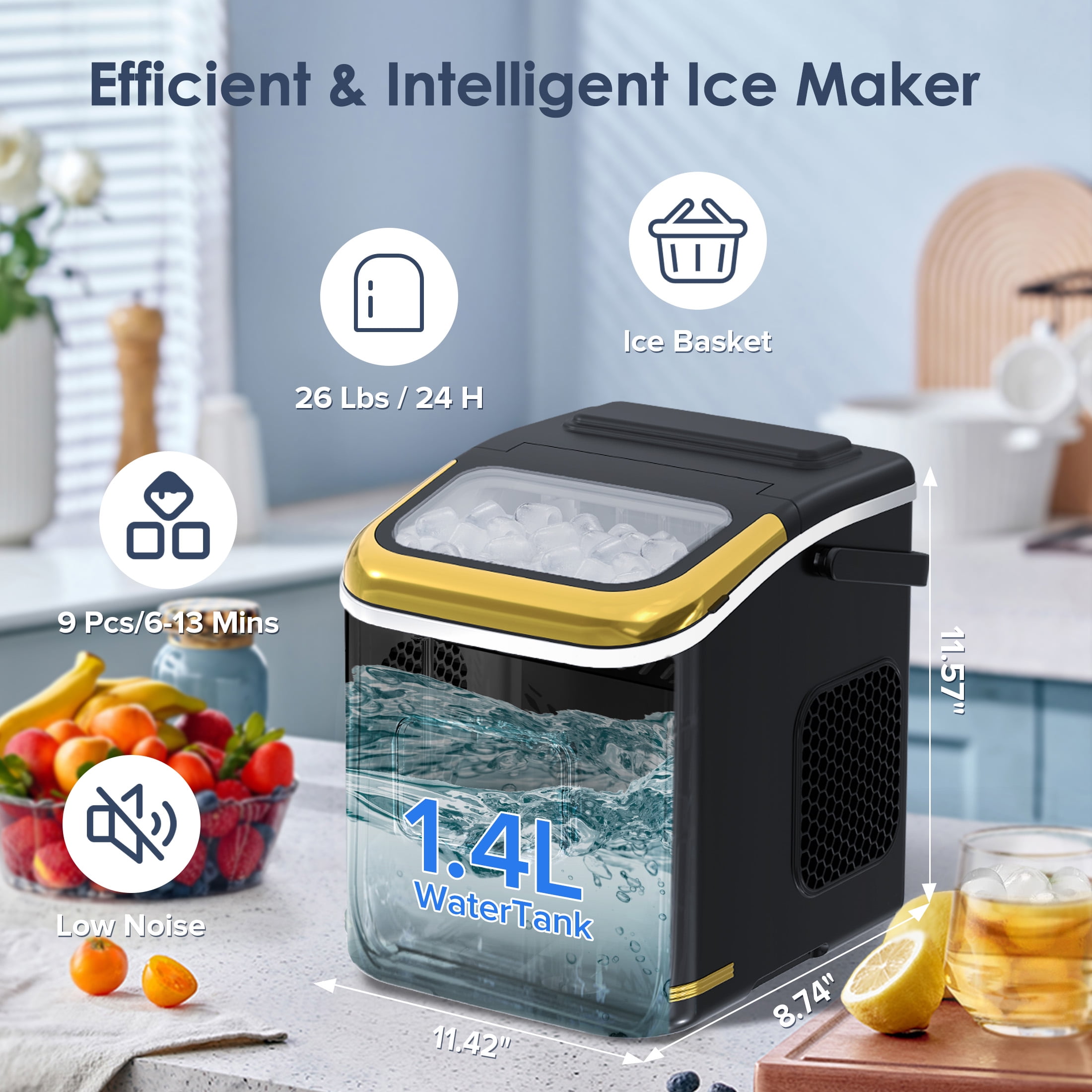 Meet the Auseo Ice Maker—Fast, Portable & Smart! Get fresh bullet-shaped ice in just 6-13 minutes! Designed for convenience, it features a lightweight build, sturdy handle, and compact size, making it perfect for home, camping, or RV trips. With a powerful compressor and 1.4L water tank, it produces up to 26 lbs of ice daily while operating ultra-quietly. Now upgraded with a timer function for scheduled ice-making and a display screen that shows the ambient temperature, giving you more control and convenience. Perfect for cold drinks, iced coffee, and more—get yours today!