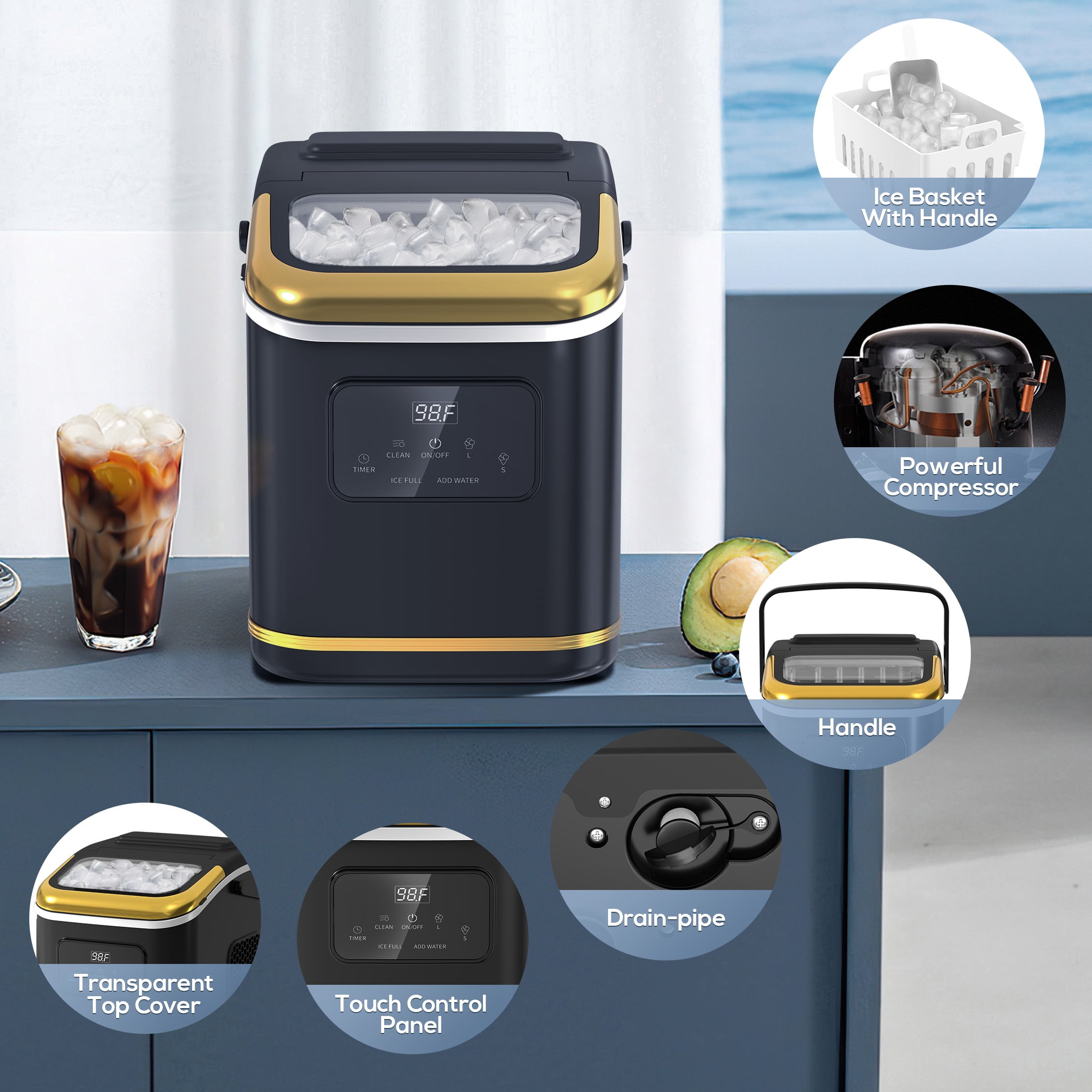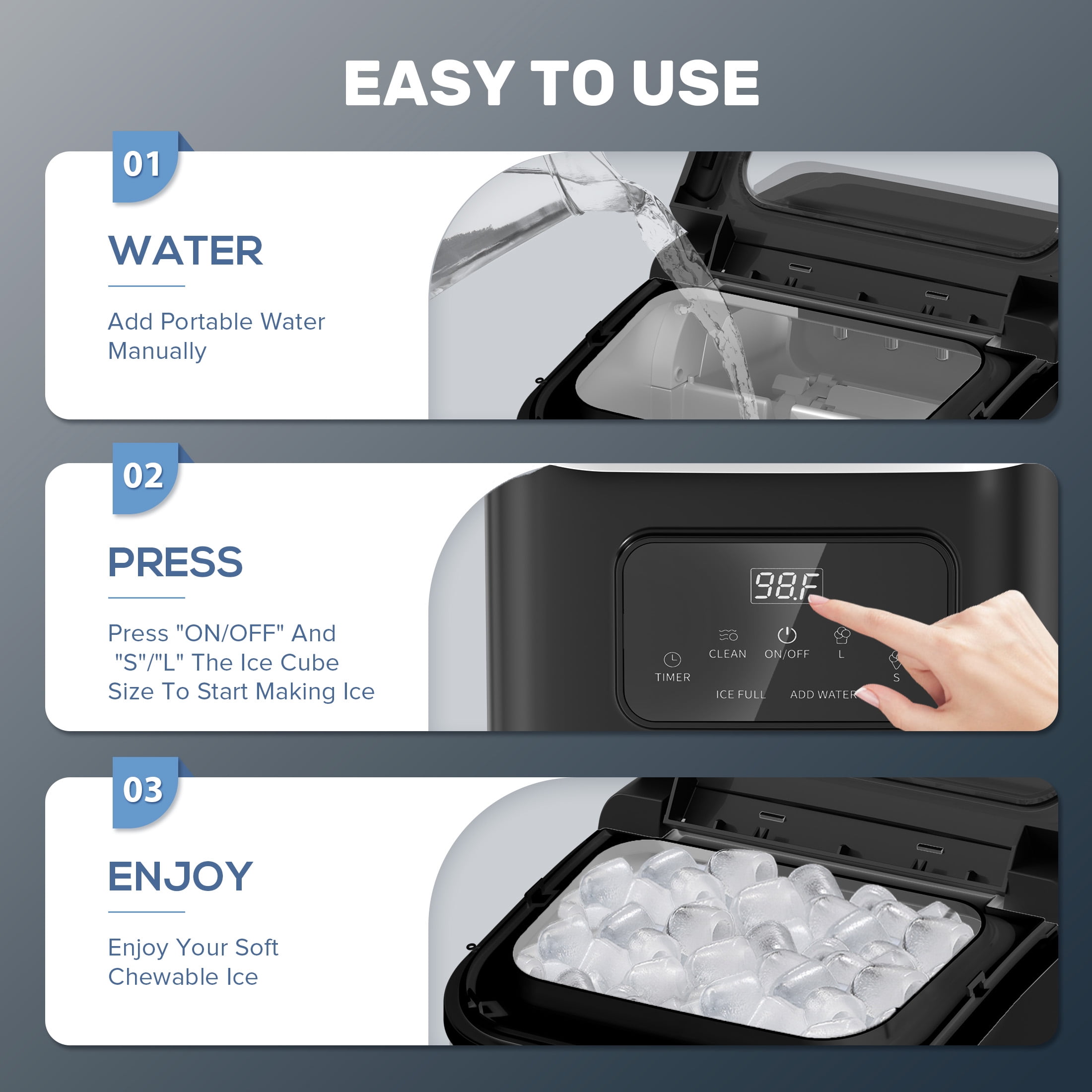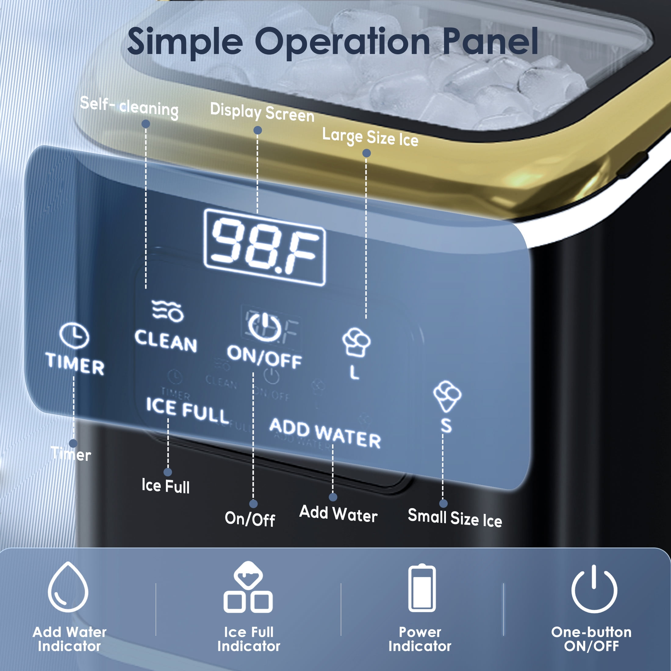 [Hassle-Free Cleaning with Auto Mode] Simply press “ON/OFF” for 5 seconds to activate the 30-minute automatic cleaning cycle. Enjoy a fresh, hygienic ice maker with zero effort!