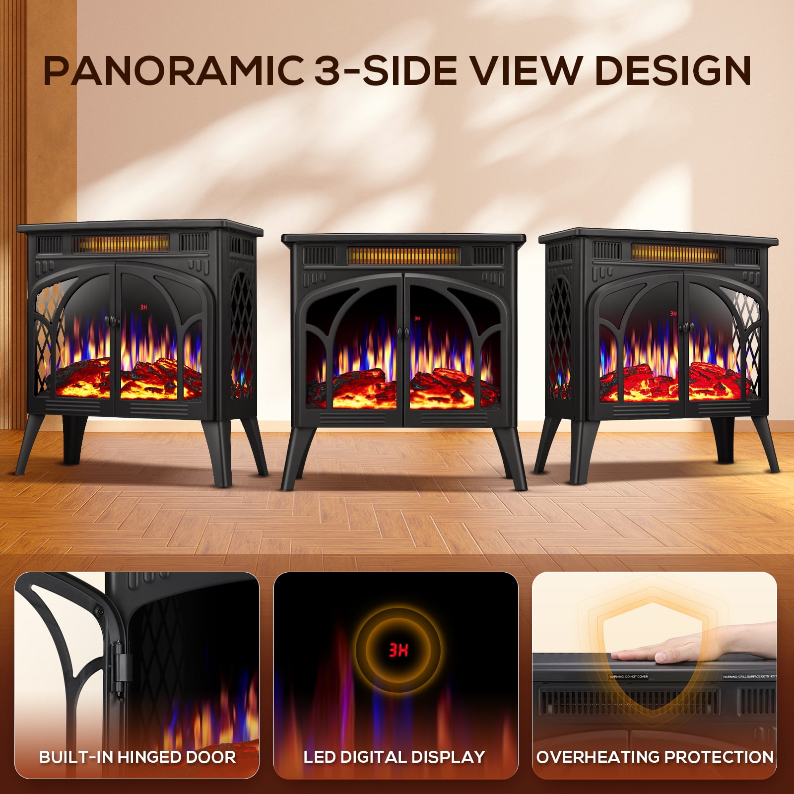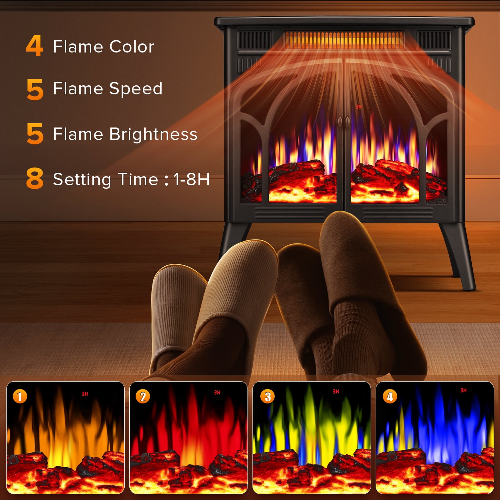 Key Features: 【Realistic Flame Vision】-Gorgeous and real beating flame and burning log design create the effect of realistic flame in the fireplace, as if you were in every scene. Transparent glass on three sides provides 180-degree observation, and you can enjoy the beautiful flame effect from any angle, which will become a highlight and ornament of your room. 【Vintage Design】-The designer was inspired by the interior design of the Louvre in Europe, symbolizing firmness and eternity. The design of arched doors and fences adds historical color to your room. The electric furnace heater is made of steel structure, which ensures long-term use and stability. 【Flame Color & Flame Speed】-4 kinds of flame colors and log colors, and 5 kinds of flame brightness can meet your different needs in different scenes. In addition, the flame speed can also be adjusted and switched according to your situation. When you study, the flame will jump slowly, and when you hold a party, the flame will jump quickly. When you just want to lie on the sofa, it can also be remotely controlled. 【Infrared Heating Mode】-The heating mode is divided into 500W/1500W. The infrared system heats the room instead of air drying, which will help you to maintain a natural and comfortable humidity in winter. 【Overheating Protection】-This fireplace is equipped with infrared Shi Ying heat, which helps to keep the natural humidity in the air, thus generating comfortable warmth without drying the room air. The overheating safety device will make the heater safer and more reliable. The air outlet is designed at the bottom of the product, which can effectively avoid overheating and high temperature hazards of the fuselage, so you can use it with confidence. Special Features: Heating and Flame Work Separately Infrared Heating Remote Control Carbon Steel Package Included: Manual *1 pc Base Angle * 4 pc Electric Fireplace *1 pc Remote Control *1 pc Screw M5*12 * 8 pc