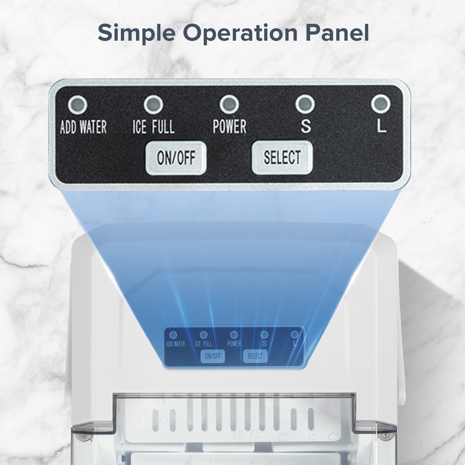 Due to the small size of the Ice Maker – 8.74*11.57*11.42in, it will not take too much space of your place. And with the durable handle on the top, you can easily move the machine or carry it out with you. The ice produced by our ice maker is bullet-shaped, and due to its characteristics, it will provide you with a long duration of use. And you can adjust the size of the ice cubes you like (S/L). The ice maker can provide appropriate ice in a short time, it can produce 9pcs bullet ice within 6-12mins and 26lbs in 24h. Also with the Noise reduction design, you can make ice in your daily time, It won’t bother your life. When the water tank is full of water, the only thing you need to do is press the “ON/OFF” button to start working, which can give you and your family the best and most convenient use experience. The ice Basket can not hold a low temperature environment for the ice, so to prevent the ice from melt and stick together, please use it immediately after the bullet ice is made or put it into the refrigerator. The machine includes a self-cleaning function, eliminating the need to clean the product after each use. However, to ensure long-term usability of the product, please manually clean it at appropriate intervals. Instructions: Plug in the power, press and hold the “ON/OFF” button on the control panel for more than 5 seconds to enter the automatic cleaning program, which takes about 30 minutes. During the cleaning, the “Ice Full” and “Add Water” indicators will flash alternately. After the cleaning, drain the water from the internal water tank through the drainage outlet at the bottom of the machine.