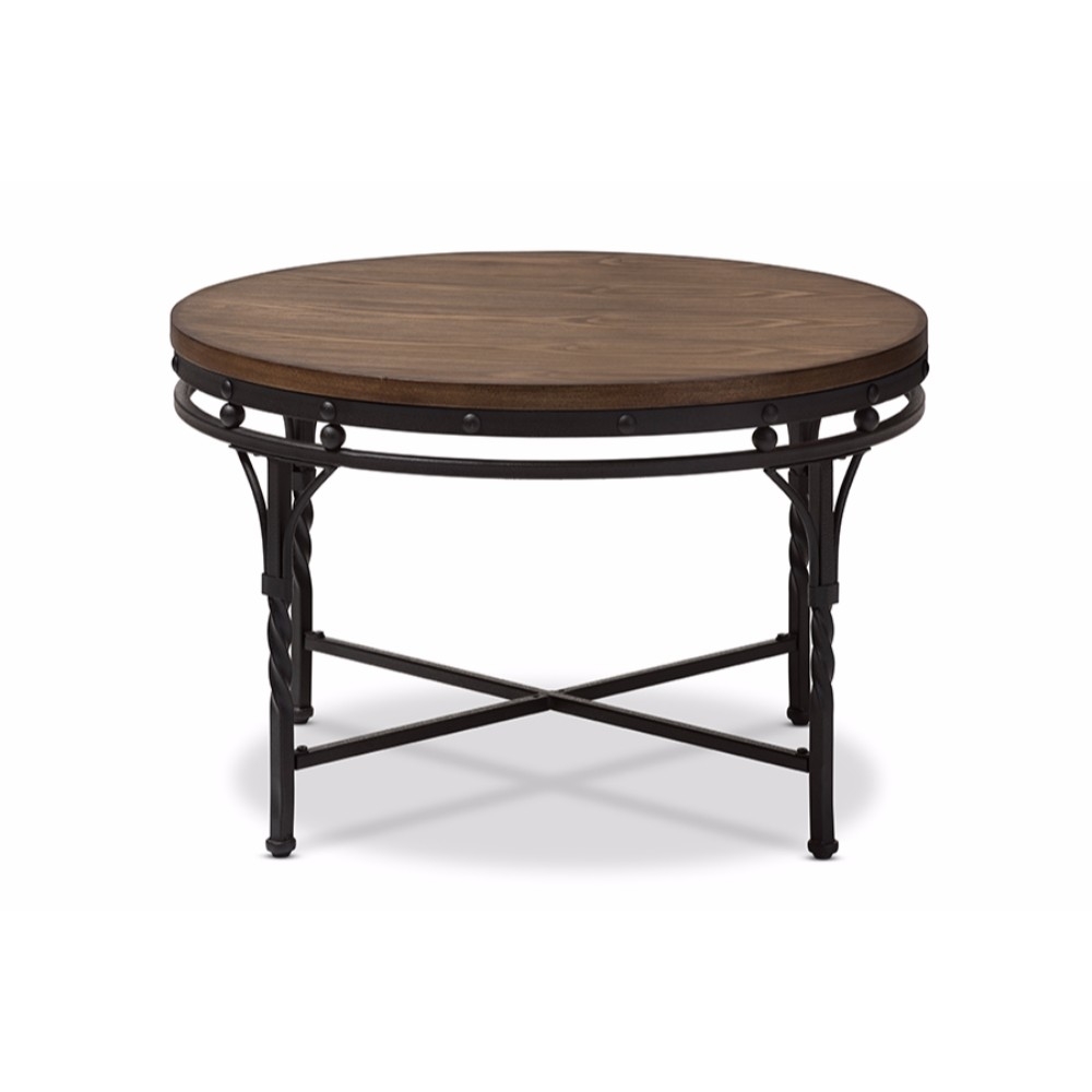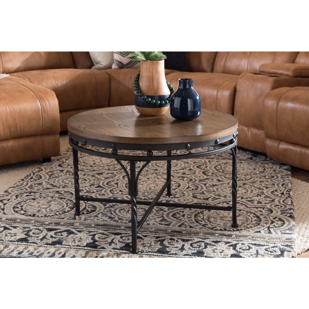 Finish: Antique Bronze Material: MDF / Metal Vintage industrial design round coffee table Antique bronze finishing solid iron metal frame MDF wood in distressed finishing Round shape Assembly required