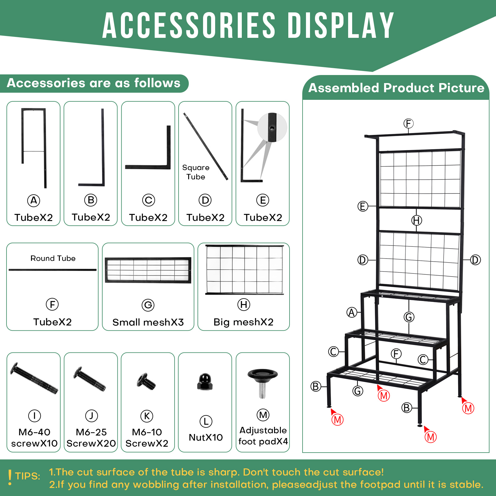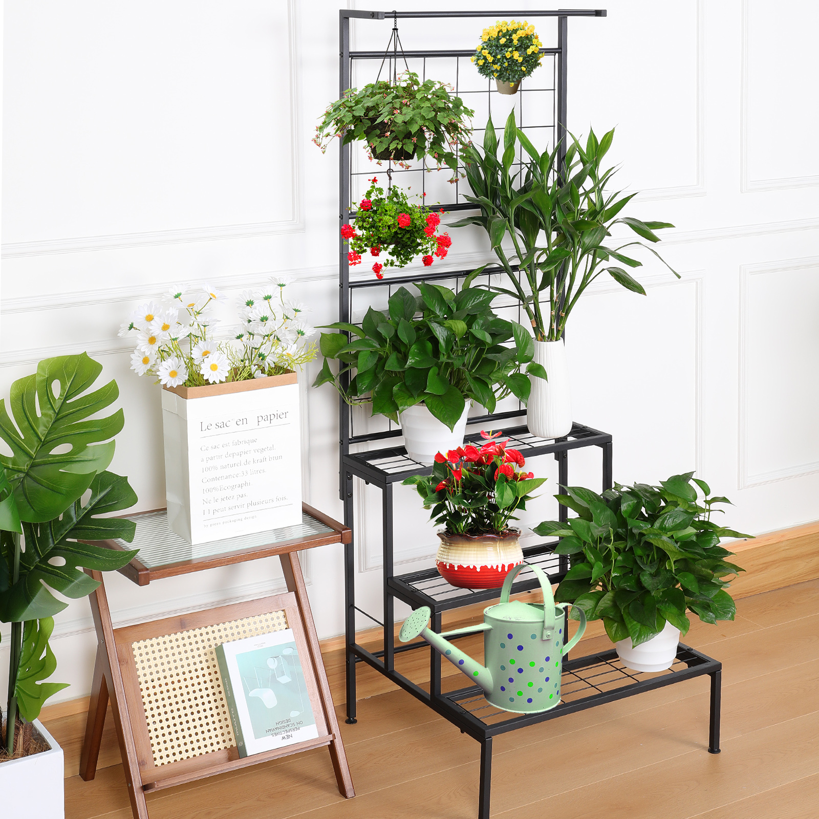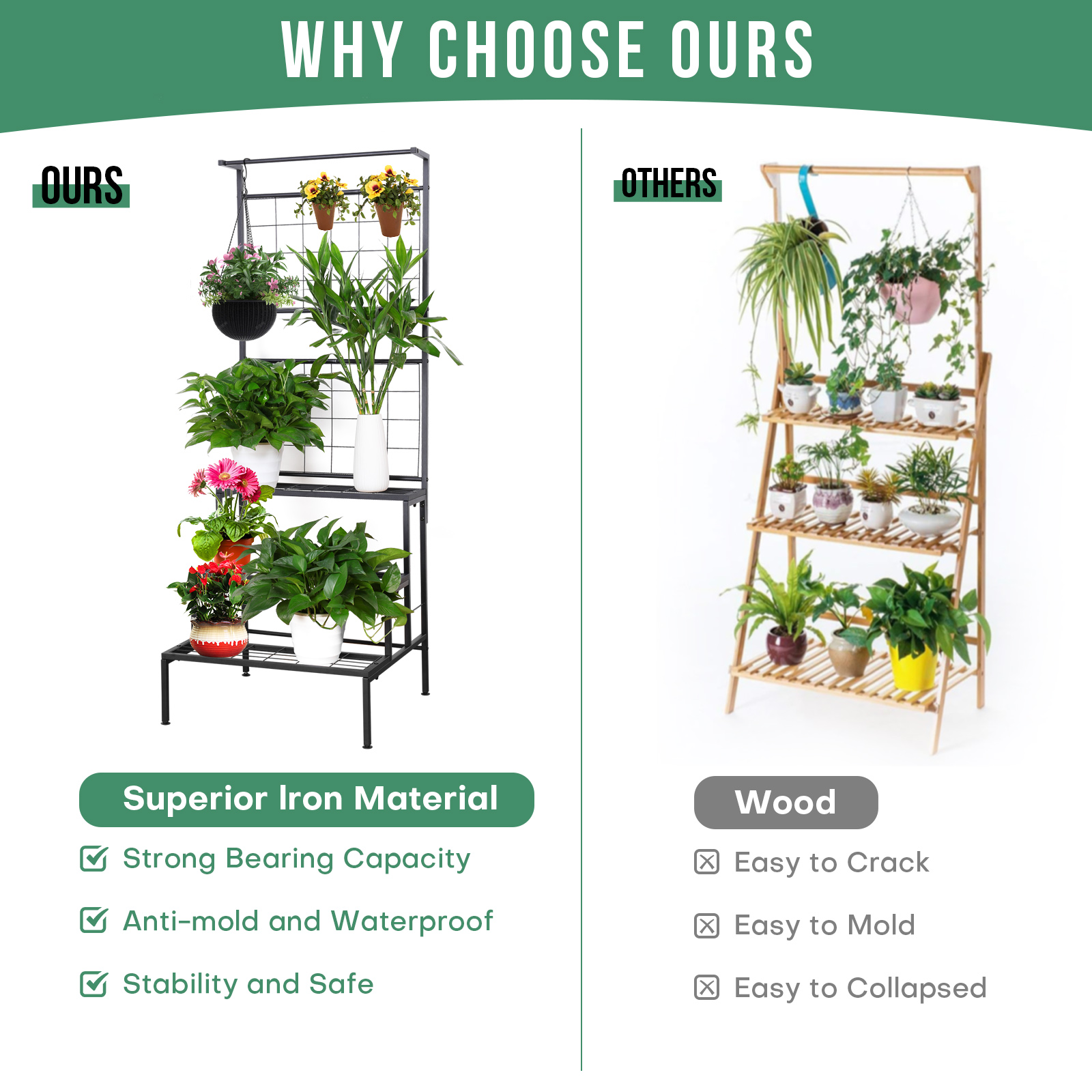 Autoez 3-Tier Black Iron Corner Hanging Plant Stand with Adjustable Feet Features: Large Capacity, Strong Bearing Capacity, Antimold, Waterproof, Stability, Safe, Elegant, Versatile, Easy to Assemble Humanized Design: The combination of iron frame and wire makes the plant rack sturdy and durable. Rear crossbar design prevents plants from falling while allowing adequate ventilation and light. Four adjustable feet protect your floor from scratches and enhance stability Large Capacity: Perfect for small spaces, this plant stand features three shelves for maximum storage. The upper shelf is ideal for plants, while the lower shelf can hold towels, kitchen utensils, shoes, books, or other items Nice Corner: Elegant shapes and colors complement your existing furniture. Suitable for decorating your living room, balcony, office, bedroom, study room, or garden Easy to Assemble: Installation is straightforward with included parts and detailed instructions to help you complete assembly quickly
