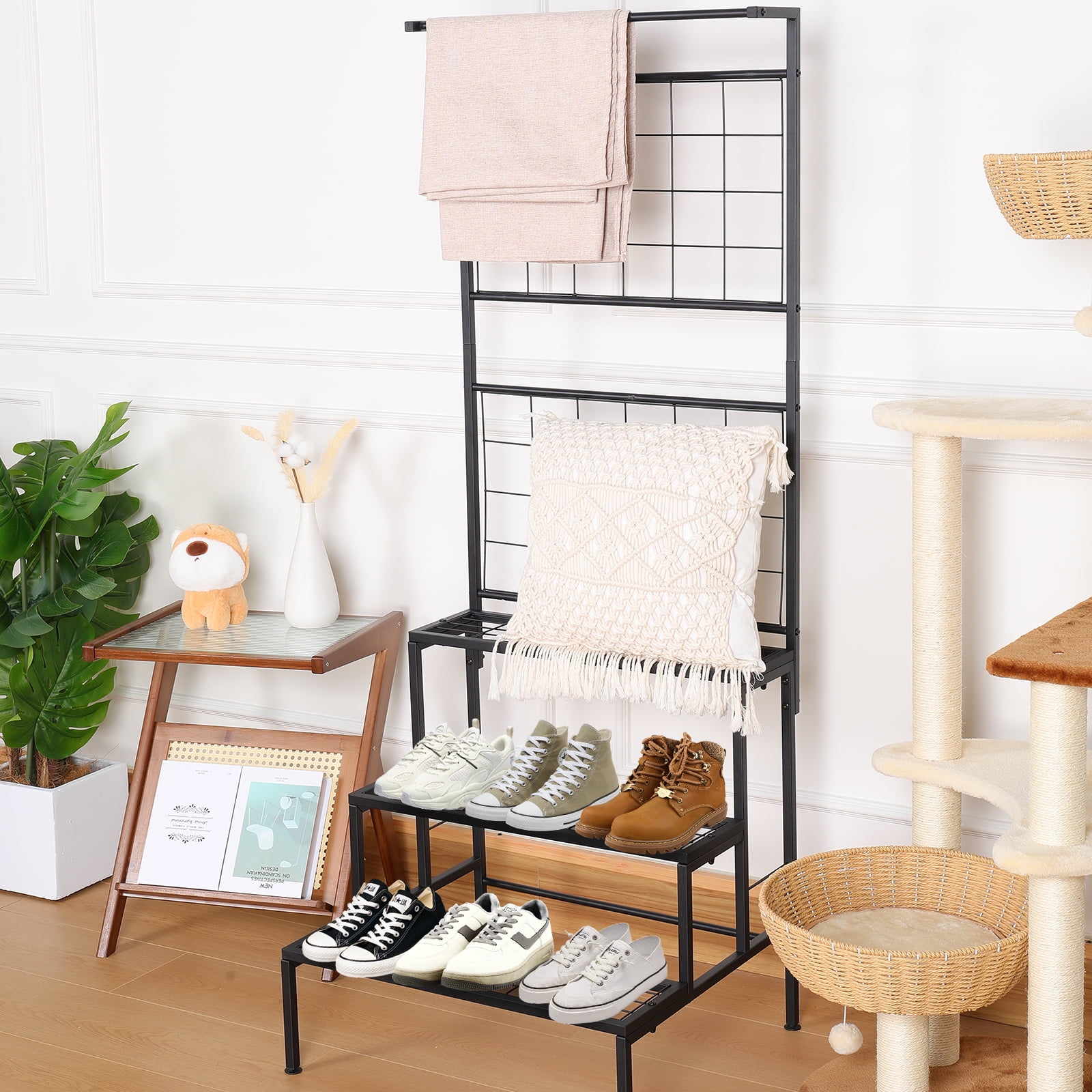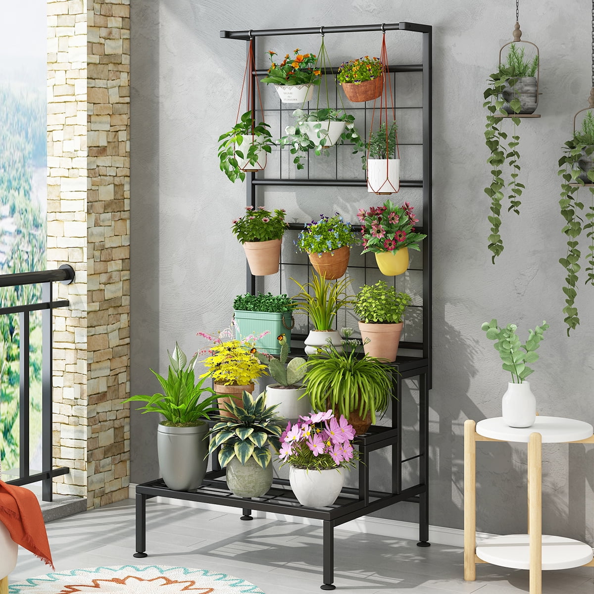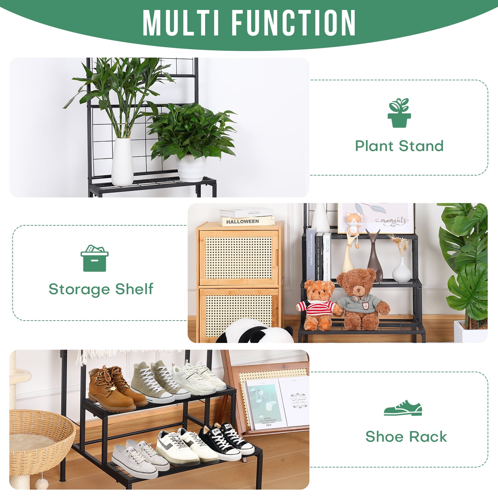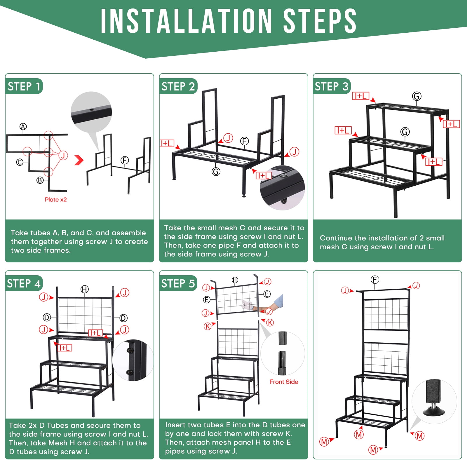 Autoez 3-Tier Black Iron Corner Hanging Plant Stand with Adjustable Feet Features: Large Capacity, Strong Bearing Capacity, Antimold, Waterproof, Stability, Safe, Elegant, Versatile, Easy to Assemble Humanized Design: The combination of iron frame and wire makes the plant rack sturdy and durable. Rear crossbar design prevents plants from falling while allowing adequate ventilation and light. Four adjustable feet protect your floor from scratches and enhance stability Large Capacity: Perfect for small spaces, this plant stand features three shelves for maximum storage. The upper shelf is ideal for plants, while the lower shelf can hold towels, kitchen utensils, shoes, books, or other items Nice Corner: Elegant shapes and colors complement your existing furniture. Suitable for decorating your living room, balcony, office, bedroom, study room, or garden Easy to Assemble: Installation is straightforward with included parts and detailed instructions to help you complete assembly quickly