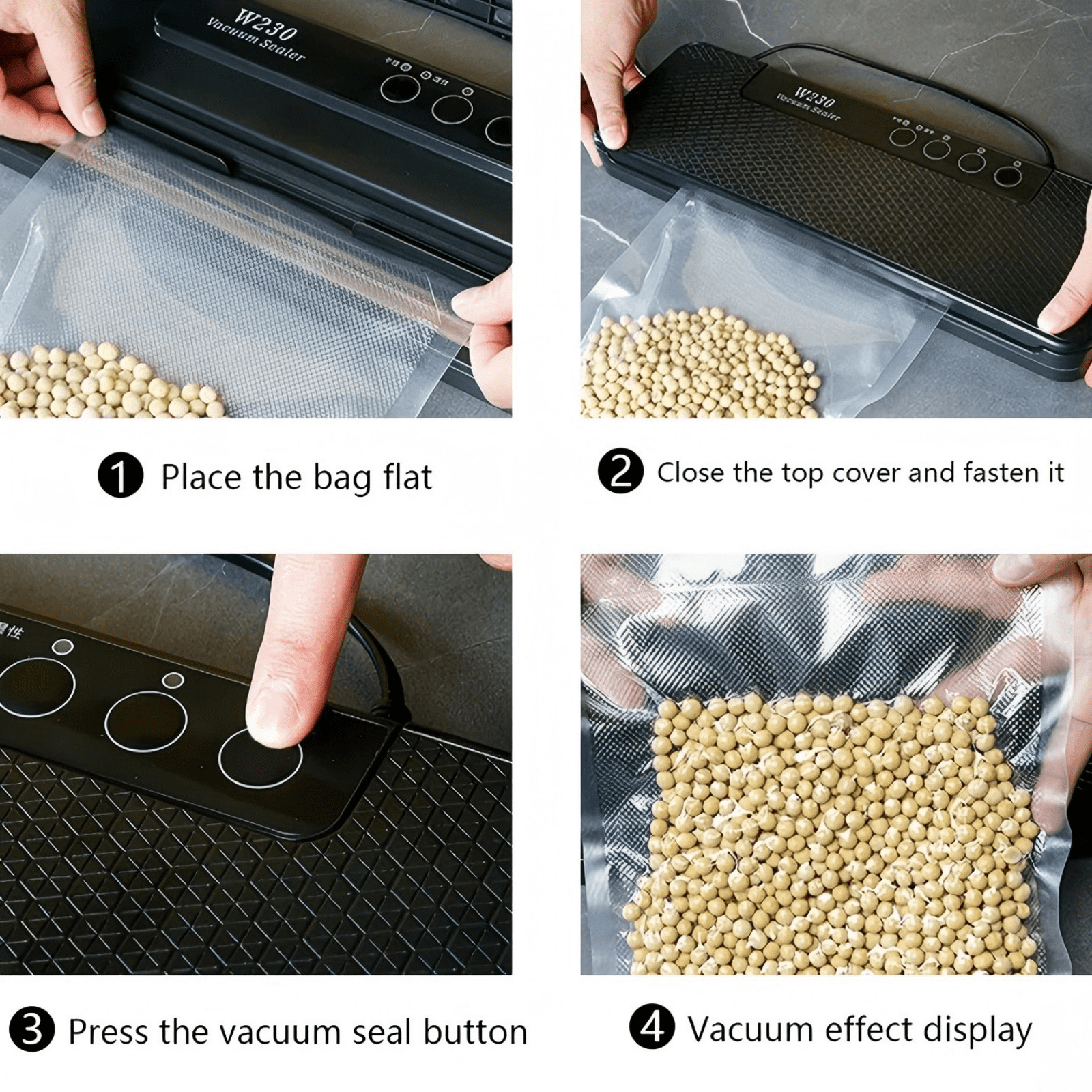 【Professional Vacuum Sealer】Food vacuum sealer only takes 8-10 seconds to complete the food vacuum sealing. Keeps food fresh 10X Longer Preservation than ordinary storage methods. A perfect solution for keeping food fresher and longer. 【Easy to Use】Our food sealer vacuum sealer adopts fully automatic one-button sealing machine operation, hands-free design, LED indicator light. It has 4 modes. Suitable for meat, seafood, fruits, vegetables, nuts, bread, jars, etc. Meet all your needs. Compact size and lightweight design, super easy for the beginner, especially elderly and children. Be a good partner in your family kitchen. 【Strong Suction & Quick Silent Working】Food vacuum sealer is equipped with a superior motor and is lab-tested to have 60 kpa powerful suction, can finish all procedures within 10 seconds, which could save your time greatly. The upgraded motor can control the decibel under 50db, and low noise will make the process more comfortable. 【Handle All Food Types】Multi-purpose vacuum sealing system can handle most of the preservation and storage troubles: ①Dry – for solid food like nuts, ②Wet – for wet food like meat and seafood, ③Pulse Vacuum – for soft food to keep their shape like bread, ④Manual Seal – for snack like cookies and crisps, ⑤VAC External Vacuum (hose included) – for jar/container/wine bottle/clothes bag to vacuum.